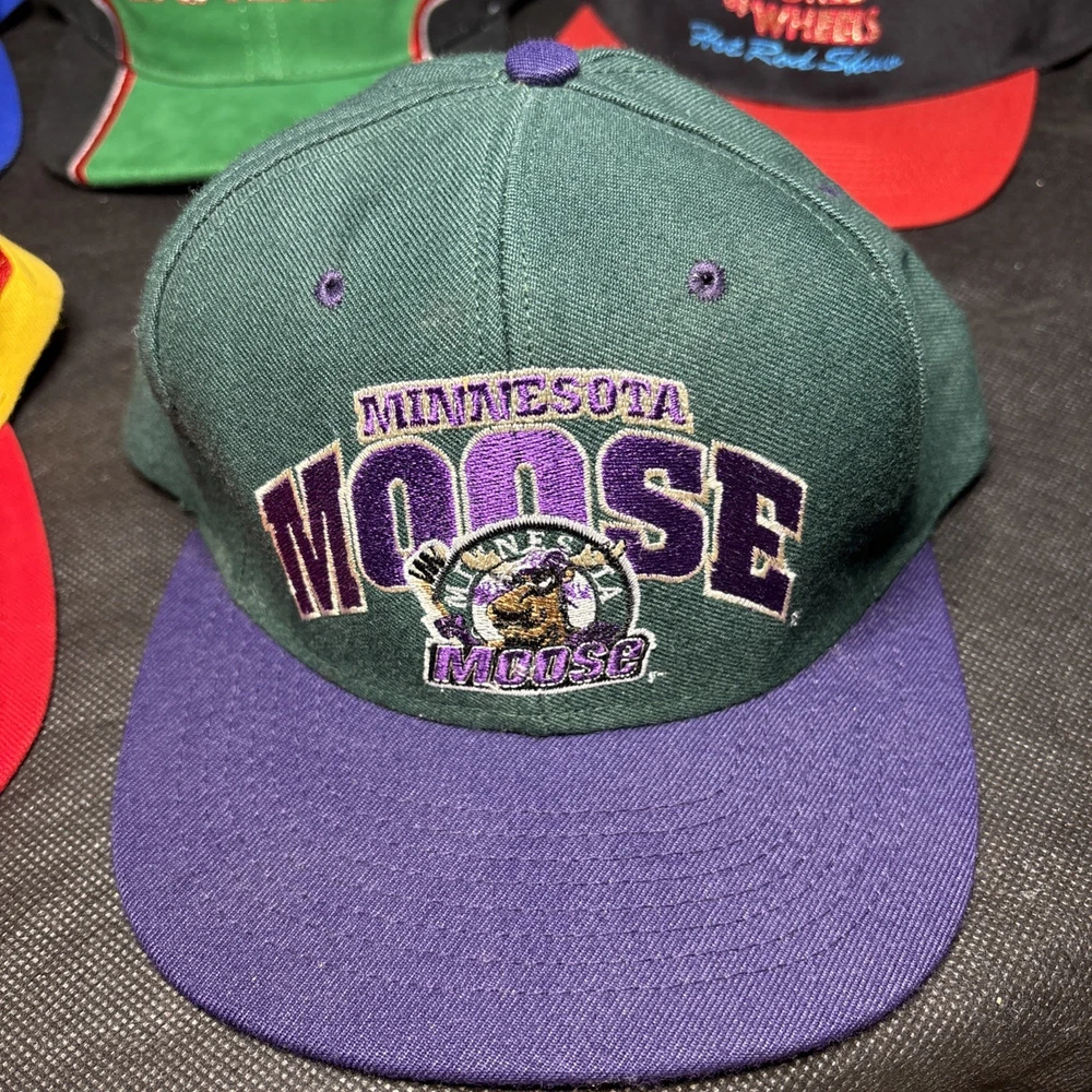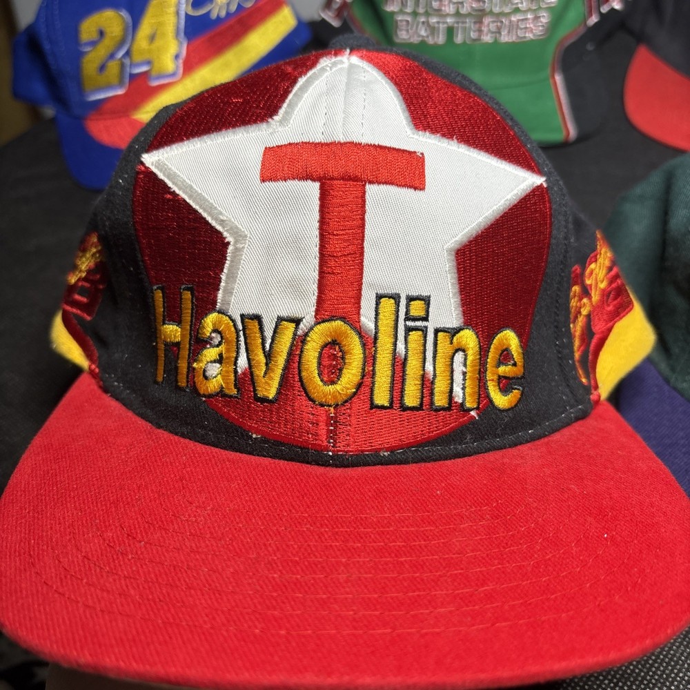 Lot of 5 vintage snapback hats featuring racing and sports designs. Includes Jeff Gordon Nutmeg Mills NASCAR hat, Bobby Labonte #18 Interstate Batteries cap, two Chase Authentics Havoline Xpress Lube racing hats, and a Minnesota Moose ice hockey snapback by Nutmeg Mills. Adjustable snapback and trucker styles. Good vintage condition with normal signs of wear.