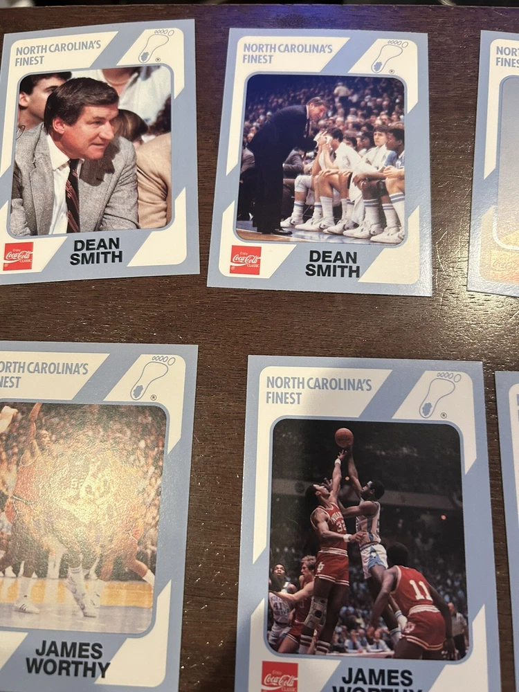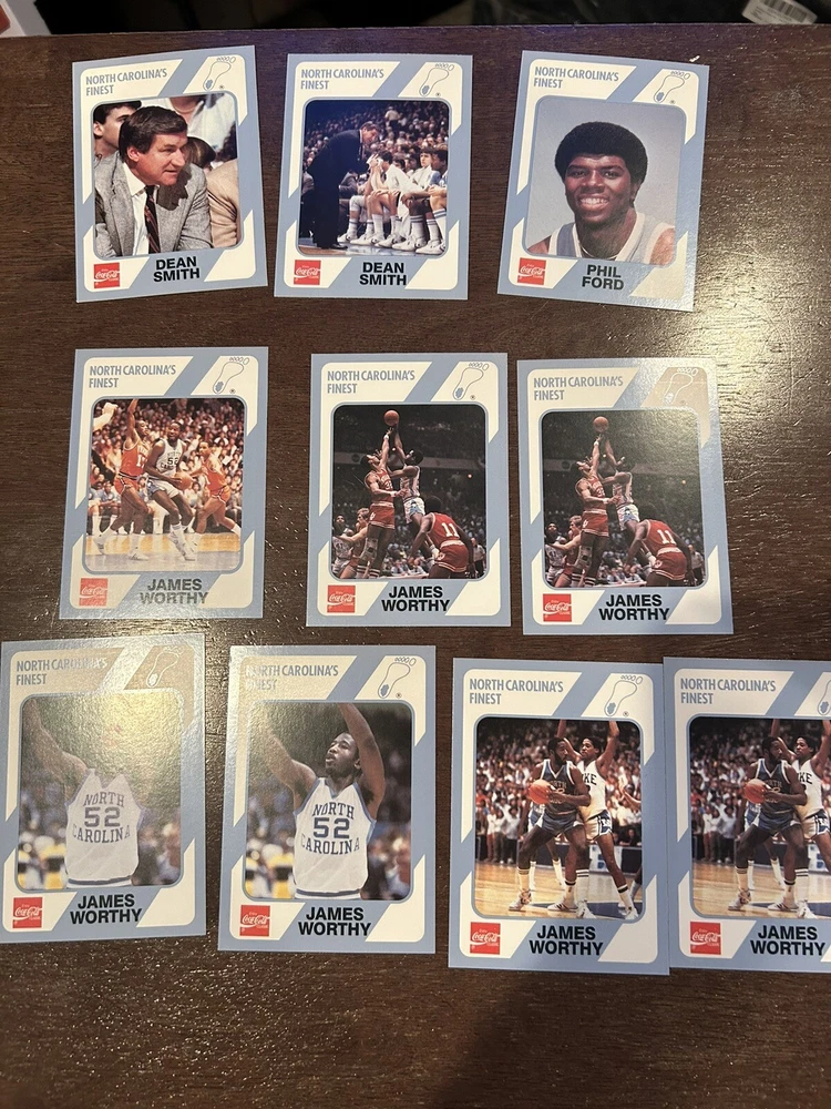 1989 Collegiate Collection Coca Cola North Carolina’s Finest basketball cards - 56 cards Cards are in near mint condition Includes Dean Smith - 2 cards Phil Ford - 2 cards James Worthy - 7 cards Sam Perkins - 2 cards Bobby Jones - 3 cards Billy Cunningham Robert McAdoo - 2 cards J.R. Reid And many more