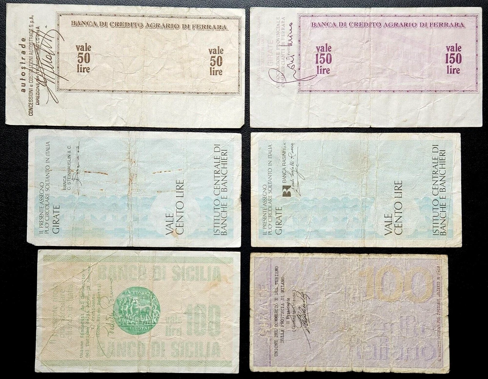 Item(s) Description: Lot of 6x Italy Banknotes / Cashier's Cheques - 1976 & 1977 FREE Combined Shipping +++ PLEASE LOOK AT THE PICTURES AND JUDGE THE CONDITION BEFORE BIDDING+++ HAPPY BIDDING AND PLEASE LEAVE FEEDBACK CHECK OUT OUR OTHER LISTINGS FOR GREAT DEALS Please note that all orders, or combined orders, UNDER $100 will be shipped via regular letter mail for $3.89 within Canada and $20 international (we do not ship to Russia or China) Attention U.S. Buyers: Good old Canada Post no longer allows us to send coins via regular letter mail. They want everything to be sent as a packet, hence the cost of $9.99, please realize we have no control over this. Please take advantage of our combined shipping All orders, or combined orders, of $100 and over will be shipped with tracking for $17.99 in Canada, $19.99 in t he USA, and $49.99 Worldwide. All larger sized items (such as RCM sets), or combined orders over 300 Grams, will be shipped as a parcel with tracking for $18.99 in Canada and $24.99 in the USA, and $49.99 Worldwide