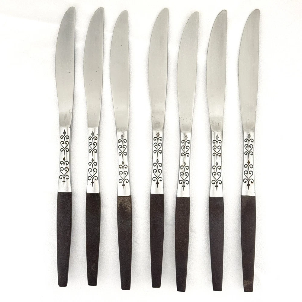Offering a set of 7 Interpur INR2 dinner knives 8 7/8” long, mid-century modern style, a discontinued pattern made in Japan. The brown synthetic handles are sturdy and have cracks, as shown in the close-up photos. The stainless steel is in good condition, no chips, dents, or disposal damage. There are surface scratches, some pitting, and wear consistent with normal use. Please view the photos for details and condition. Measurements and photo colors are approximate. For extra protection your items will be packed in plastic sleeves and shipped in a box. Shipping is your choice of USPS Ground Advantage or USPS Flat Rate Priority at the rate determined by eBay. Follow your item's delivery progress with the USPS website Tracking Tool. Terms of Sale: Photos are of the actual item you will receive and sold "as is". Placing an order is your agreement that you know what you are buying, have viewed the photos and find the condition acceptable. Use eBay Messages to contact me for questions or concerns about your order. Please inspect your items upon arrival and contact me if there are any problems. Free returns within 30 days after delivery.