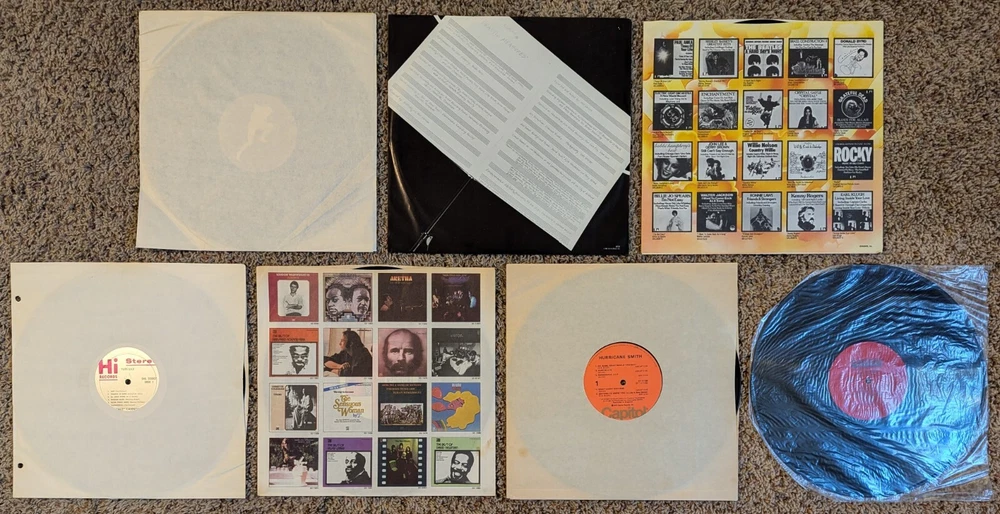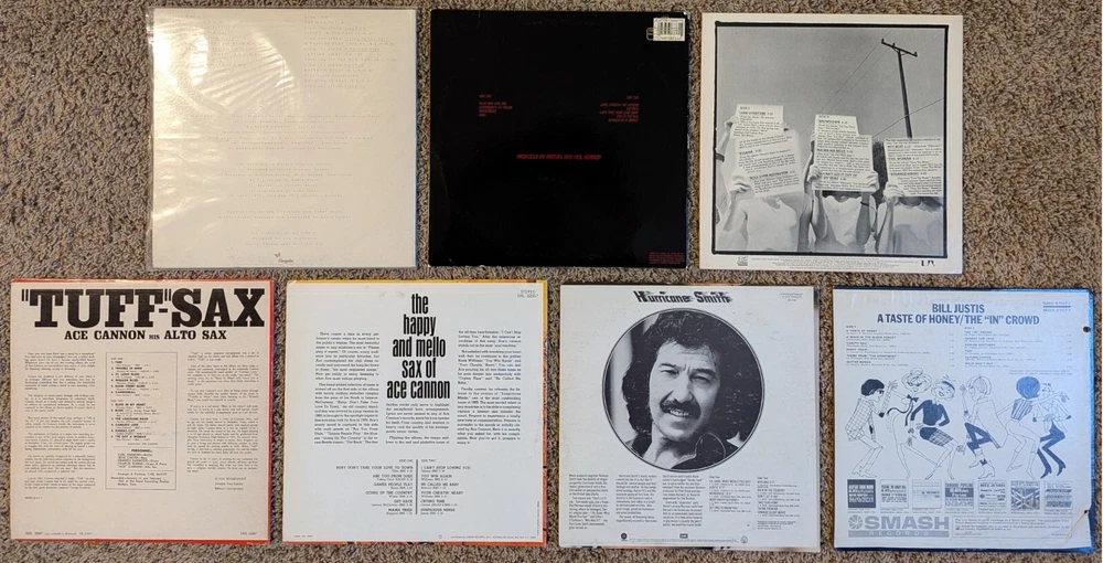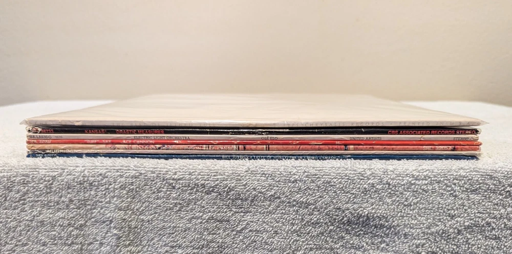 This listing is for the following 7 vinyl LP albums (12" records, 33 RPM): Jethro Tull - M.U. - The Best of Jethro Tull (1975, CHR 1078) Kansas - Drastic Measures (1983, QZ 38733) Electric Light Orchestra - Olé ELO (1976, UA-LA630-G) Ace Cannon - "Tuff"-Sax (1962, SHL 32007) Ace Cannon - The Happy and Mello Sax of Ace Cannon ( 91969, SHL 32057) Hurricane Smith - Hurricane Smith *Self Titled* (1972, ST-11139) Bill Justis - A Taste of Honey/The In Crowd (1966, SRS 67077) Records are in nice condition with no warping and include jackets and inner sleeves. Jethro Tull album includes protective plastic outer sleeve and 36-page 25th anniversary programme booklet. Jacket for Bill Justis has holes punched in the left side.