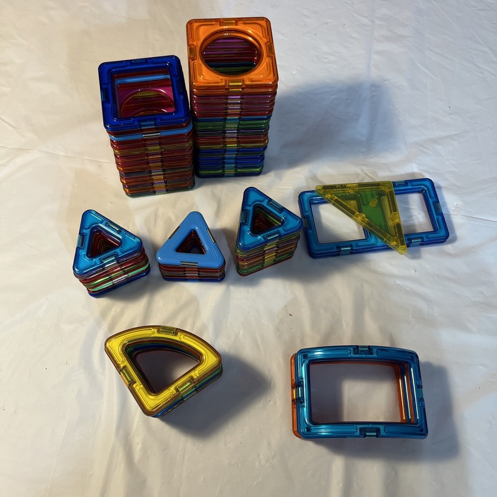 The lot of Magformers Magna Tiles includes various magnetic building shapes such as squares, triangles, and arches, perfect for constructing creative and intricate designs. These magnetic building toys are ideal for children aged 5 and up, promoting learning in construction, architecture, and STEM. Without a specific character family but with a focus on education, these Magformers tiles are a great addition to any building toy collection for endless fun and creativity. 75 pieces