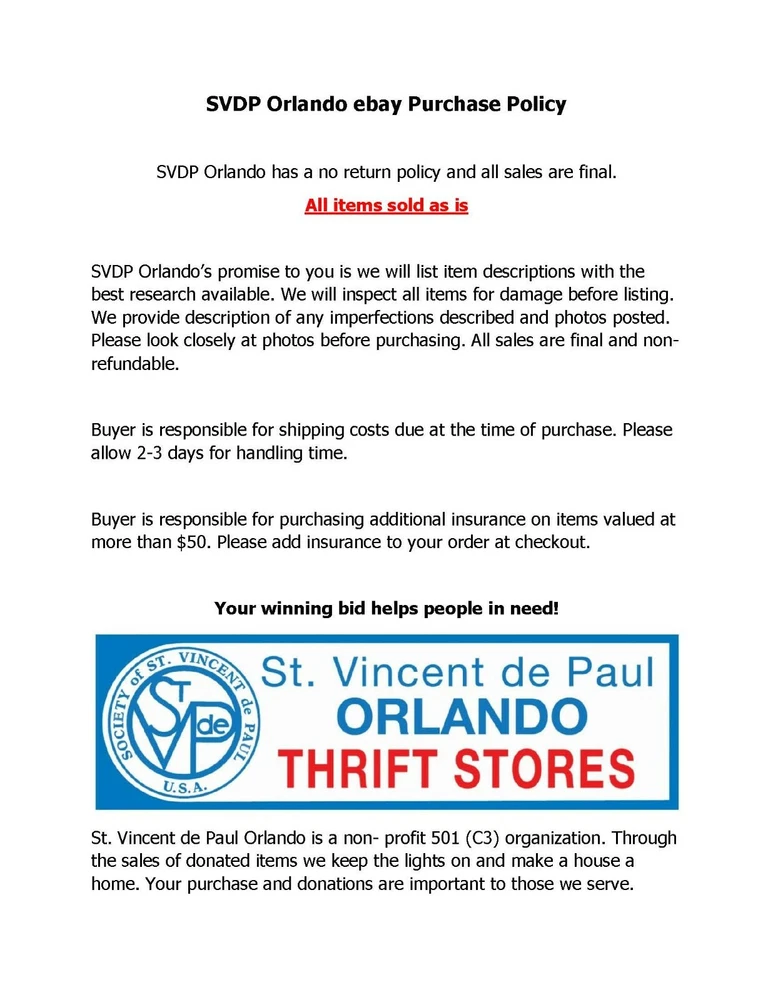 Lot of O'Well Porcelain Figurines for Christmas Villages They are all O'Well. SVDP Orlando ebay Purchase Policy SVDP Orlando has a no return policy and all sales are final. All items sold as is SVDP Orlando's promise to you is we will list item descriptions with the best research available. We will inspect all items for damage before listing. We provide description of any imperfections described and photos posted. Please look closely at photos before purchasing. All sales are final and non-refundable. Buyer is responsible for shipping costs due at the time of purchase. Please allow 2-3 days for handling time. Buyer is responsible for purchasing additional insurance on items valued at more than $50. Please add insurance to your order at checkout. Your winning bid helps people in need! St. Vincent de Paul Orlando is a non- profit 501 (C3) organization. Through the sales of donated items we keep the lights on and make a house a home. Your purchase and donations are important to those we serve.