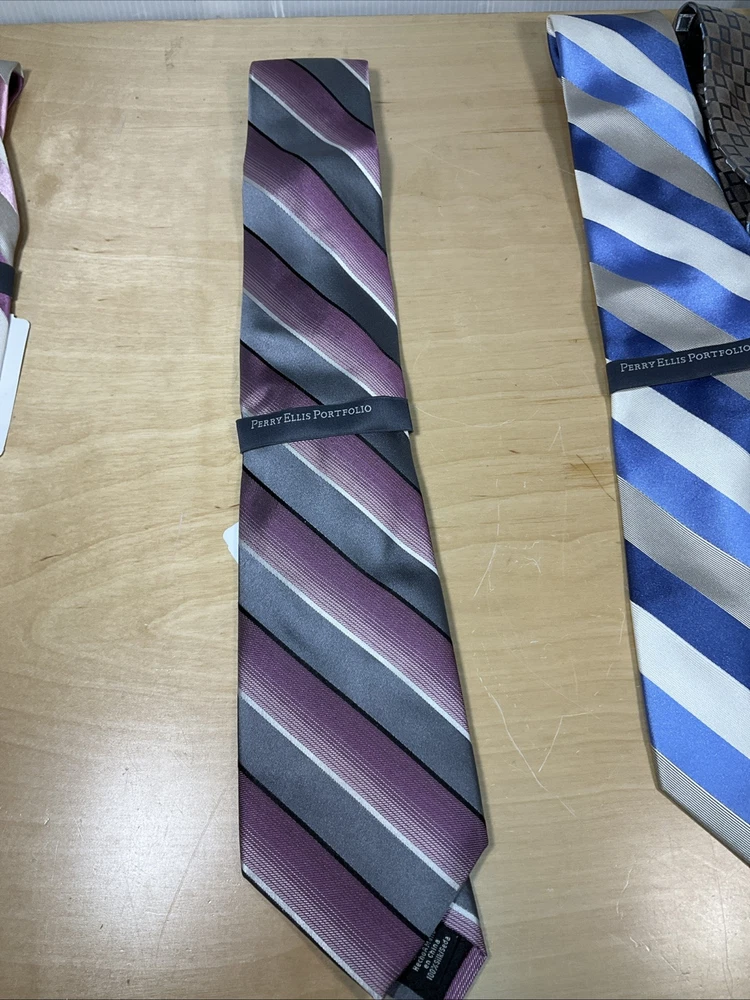 7 New ties with tags. 100% silk ties. 4 Perry Ellis Portfolio, 1 Kenneth Cole Reaction, 1 Alfani and 1 Club Room. No defects or damage. Great variety of colors. Over $300 retail in ties.