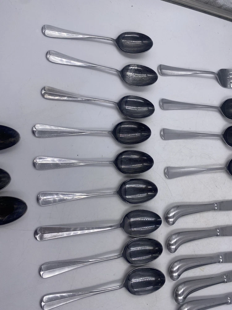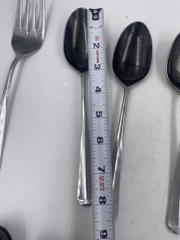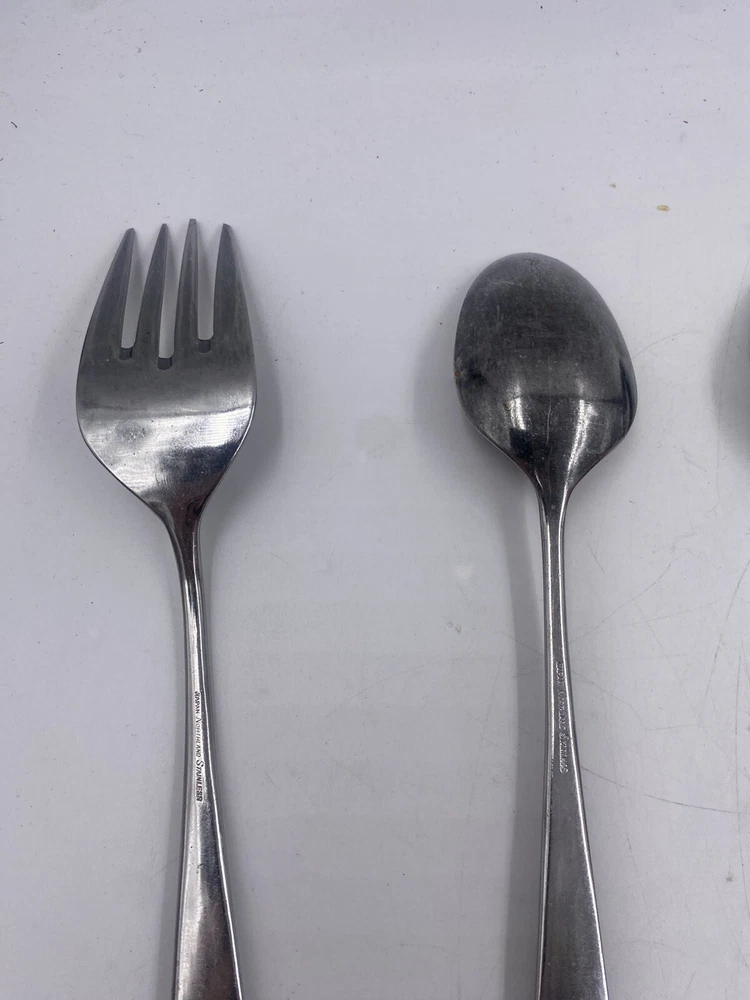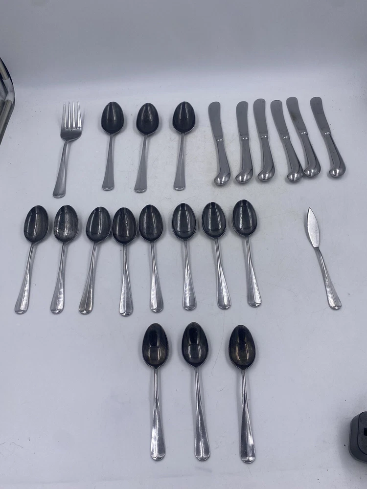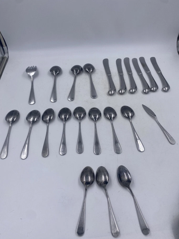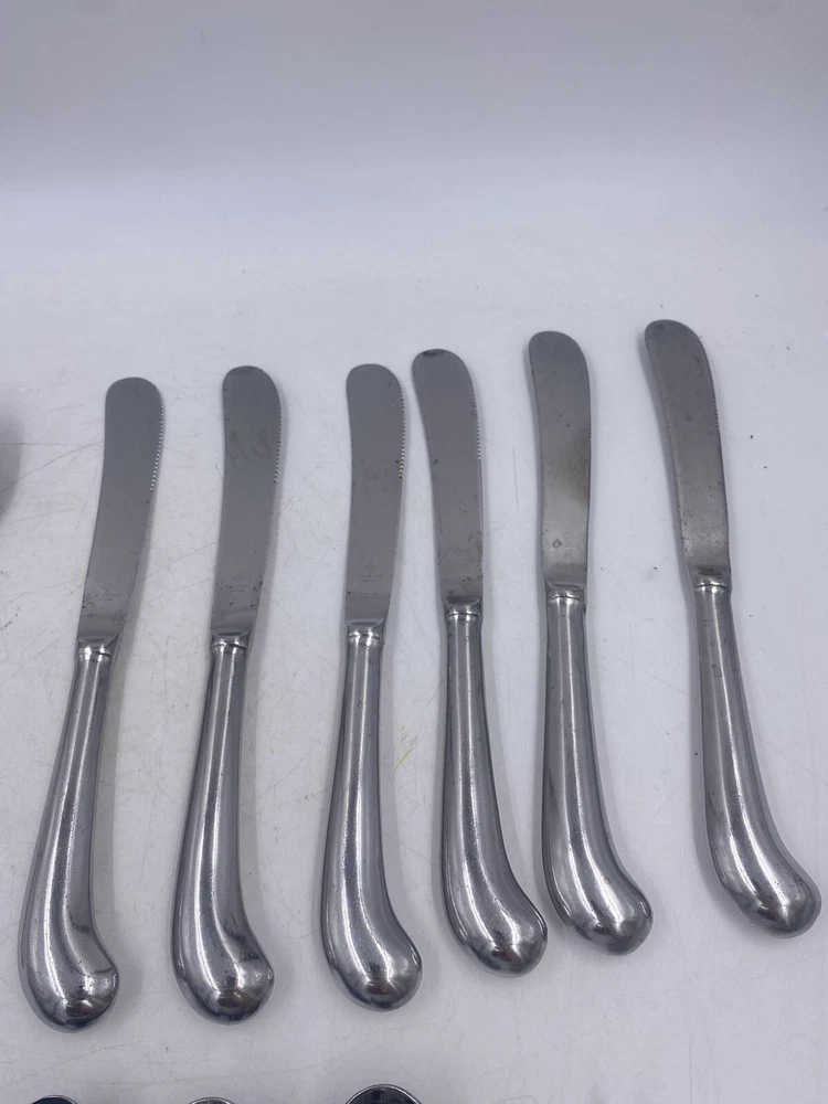 This is a mixed lot of 22 total pieces of vintage Japan Northland stainless pieces. It includes 6 table knives, 8 tablespoons, 3 teaspoons, 1 Butter knife, 1 large serving fork and 3 large serving spoons. All of these pieces have scratches, scuffs, markings and or discoloration. The spoons have a black look to the insides as shown. All of these pieces need a good clean up to bring them back to original beauty. You get the actual items pictured so please look at all photos and ask any questions before purchase.