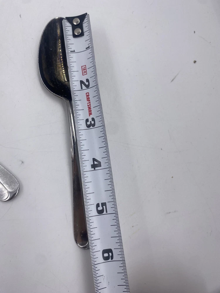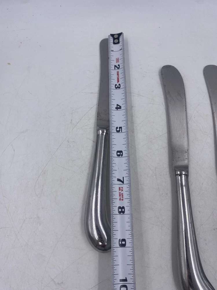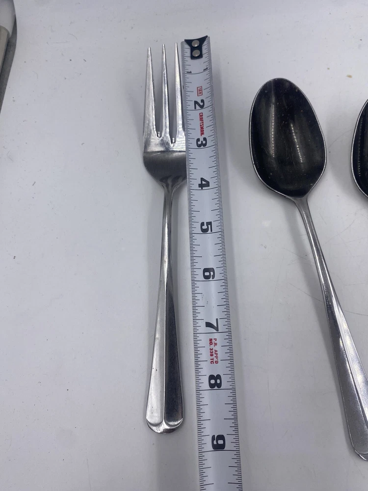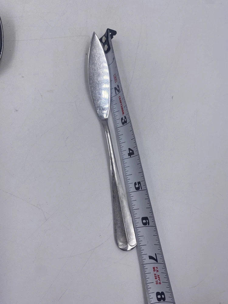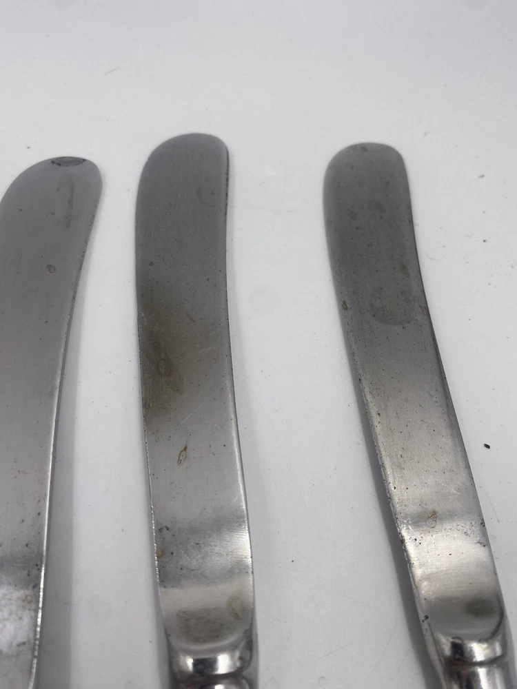 This is a mixed lot of 22 total pieces of vintage Japan Northland stainless pieces. It includes 6 table knives, 8 tablespoons, 3 teaspoons, 1 Butter knife, 1 large serving fork and 3 large serving spoons. All of these pieces have scratches, scuffs, markings and or discoloration. The spoons have a black look to the insides as shown. All of these pieces need a good clean up to bring them back to original beauty. You get the actual items pictured so please look at all photos and ask any questions before purchase.