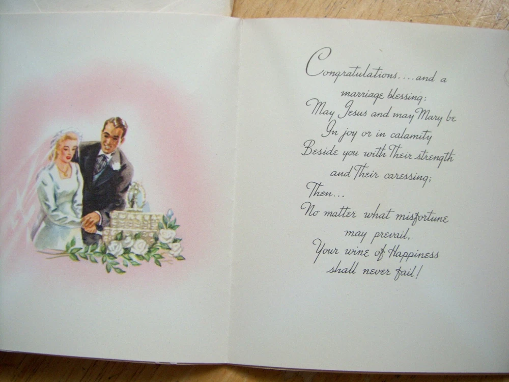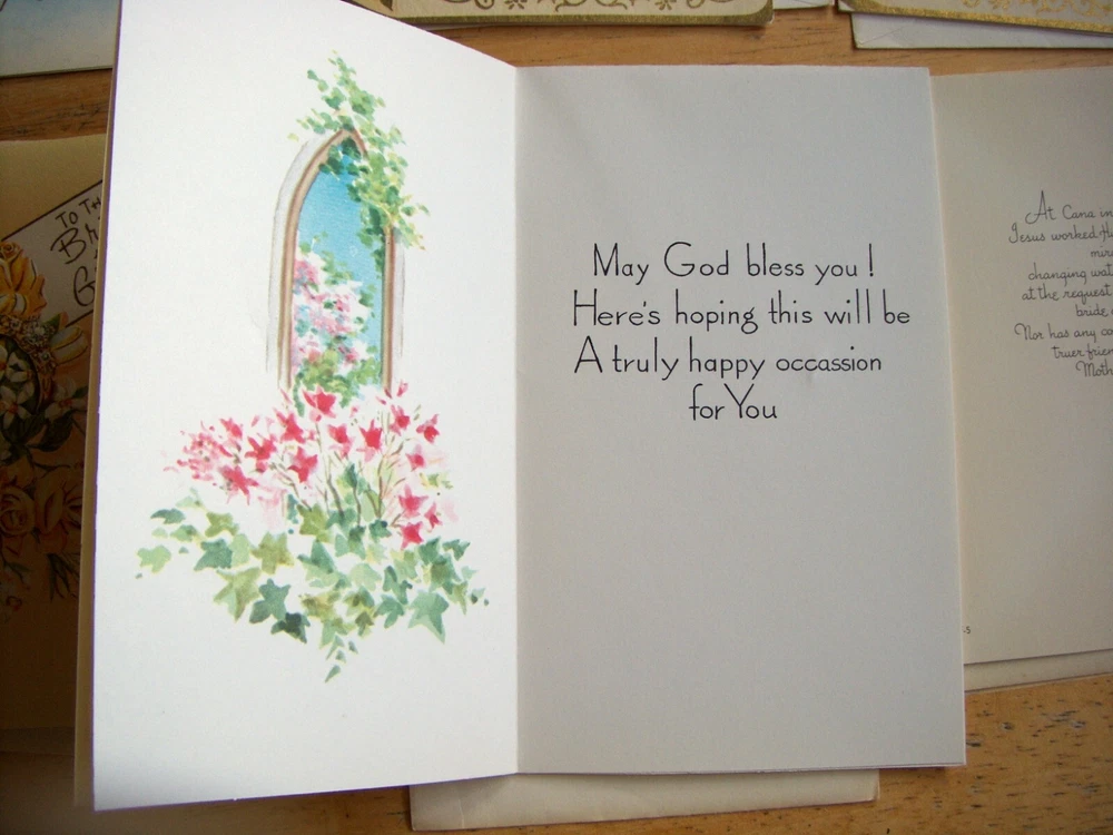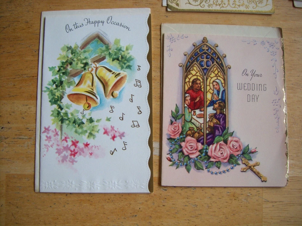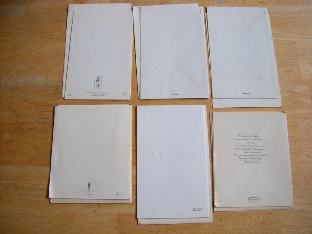 Cards measure between 5 1/2" - 6 1/2" high x 4 1/8" - 4 1/2" wide. Three cards have no Manufacturer name. The other three are from religious organizations. One card has a 1955 date on the back. The remainder are also from the same time frame.