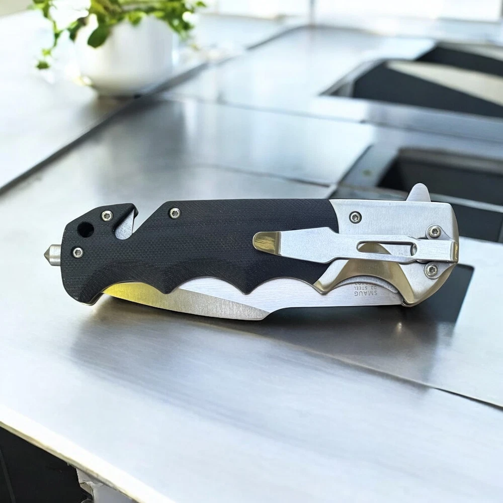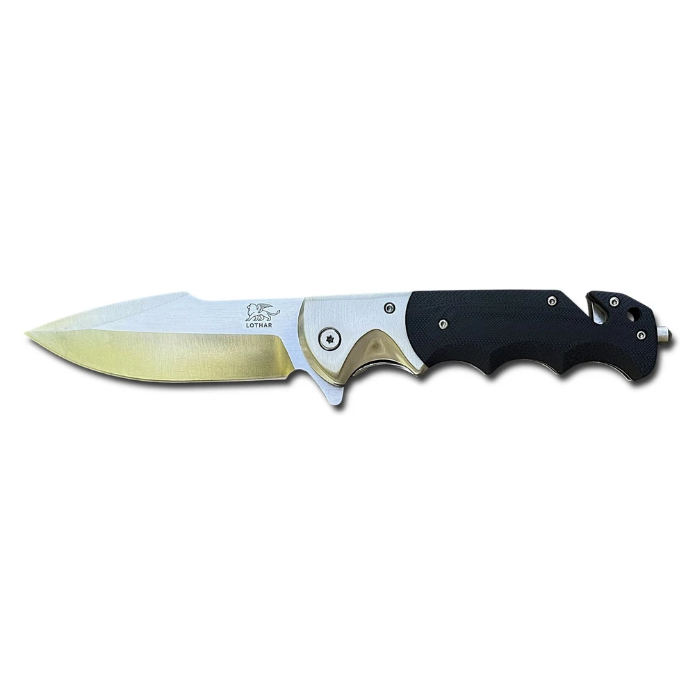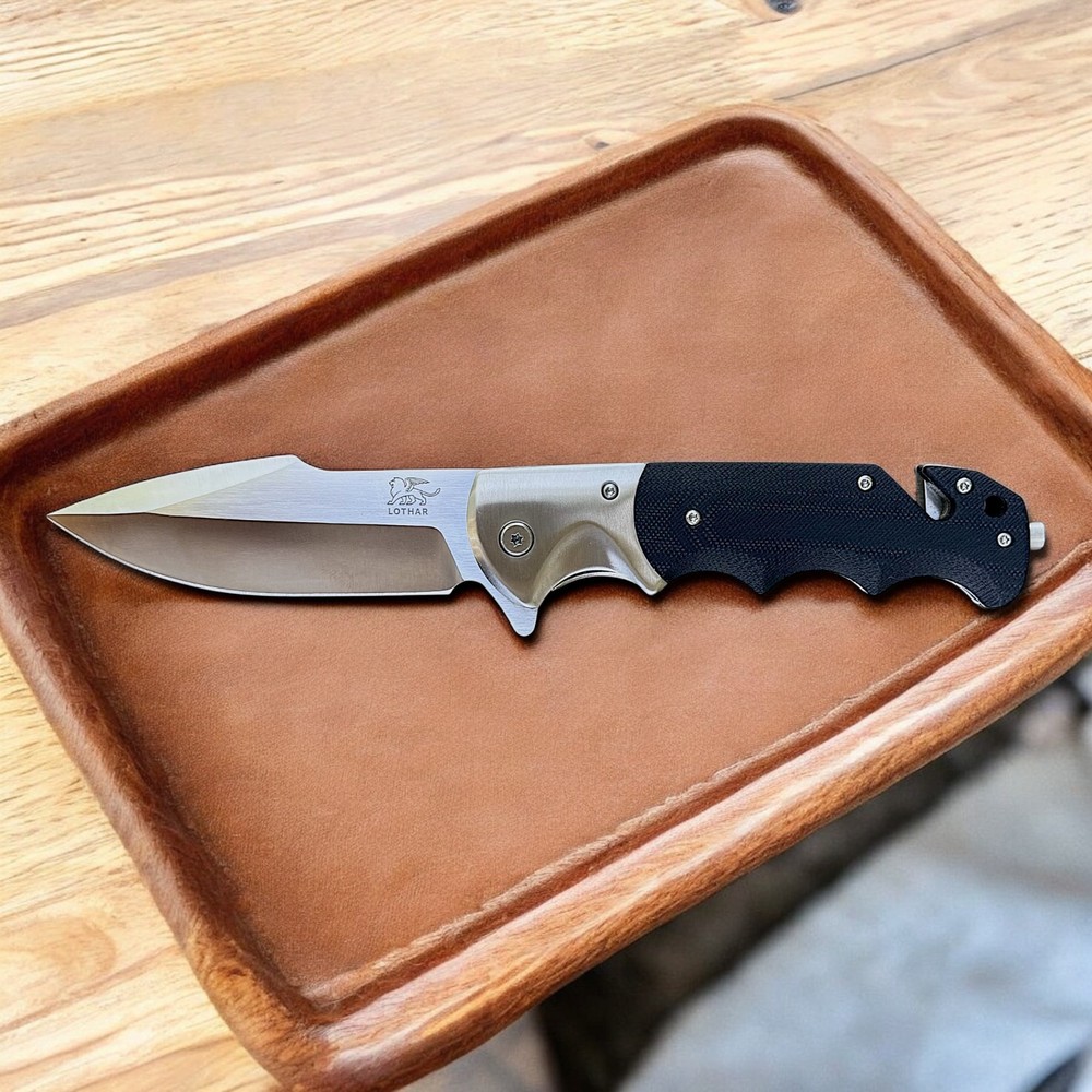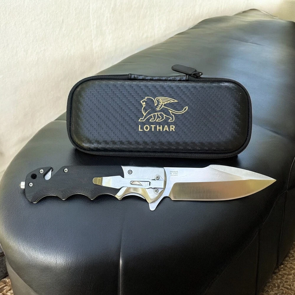 🔥 Built for performance, ready for anything — the Lothar “Smaug” folding knife is a tactical beast crafted with precision and purpose. This robust folder features a razor-sharp D2 steel blade that delivers exceptional edge retention and strength for demanding tasks. The smooth pivot system combined with a secure liner lock ensures confident deployment and solid lock-up, without the need for springs. Whether you're on the job, in the wild, or just everyday carry — this knife brings elite reliability and function. The ergonomic black G10 handle offers a grippy, contoured feel with finger grooves for max control. Integrated into the handle is a glass breaker and seatbelt cutter , turning this knife into a true emergency tool — not just a blade. 🗡️ Key Features: D2 steel drop point blade with sharp swedge and excellent edge retention Manual pivot system with flipper tab for controlled, responsive opening Rock-solid liner lock for safe, one-hand use Textured G10 handle with ergonomic finger grooves Built-in glass breaker and seatbelt cutter for emergency response Reversible deep-carry pocket clip Includes protective zippered case and adjustment tool Add the Lothar Smaug to your EDC lineup and be ready for anything. Disclaimer: Buyer must be 18+ and comply with all local, state, and federal laws.
