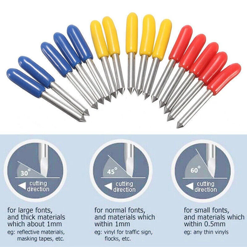 Product Description Feature -Application: ideal for Roland and most domestic and imported plotter -Long life span -Resistance, high hardness. -Blades is imported stainless steel, through the grinding polishing processing, high precision, good lettering quality. -Carbide tip with higher hardness , higher hardness, greater strength, tip more sharper, cutting plotter lettering faster. Specifcations Made of Aluminum alloy (surface oxidation), Tungsten steel(blade) Plotter Holder Size: 45*29 *11mm Handle diameter: 2mm, Overall Length: 23.5mm, Tip diameter: 1.0mm 3 Angles: 30° (Blue), 45°(Red), 60°(Yellow), 5pcs for each angles Package Content 5pcs x 30° blades 5pcs x 45° blades 5pcs x 60° blades 1pc x cutting plotter holder Note - Please allow minor errors due to manual measurement. Thanks for your understanding. - Monitors are not calibrated same, item colour displayed in photos may be showing slightly different from the real object. Please take the real one as standard. Shipping 1. We offer free shipping service. 2. Please be aware of this note before purchasing: All items will be shipped on next day after clear payment is received, usually 2 handling days included. 3. According to our experience, items usually arrives in 10-15 working days after being sent. Of course there are always uncertainties during shipping. 4. Standing behind our customers, we will take responsibility for the quality and delivery time, please kindly don't leave negative or neutral feedback without further communication. Returns 1. We offer money back guarantee service. 2. If you are not 100% satisfied with your purchase, you can return the product and get a full refund or exchange the product for another one, be it similar or not. 3. Any product you return must be in the same condition you received it and in the original packaging. 4. Please keep the receipt. Please send returns only by registered mail. 5. If you have not received the item, please wait a maximum of 20 days and let us know within 7 days. Please contact us before return, we will give you the return address. Contact Us If you have any questions please feel free to contact us. Working Hours: Monday to Friday Note: Please only use the eBay messaging system instead of email. Pink_Arrow2020 All Rights Reserved.
