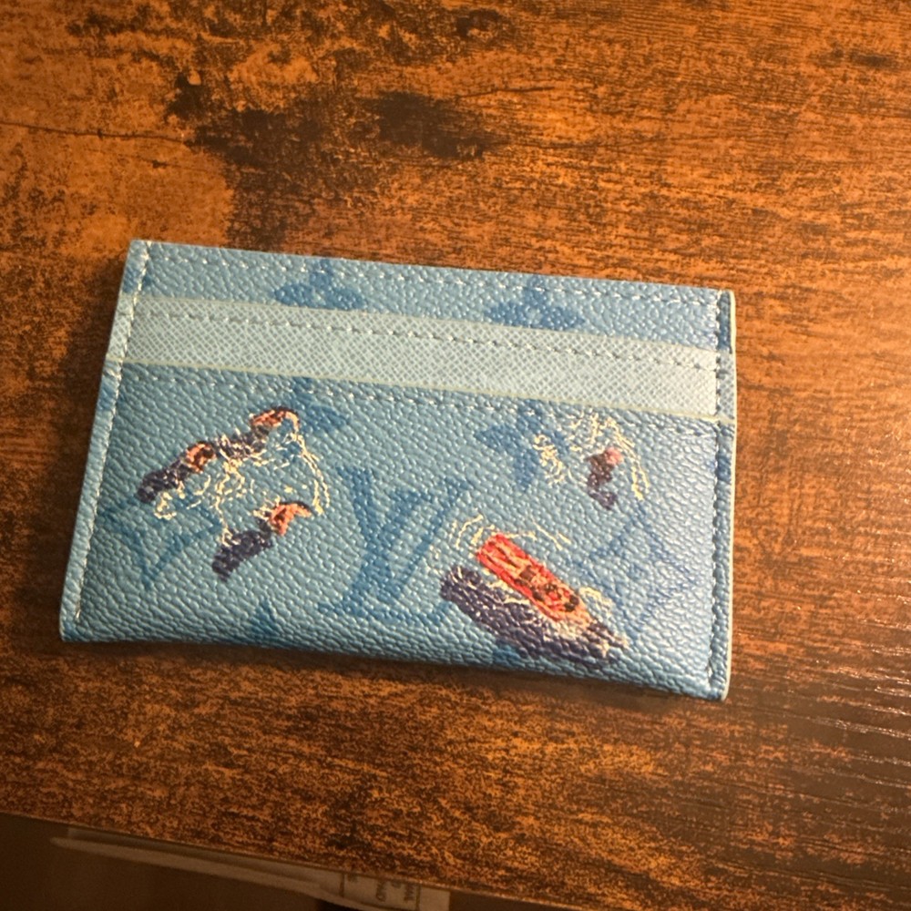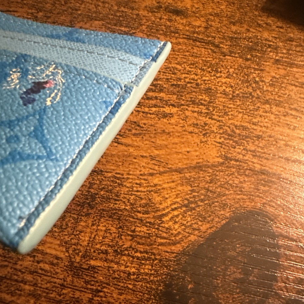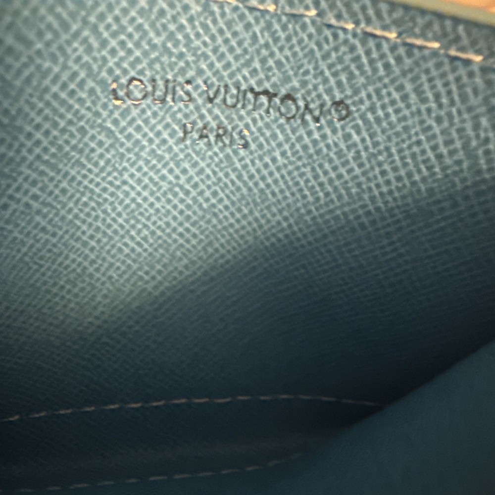 The Louis Vuitton Blue Card Holder Wallet features a classic logo print design, perfect for the modern man. Made from high-quality leather, this stylish wallet is ideal for storing your credit cards securely. The sleek blue color adds a touch of sophistication to any outfit, making it a must-have accessory for any fashion-conscious individual. With its logo accents and practical card holder design, this Louis Vuitton wallet combines style and functionality in one elegant piece.