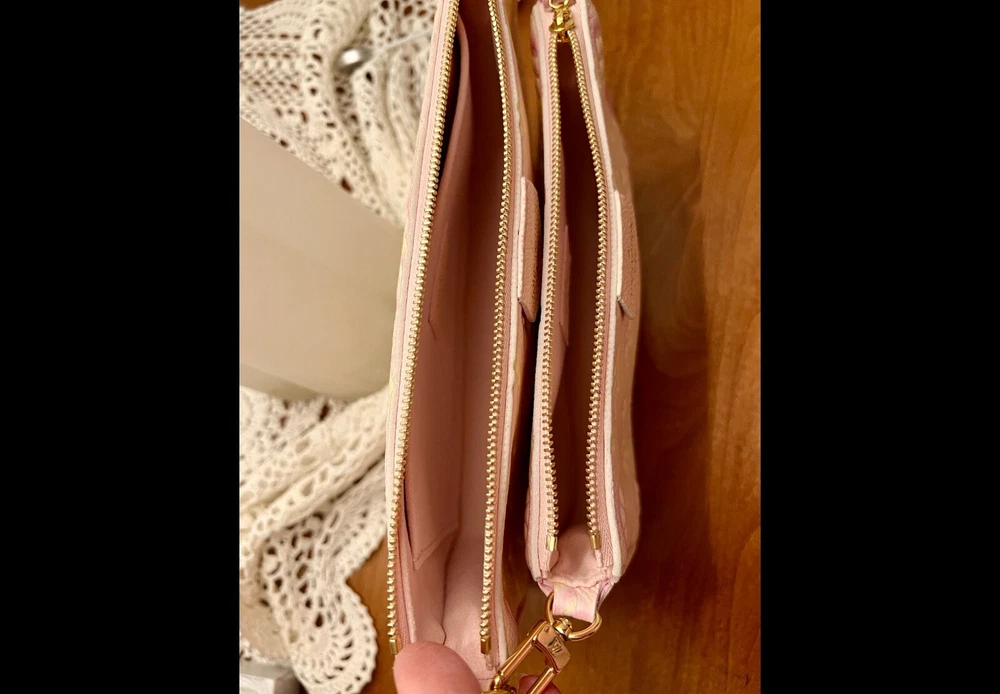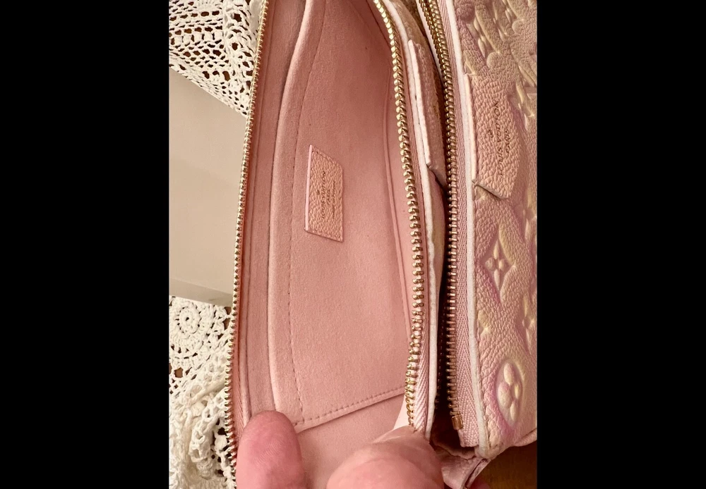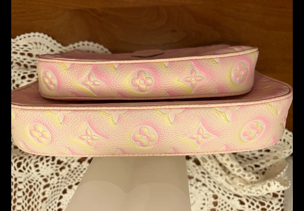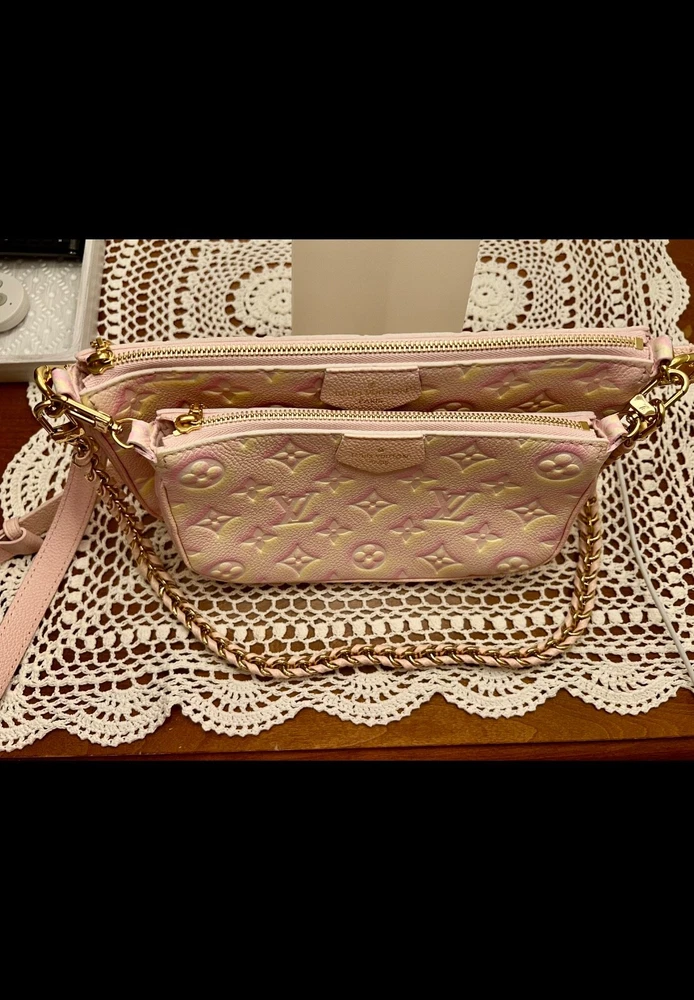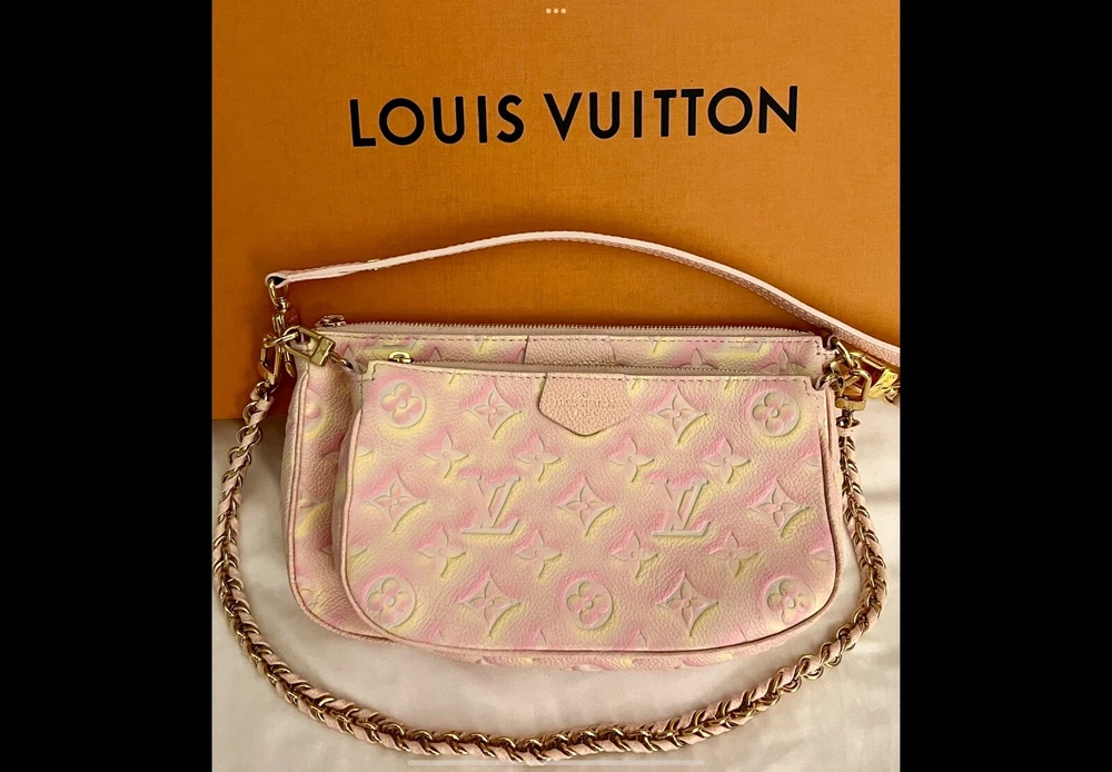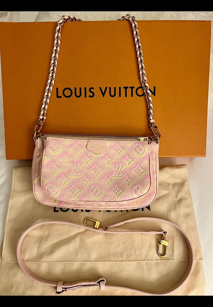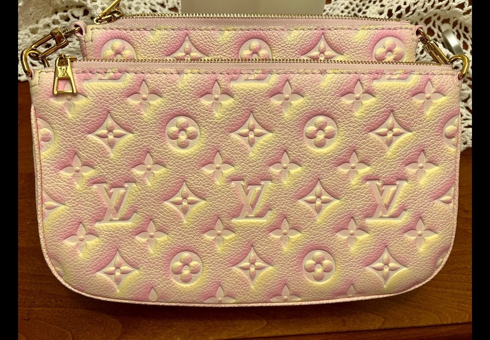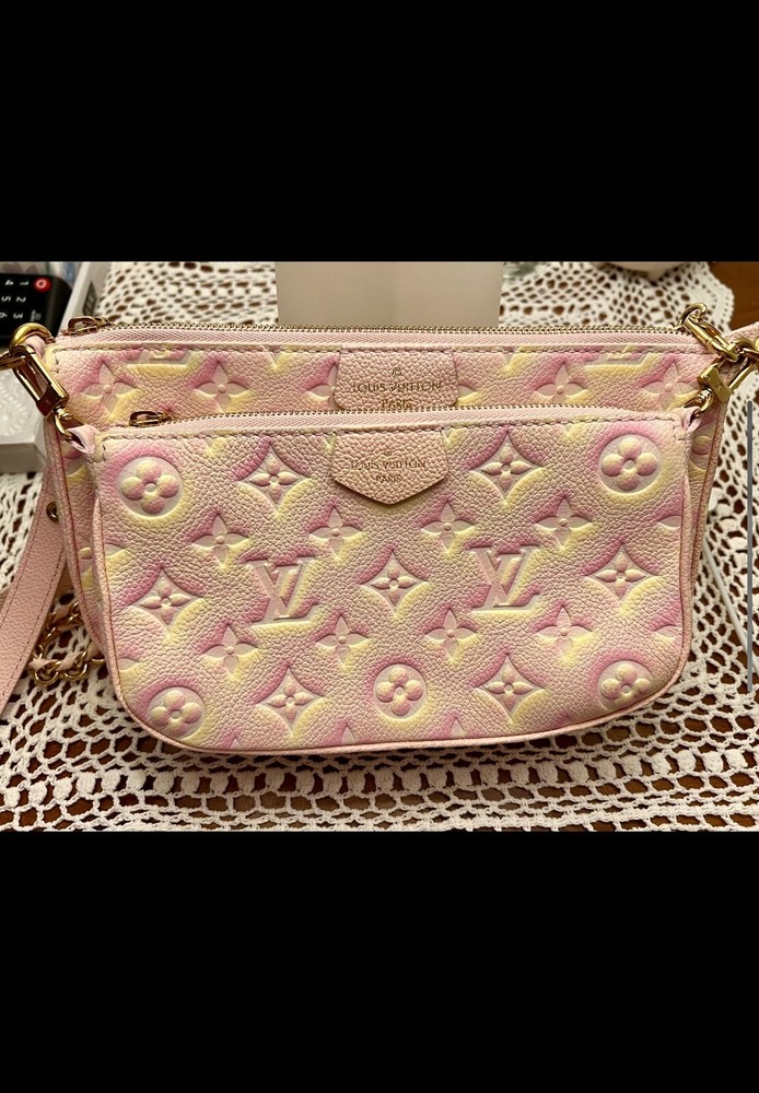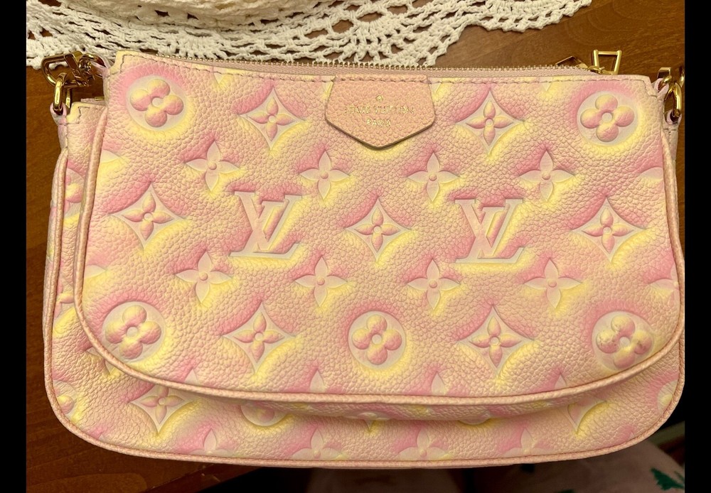 Pre-owned Louis Vuitton Multi Pochette Empriente Summer Stardust Bag, a sophisticated accessory for the discerning fashionista. Crafted with the iconic Monogram pattern and a luxurious leather exterior, this bag boasts a striking pink/yellow color. The rectangle silhouette is complemented by a sleek zip closure. This crossbody bag's practical 9-inch width, 5.5-inch height, and 2-inch depth, perfect for organizing your daily essentials. Gold hardware accents add a touch of glamour to the pink microfiber-lined interior, while the adjustable leather strap offers a comfortable 19.25-inch drop for seamless shoulder wear. Very good condition, gently used, comes with box and dust bag.