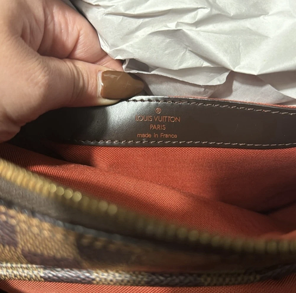 This Louis Vuitton Naviglio shoulder bag is crafted from square-shaped brown leather with a beautiful Damier Geant pattern. It features a zip closure and a brown leather handle/strap with a drop of 34.64 inches, making it a perfect fit for women. The bag has a width of 11.02 inches, a height of 9.44 inches, and a depth of 5.7 inches, providing ample space for your essentials. The bag's exterior is adorned with the iconic Louis Vuitton monogram, and the interior is lined with brown canvas material. It is a stylish accessory that can complement any outfit, perfect for the modern-day woman.