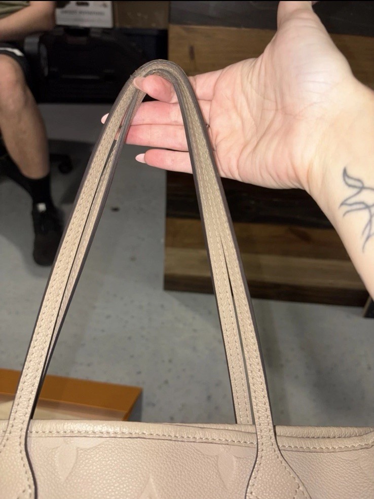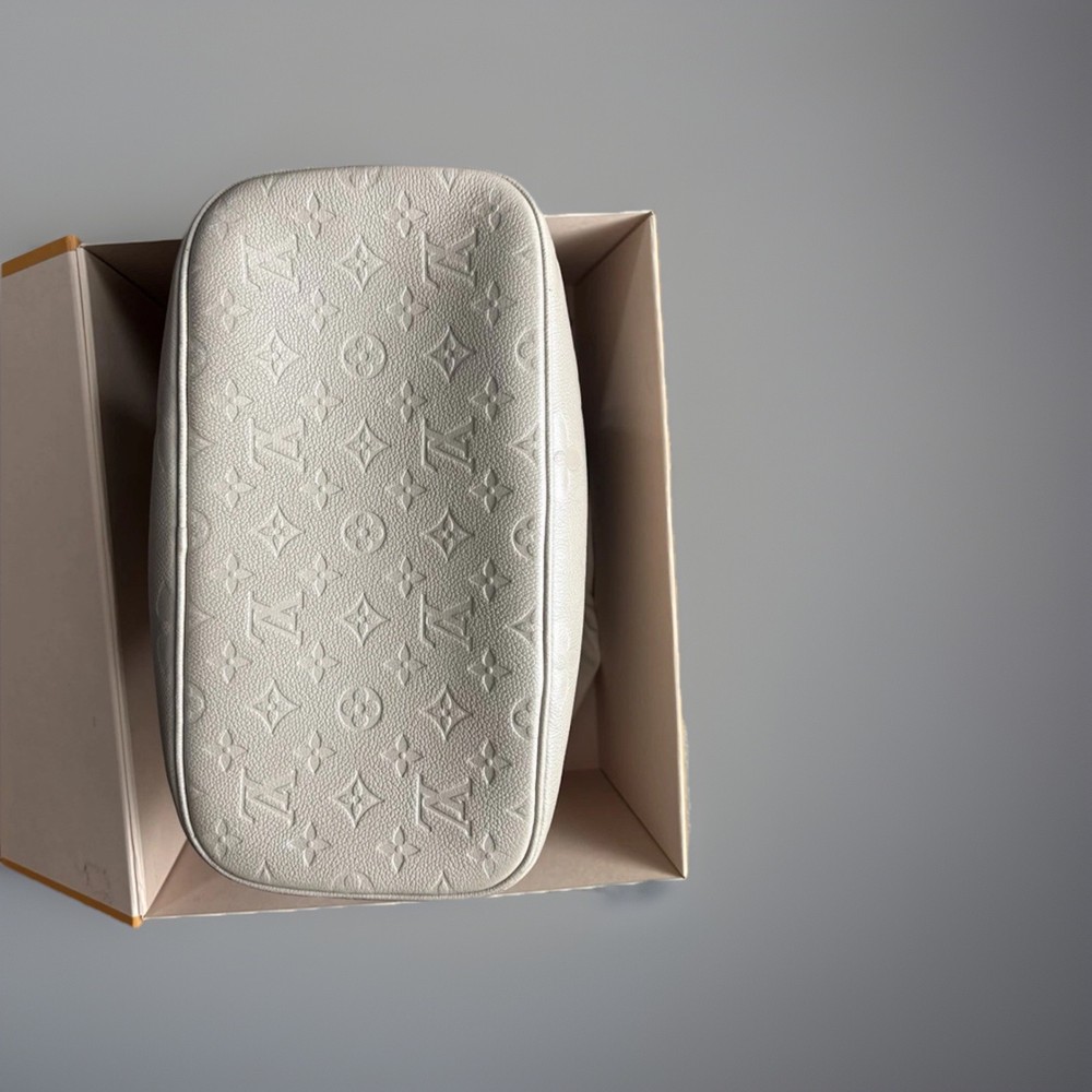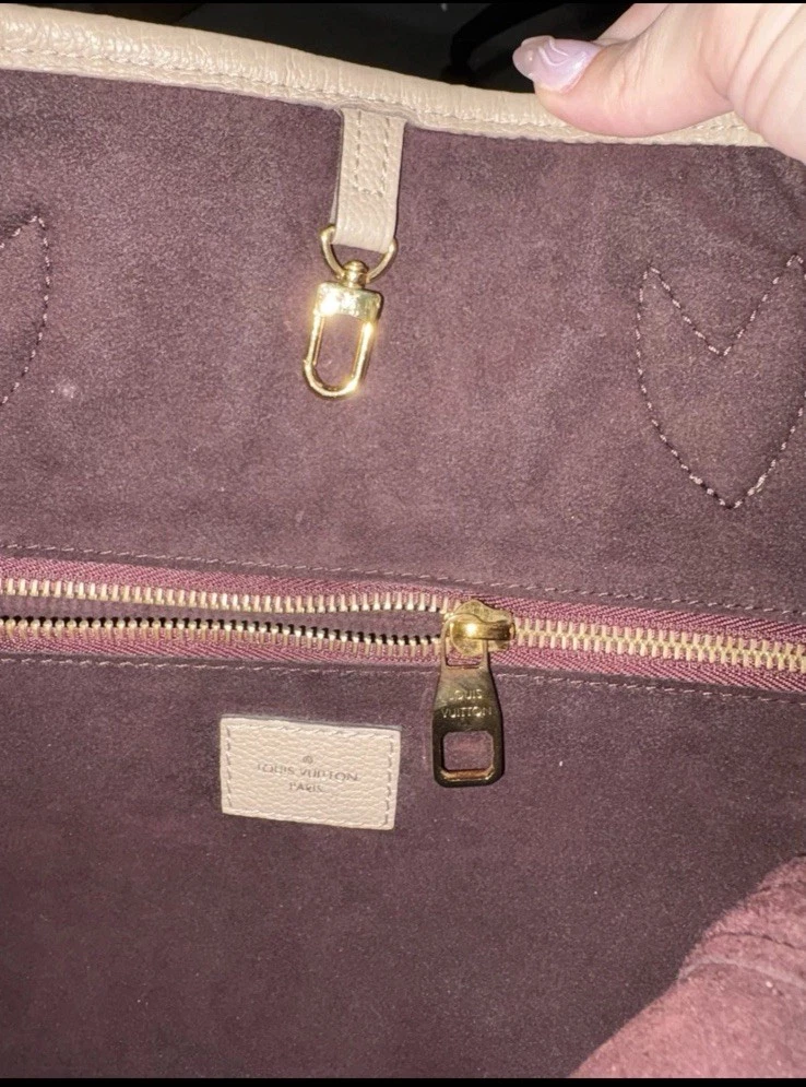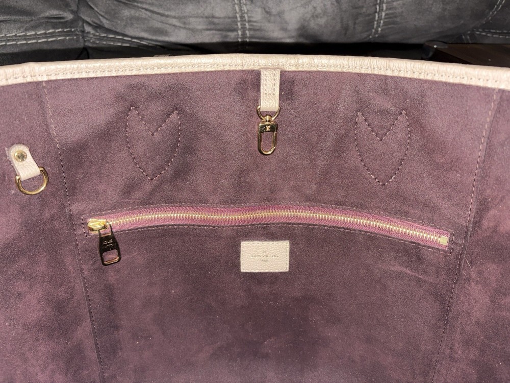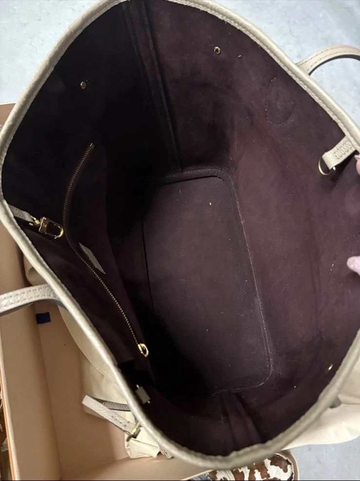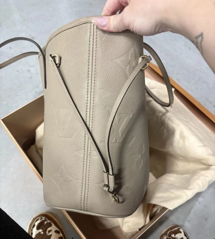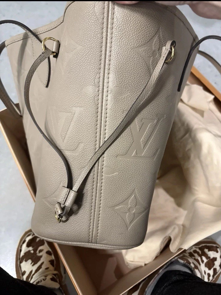 Pre owed by in nearly perfect condition. Goes for 2700 on website. Louis Vuitton Neverfull Mm Monogram Empreinte Leather Tourterelle Gray/Burgundy more pictures upon request. Listing price includes off brand organizer from Etsy, box and dust bag. Does not include pouchette. Also free can be made with if interested