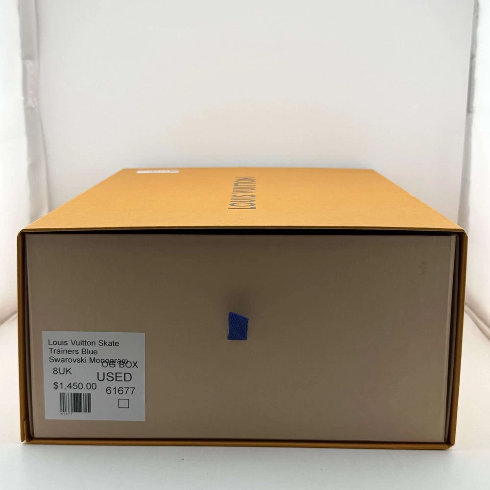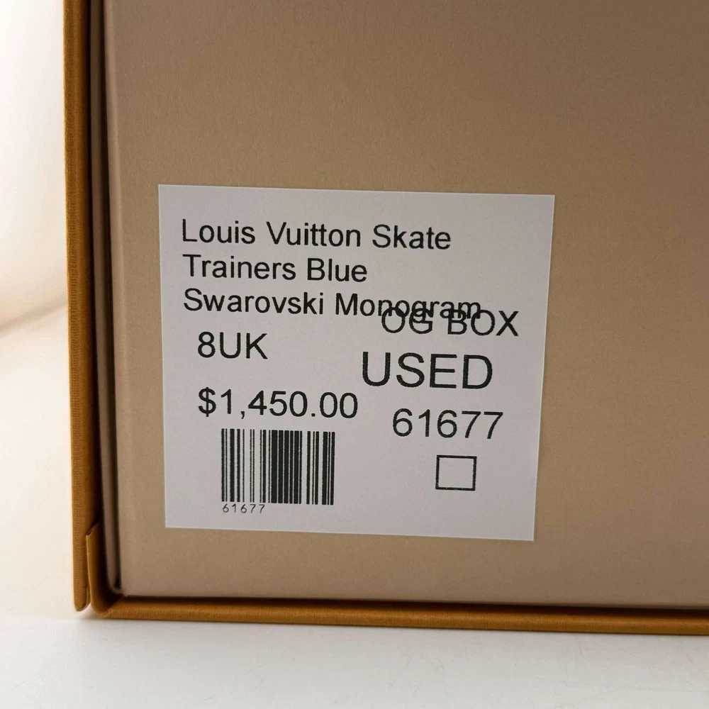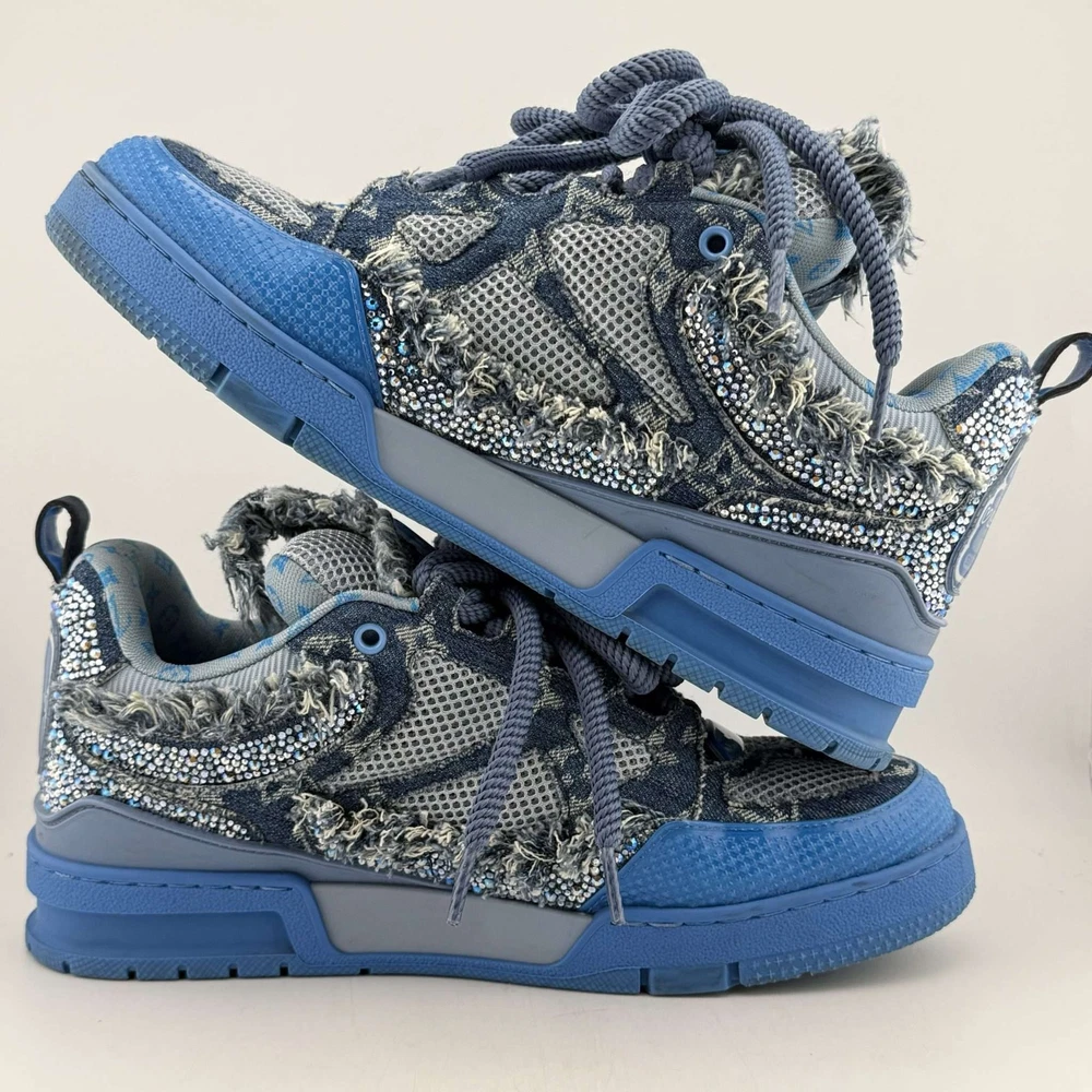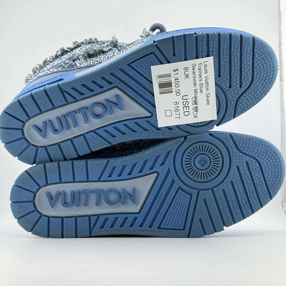 ALWAYS AUTHENTIC, SHIPS 1 BUSINESS DAY, VERIFIED SELLER Louis Vuitton Skate Trainers Blue Swarovski Monogram 8UK These Louis Vuitton Skate Trainers feature a unique blue Swarovski monogram design, combining luxury and style. The sneakers are crafted with a mix of denim and mesh, adorned with sparkling crystals for a standout look. The shoes are in used condition, showcasing some wear but maintaining their iconic appeal. Made in Italy, they come with the original box, making them a perfect addition for collectors and fashion enthusiasts alike.