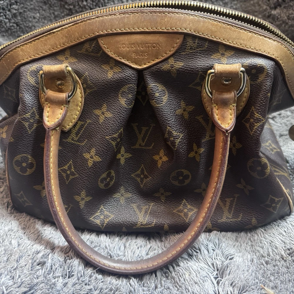 The Louis Vuitton Tivoli Tote GM in Brown Canvas Monogram is a stylish and luxurious handbag designed for women. With a classic monogram pattern and gold hardware accents, this tote features a brown leather handle/strap and a zip closure. The coated canvas exterior is combined with a microfiber lining, making it a durable and versatile accessory for everyday use. The spacious size and comfortable strap drop make it a practical and chic choice for any outfit, showcasing the iconic Louis Vuitton Tivoli product line.