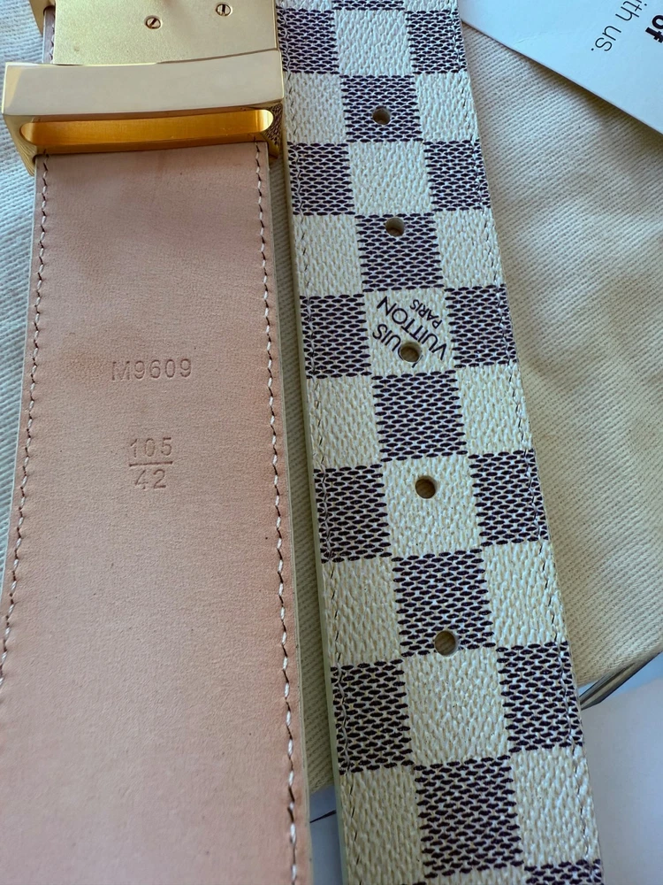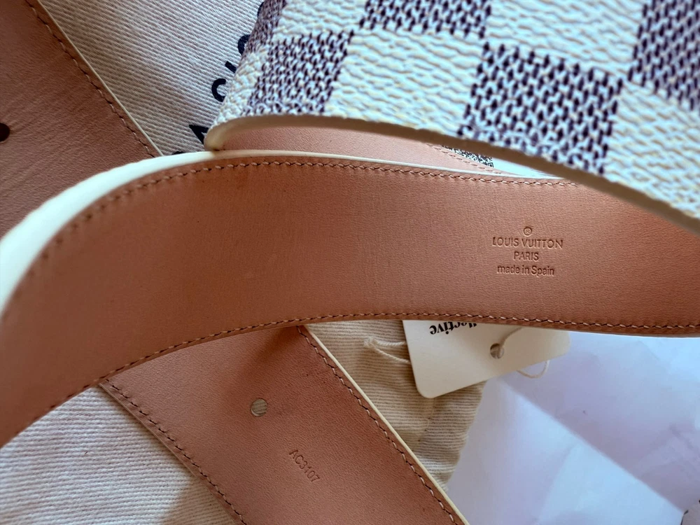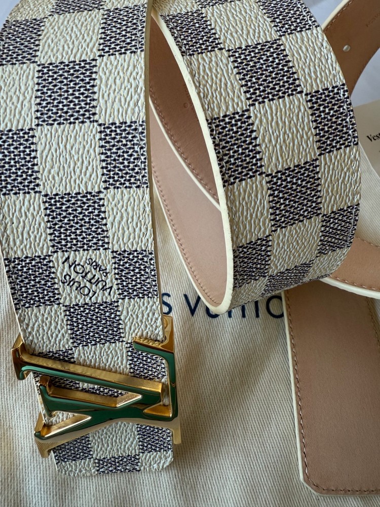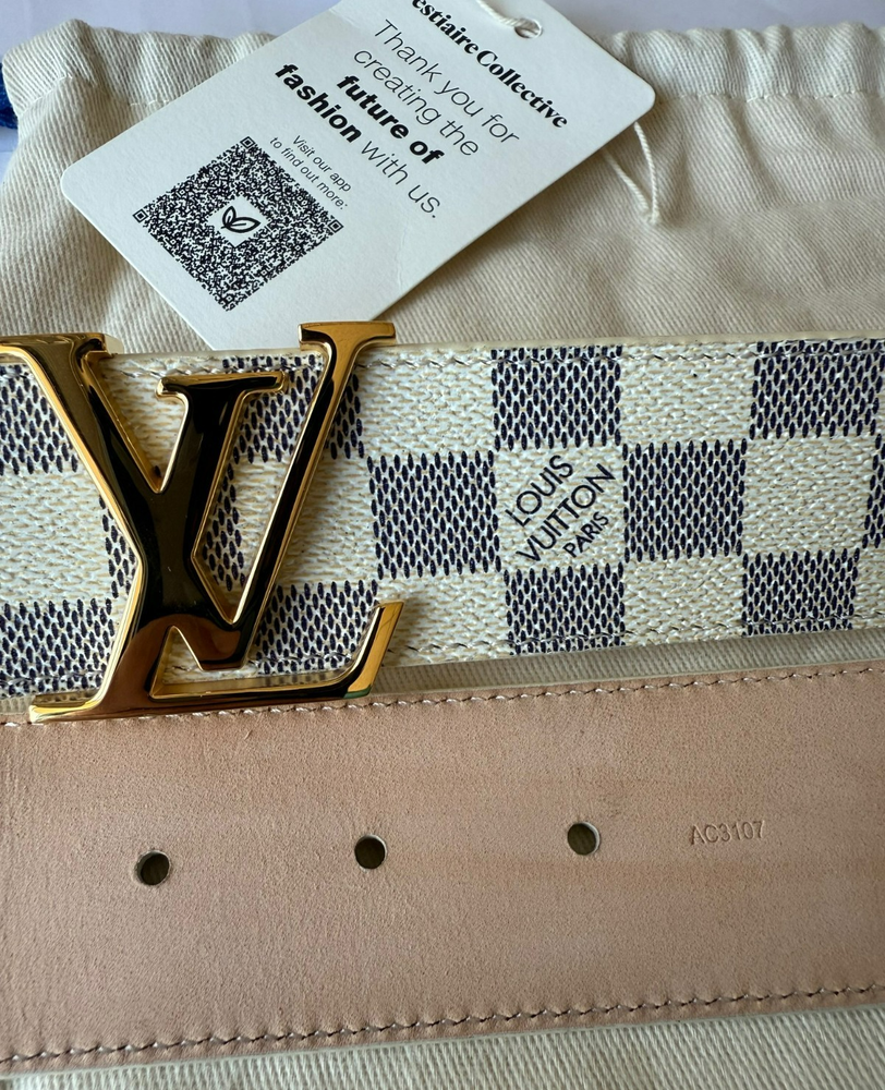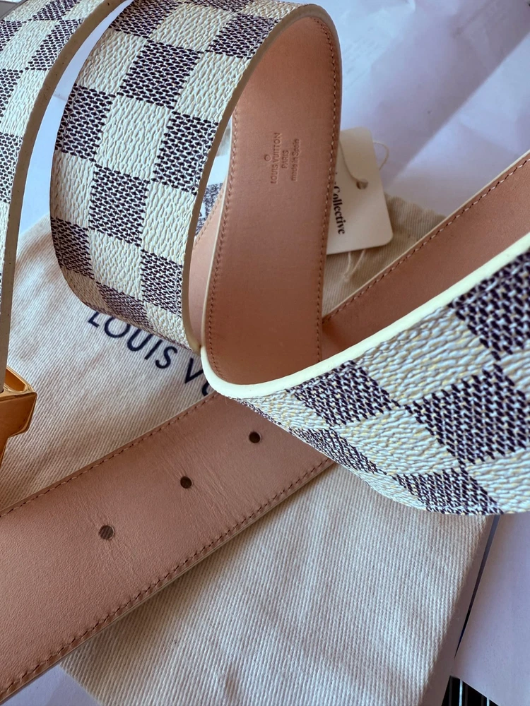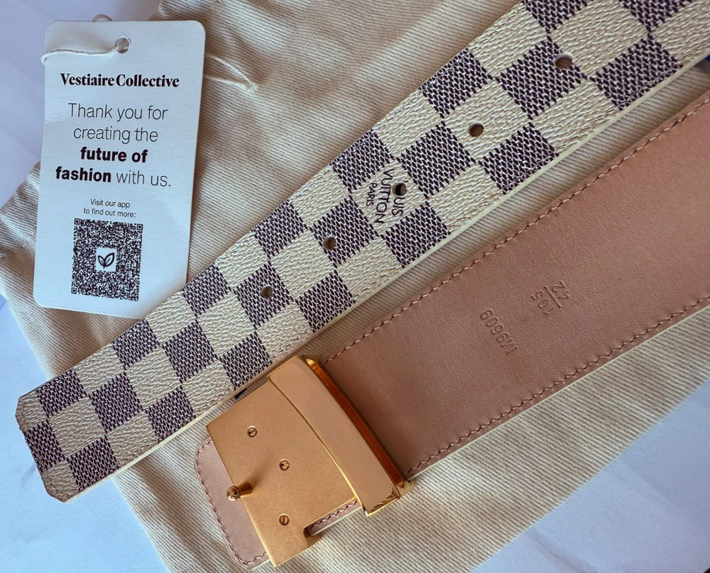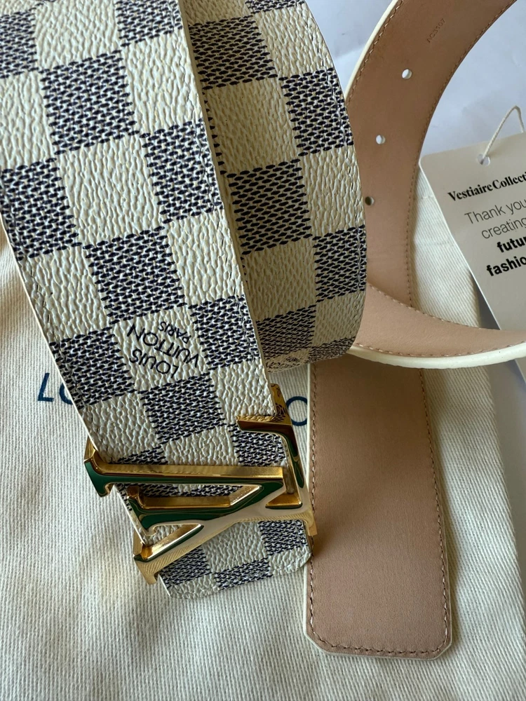 Louis Vuitton White Damier Graphite Belt – Gold Tone Buckle – Size 105 (Fits 36–38 Waist) Elevate your wardrobe with this stylish and luxurious Louis Vuitton Damier Graphite belt in white, featuring an elegant gold buckle for a sophisticated finish. Details: Size: 105 cm (Fits approx. 36–38 waist) Color: White Damier Graphite Buckle: Gold-tone hardware Material: High-quality leather Condition: Excellent Includes dust bag and Vestiaire Collective authenticated tag. This belt is perfect for a polished, dressy look and adds a refined touch to any outfit,