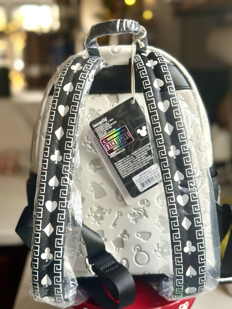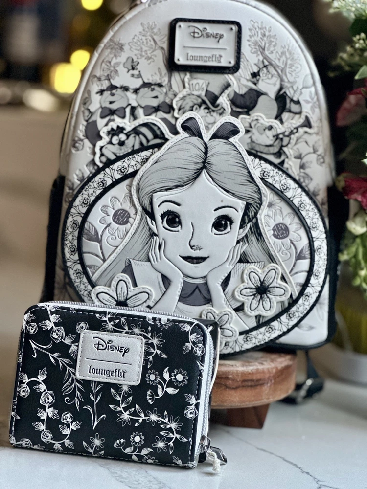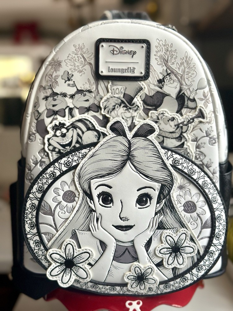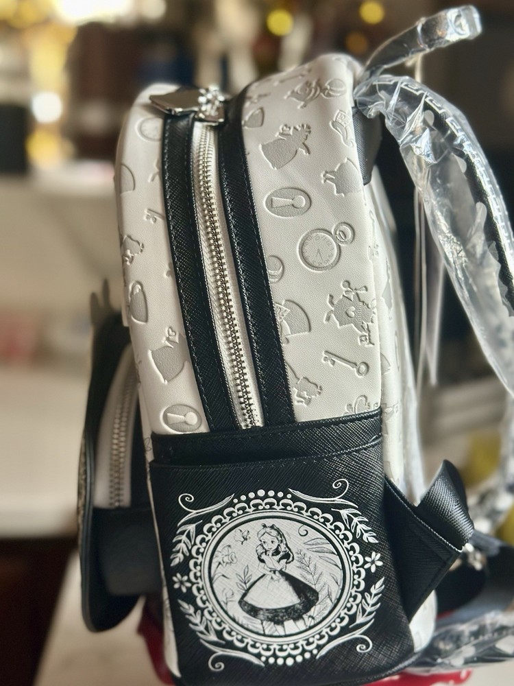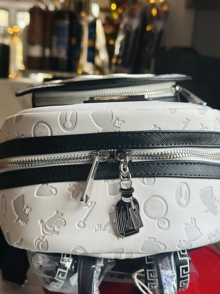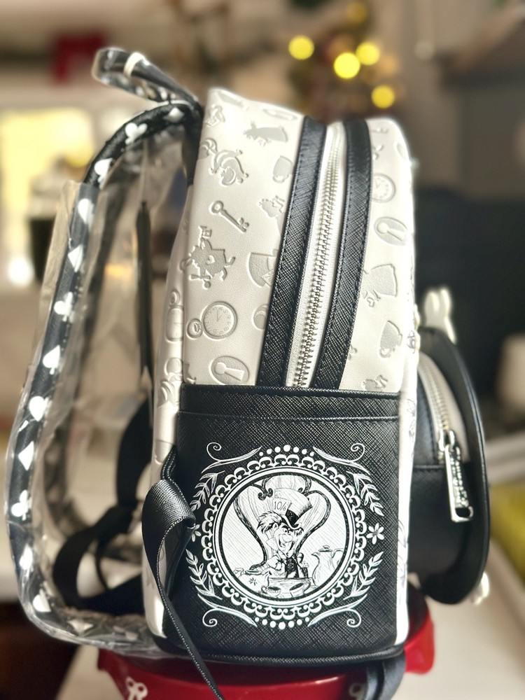 Handle/Strap Color: Black and White Hardware Color: Silver Handmade: No Handle Style: Shoulder Strap Closure: Zip Vintage: No Lining Color: Black and White Finish: Matte Hardware Material: Stainless Steel Bag Depth: 5 in Department: Women Bag Width: 9 in Pattern: Cartoon Accents: Zipper Brand: Loungefly Theme: Cartoon, Classic, Movie Personalize: No Handle/Strap Material: Faux Leather Exterior Material: Polyurethane Bag Height: 11 in Occasion: Backpack Features: Adjustable Strap Product Line: Loungefly Accessories: Bag Charm Lining Material: Polyester Size: Mini Customized: No Exterior Color: Black and White Style: Backpack Character: Alice in Wonderland