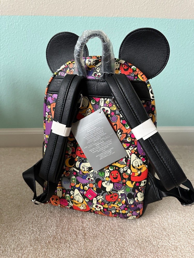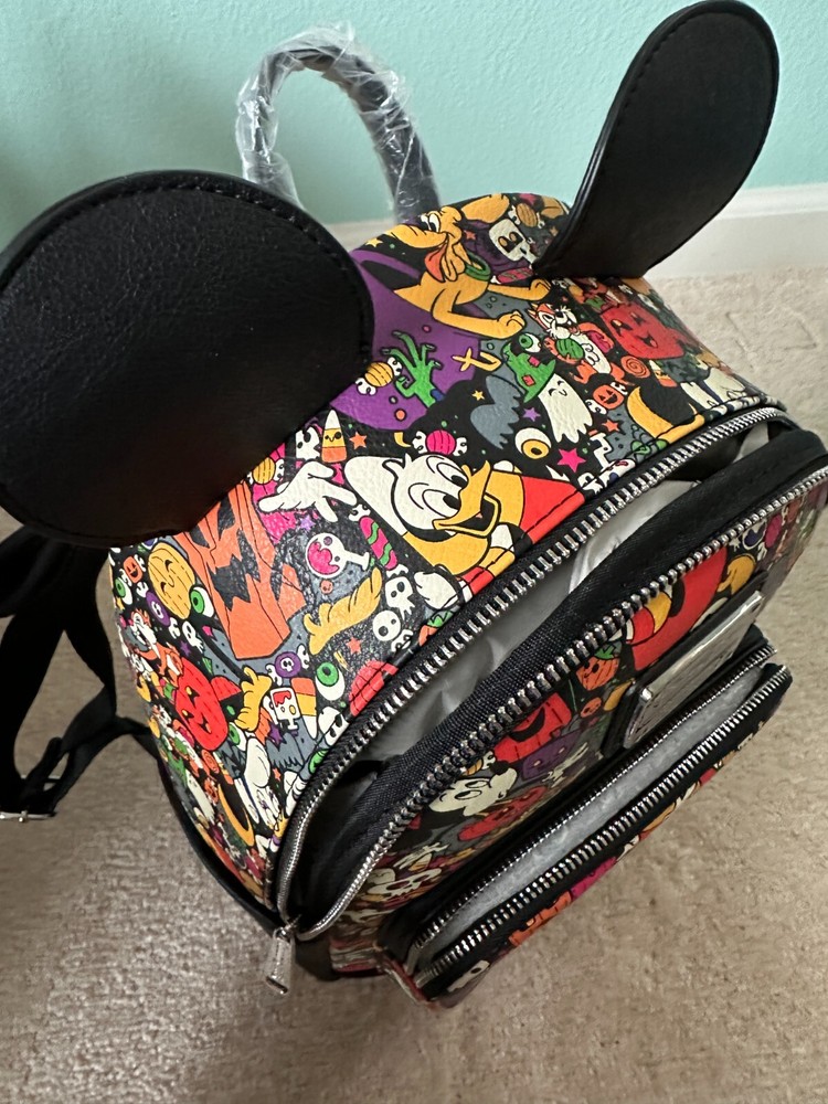 This Loungefly Disney Parks Halloween Allover Print Characters Mini Backpack features a fun and colorful design with various Halloween-themed Disney characters. The mini backpack style makes it perfect for carrying your essentials while on the go. It has a top handle for easy carrying and a zip closure for security. The exterior is made of faux leather in a multicolor design, complemented by silver hardware accents. This backpack is a great choice for Disney fans looking to add a touch of Halloween magic to their outfit.