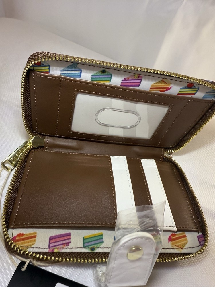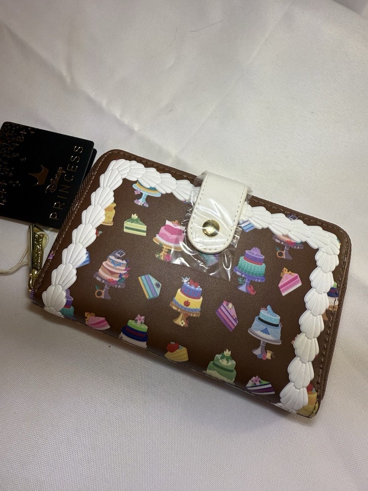 The “icing on the cake” is guessing which cake goes with each princess, based on the decoration adorning every delectable piece. The following Disney princesses are represented: Cinderella, Jasmine, Tiana, Aurora, Snow White, and Ariel. Note the coordinating inside lining, which includes a motif of slices of each cake. Wallet features include the following details: gold-colored metal hardware for the zipper and snaps, vegan leather (polyurethane), and applique and print work. New with tags Hard tag Loungefly