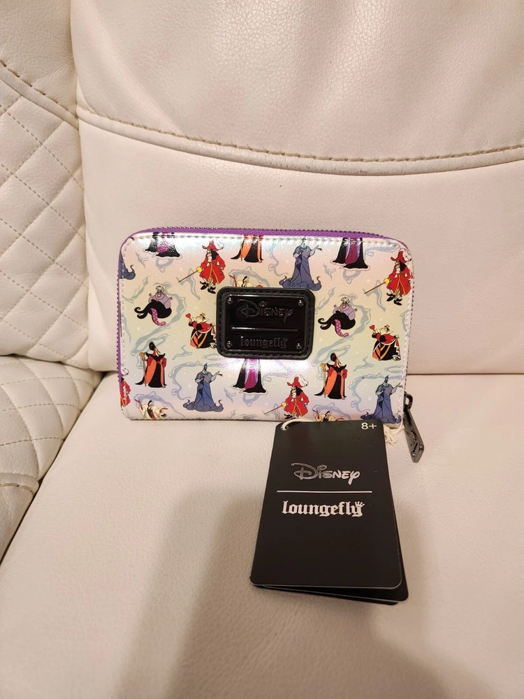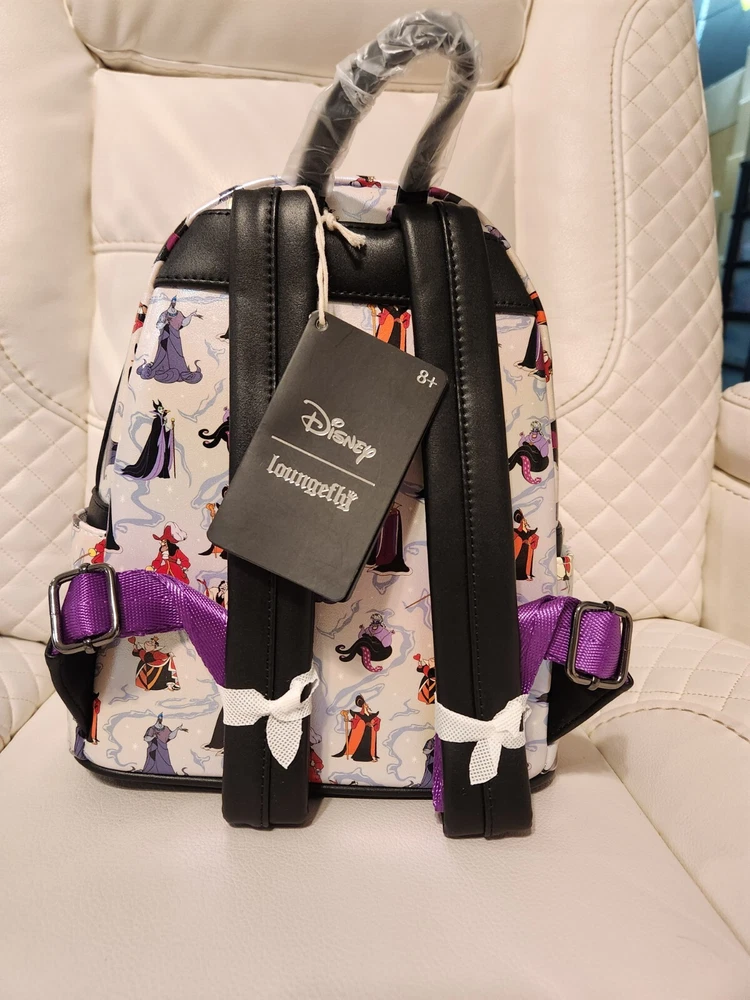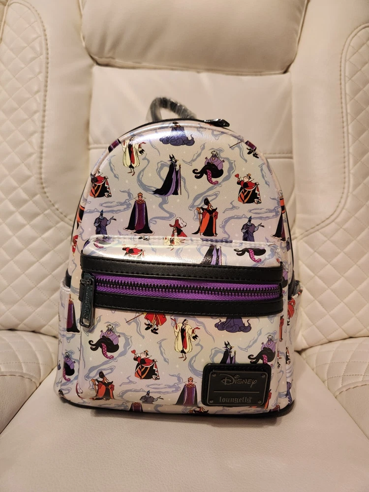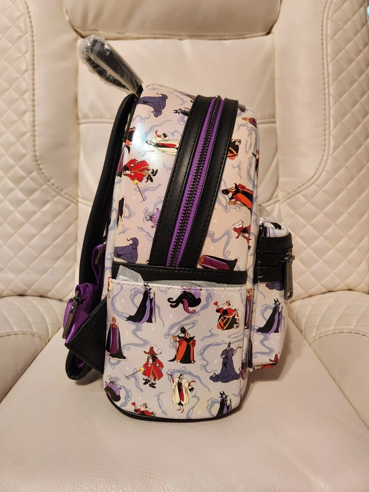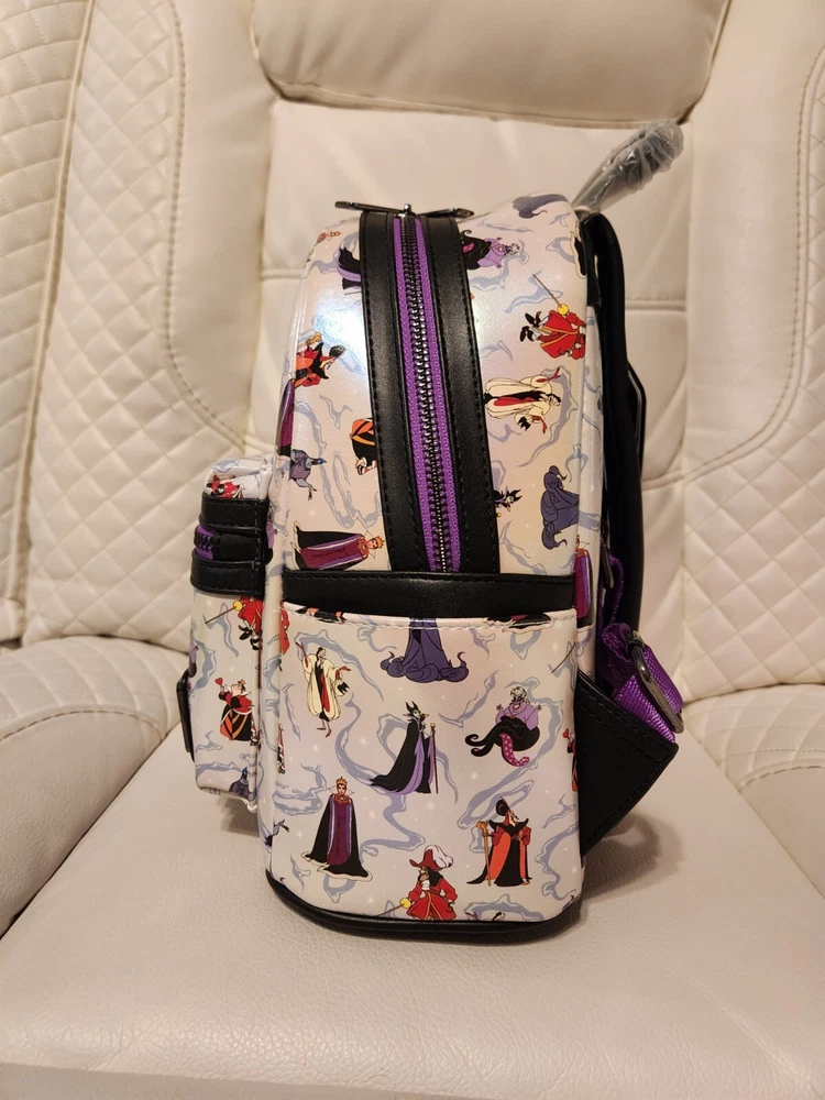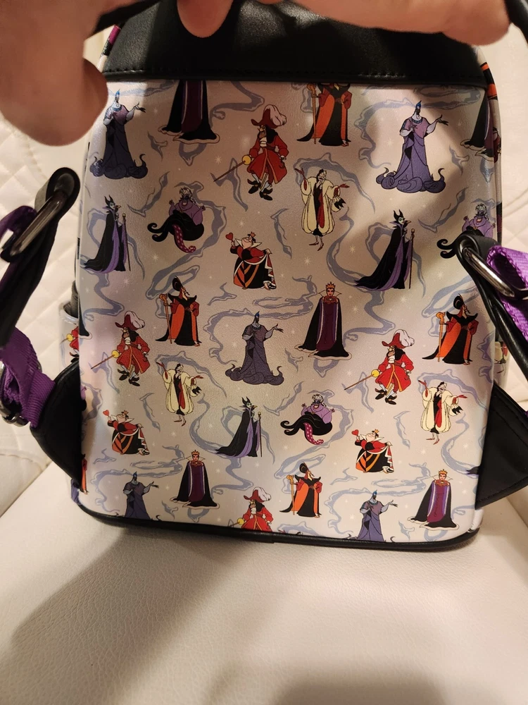 This is the exact print pattern you will receive if purchased. Backpack: Add a touch of villainy to any look with this mini backpack! Featuring an allover print of Disney villains like Ursula, Jafar, Hades, and more, this bag includes an iridescent background. With a matching interior lining and adjustable straps, this bag is perfect for your next trip to the Disney Parks. Don't forget the matching wallet sold separately! Polyurethane Approx. 10 1/2" H x 9" W x 4 1/2" D Wallet measures 4" x 6"