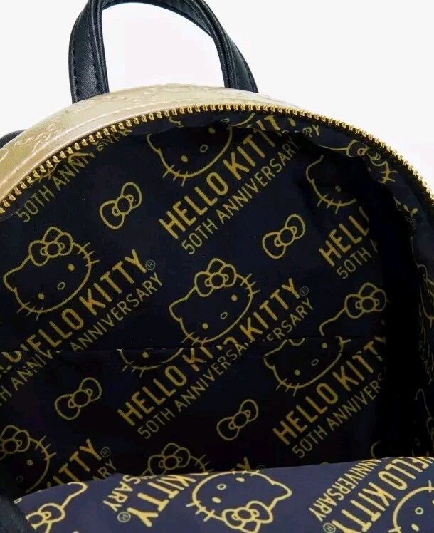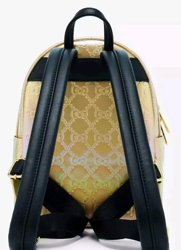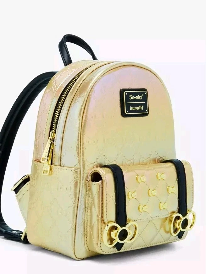 Make any look supercute with this Sanrio mini backpack! Featuring a debossed quilt design of bows on the metallic gold body, the front pocket includes gold bow studs and strap details. With adjustable straps and a top handle, this bag is perfect for fans of Hello Kitty. Don't forget the matching crossbody, tote, and wallet sold separately! Polyurethane Approx. 8 1/2" W x 11" H x 4" D