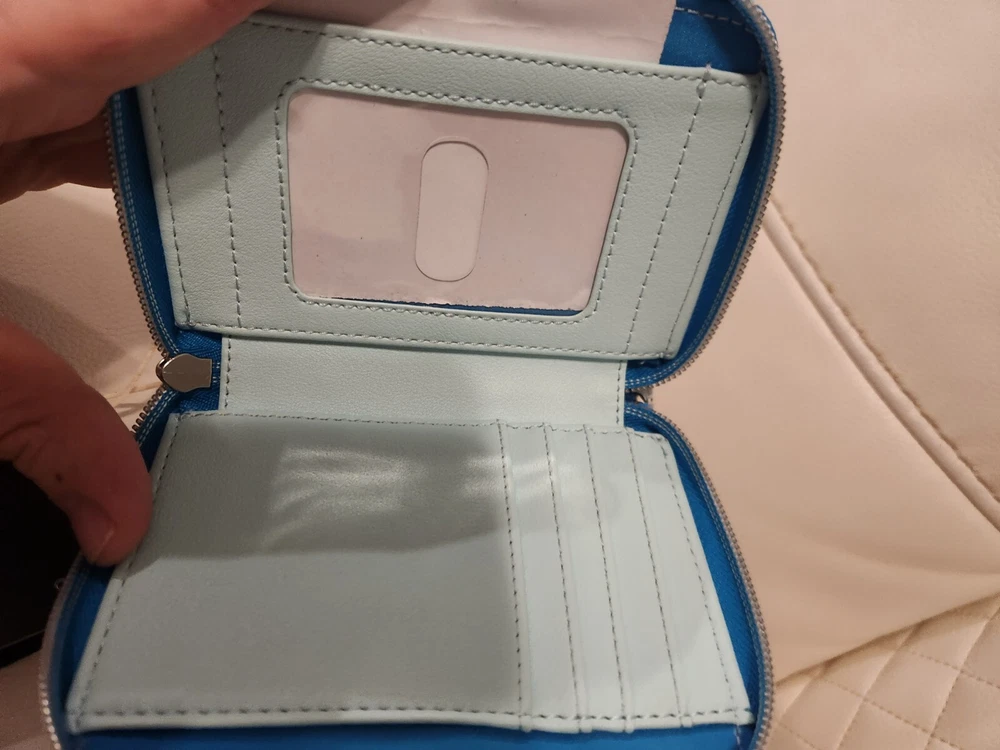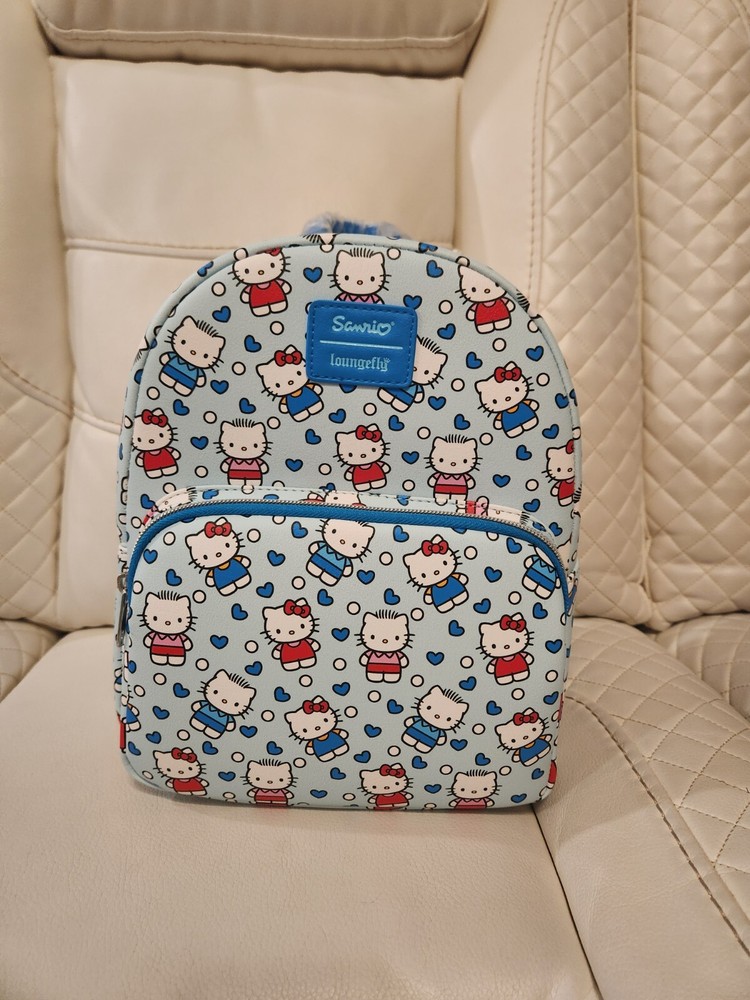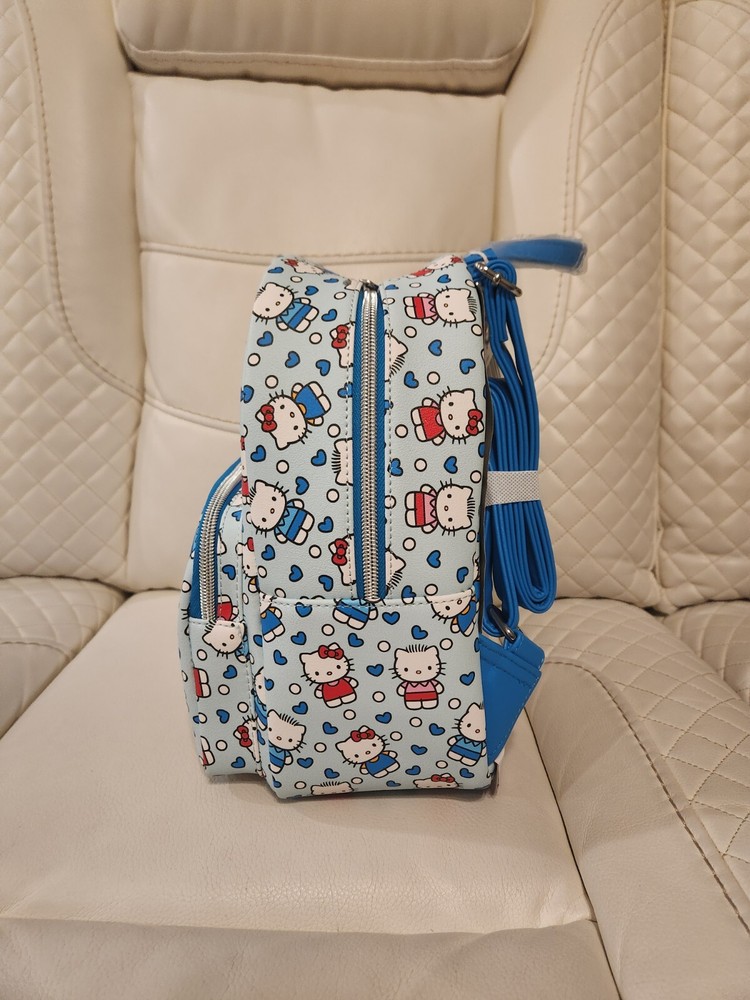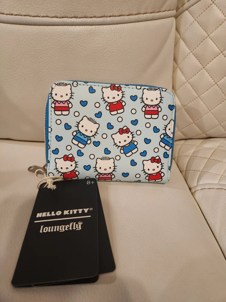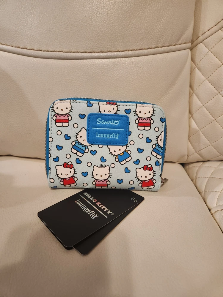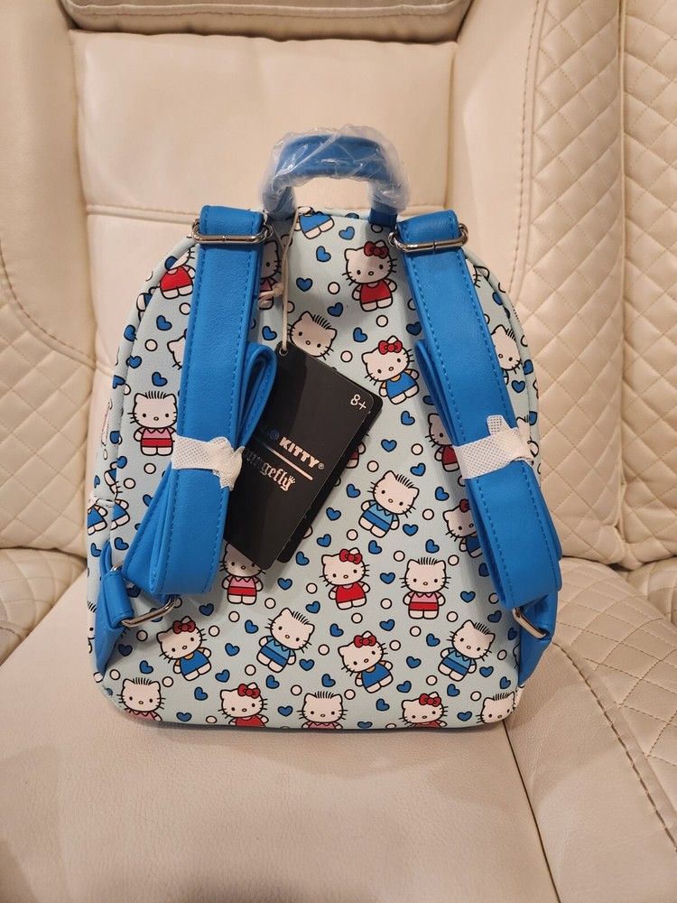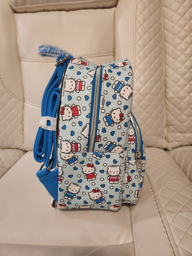 Mini Backpack: Capture the love between Hello Kitty and Dear Daniel with this mini backpack! It's a light blue with an allover print of the two characters, plus blue hearts and white dots. Front zippered pocket, interior pocket and adjustable straps. 9" x 6" x 11" Polyurethane Wallet: Capture the love between Hello Kitty and Dear Daniel with this mini zipper wallet! It's a light blue with an allover print of the two characters, plus blue hearts and white dots. The interior has card and cash slots, plus clear ID display. 5" x 4" Polyurethane