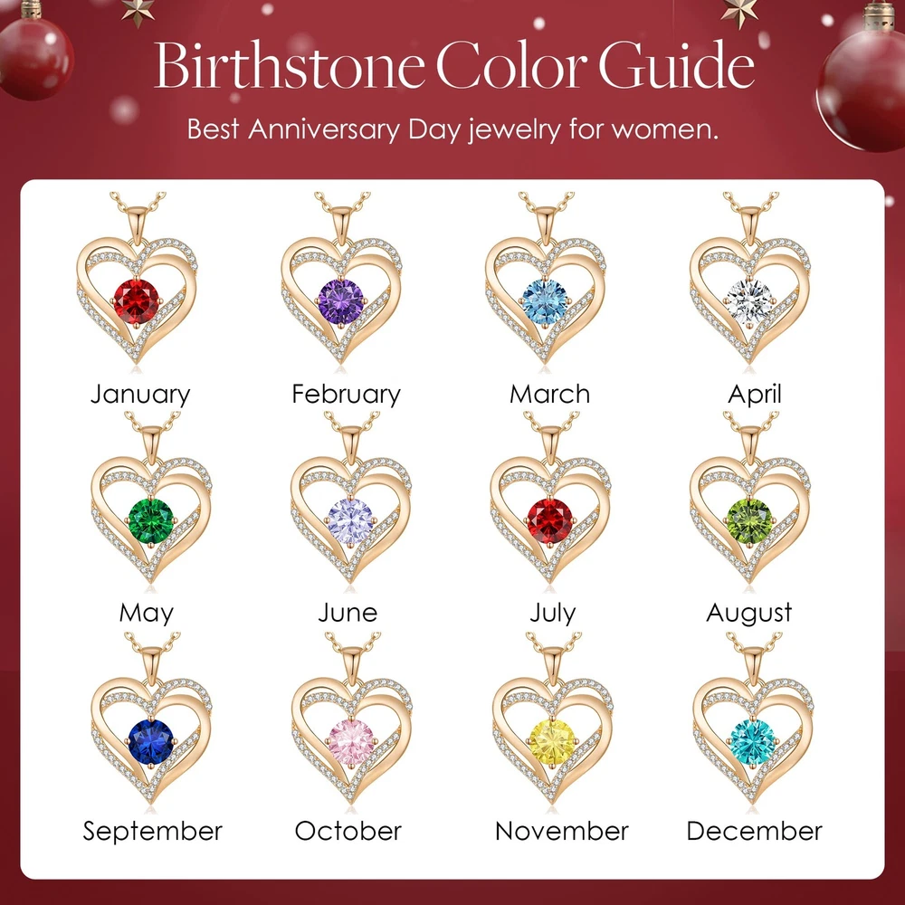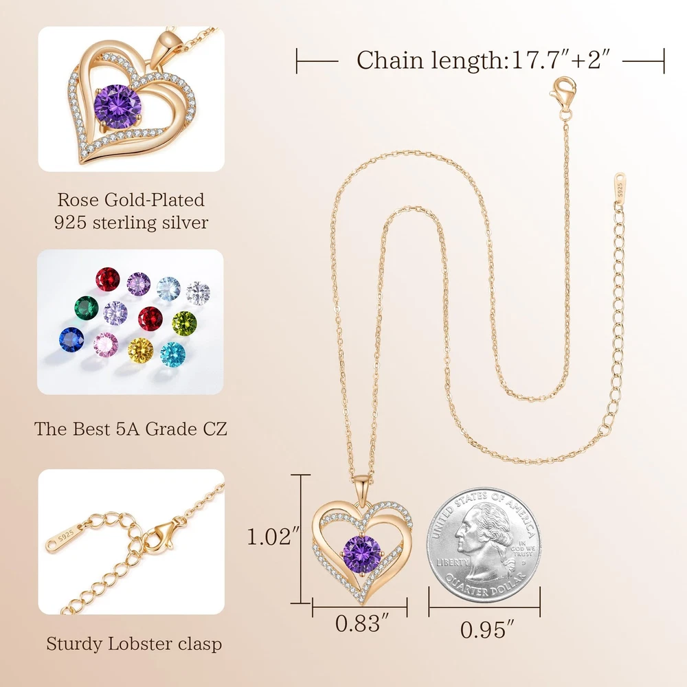 【FOREVER LOVE HEART NECKLACE】double-heart design symbolizes love for each other and everything that goes with it, in a fashionable way. The love heart birthstone necklaces for women with a gemstone pendant makes your relationship stronger and is the good choice to express your love for her on special day. And the meaning behind the design makes it a sentimental gift for that special someone. I LOVE YOU FOR ALWAYS AND FOREVER! 【925 STERLING SILVER MATERIAL】Pendant size for the love heart women necklaces: 0.83"ⅹ1.02" | Zircon size : 0.3"ⅹ0.3" | Chain length : 17.7"+2". The pendant and the chain are made of 925 STERLING SILVER with rose gold plating. 【12-MONTH BIRTHSTONE MEANINGS】EACH MONTH IS REPRESENTED BY 12 DIFFERENT COLORED BIRTHSTONES. A gem-quality cubic stone is embellished in the middle of the pendant, with high precision and fine cutting, it reflects extraordinary brilliance. The wearing of rose gold necklaces for women also can be bring good luck, wisdom, and happiness. MAKE YOUR DEAR EVERY MOMENT MORE BEAUTIFUL! 【IDEAL GIFT FOR YOUR LOVE】A necklace like this will never go out of trend – it mixes the past trend to the present and future. A sparkling women birthstone necklaces would best express your feelings towards your beloved and would make a perfect Birthday, Mother's Day, Valentine's Day, Christmas, Wedding, Engagement, Anniversary, Thanksgiving Day gifts for girlfriend, wife, mother, her. IT'S A GREAT IDEAL ROMANTIC JEWELRY GIFTS FOR YOUR LOVER. 【Why Choose Us】No additional packaging is required! Each Birthstone Necklaces comes in a specially elegant gift box! At , we fully stand behind our Heart Necklaces. If you don't love our necklaces, please feel free to contact us , and we will provide you with Satisfactory solution in time.