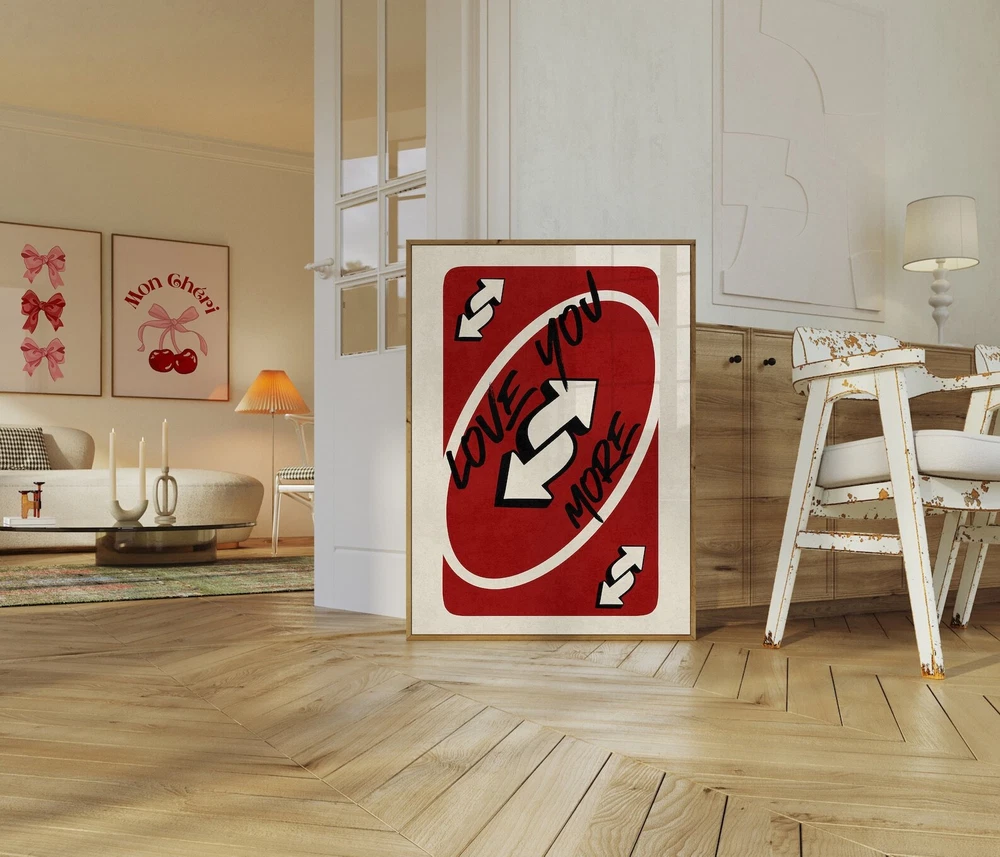 Love You More Print Red Retro Wall Art Playing Card Wall Art Valentines Day Preppy Wall Decor Trendy Wall Art Material: Premium luster photo paper Print type: Inkjet printing One side printed + The finish provides the highest possible resolution and color saturation + Lasts up to 200 years in color and 400 years in black-and-white + Printed on high-quality resin-coated photo base paper medium + Posters can be hung with double-sided tape, tacks, or framed + Hand washing with a gentle cry cloth is recommended for extended durability I will hand select the best choice of paper for your chosen design to ensure top quality results for a beautiful, bright and luxurious print. All prints are sealed in cellophane slips for protection during transportation, and are shipped in a protective cardboard envelope.