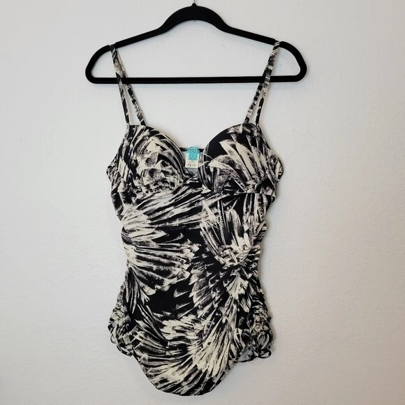Love Your Assets Spanx Size Large Black & White Tankini Swim Top Ruched Padded. Ships With USPS First Class Mail -Tankini swim top by Love Your Assets for Spanx in a black and white tropical print -Size Large -Style 1538 -Get a boost and a slim fit in the same top Ruching along the sides and adjustable ruched ties of this tankini top give you a customized, flattering fit -Underwire cups have heavy graduated padding along the bottoms of cups -Elastic straps are adjustable -73% nylon 27% spandex -Measurements are approximately 16 in armpit to armpit 29 in long 20 in center of chest to hem -Part of the underwire is slightly poking out of the right cup as shown. Otherwise great pre-owned condition! ---------------------------------------------------- Thanks for looking…have a GREAT DAY! @mandajane223