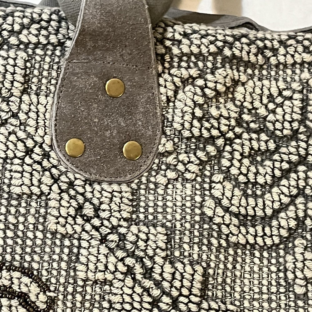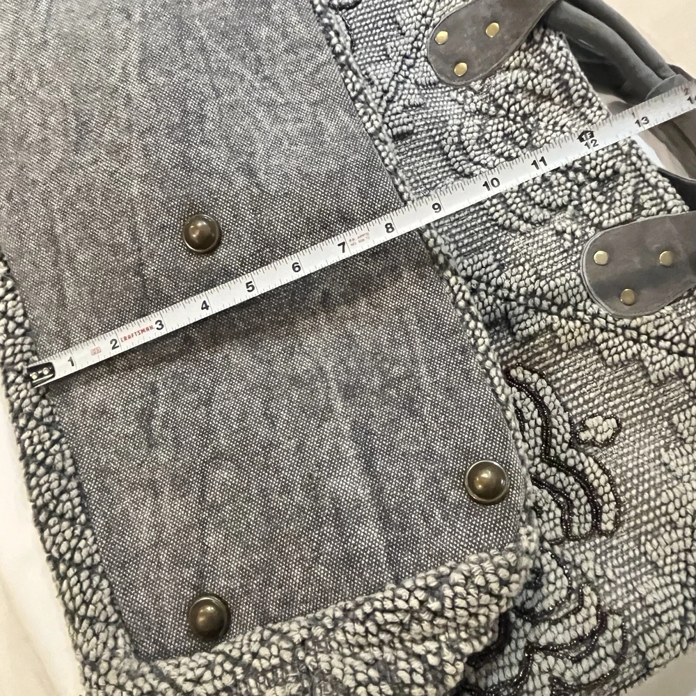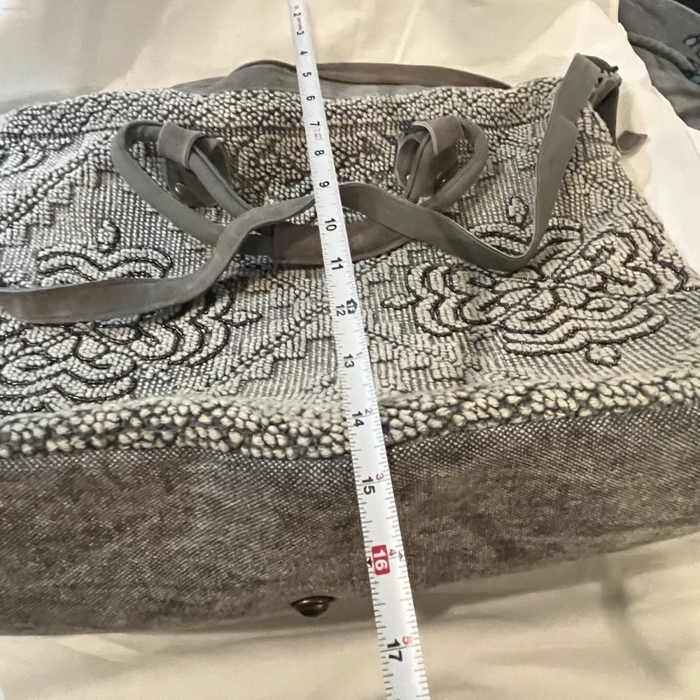 This Lovestitch tote is the perfect accessory for any bohemian-style outfit. The gray and tan color scheme, combined with beaded and embroidered accents, gives it a unique and stylish look. It has double handles and a shoulder strap for easy carrying, and its rectangular shape makes it suitable for travel or everyday use. The bag is made of cotton and leather, while the lining is made of cotton. It has various features such as inner and outer pockets, a mobile phone pocket, and bottom studs. The bag is packable and comes with a zip closure. With its spacious interior and large size, this tote is perfect for any occasion.