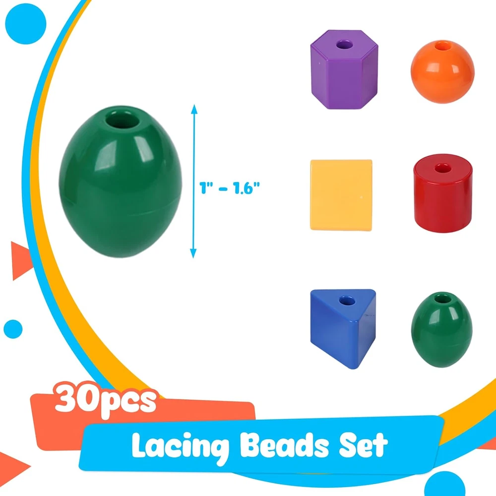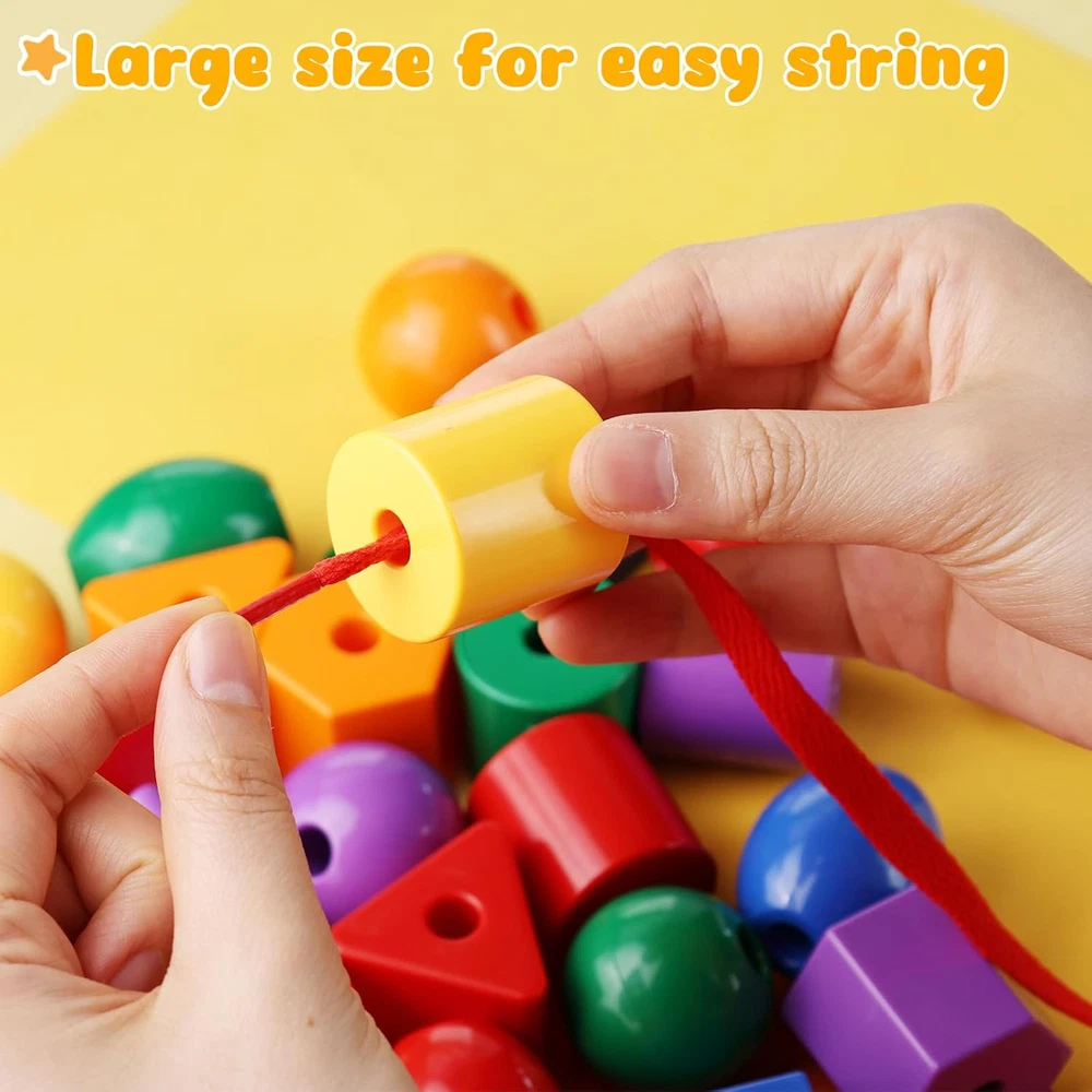 Package Includes - The set includes 30 colored beads and 2 strings. The size of the colored beads ranges between 1 to 1.6 inches, larger beads are easier to string and it comes with a non-woven bag for convenient storage. Premium Quality - The toddler string toy is crafted from high-quality plastic, these materials are safe, environmentally friendly, non-toxic, and odorless. Children can play with them with peace of mind. Rich Colors - The stringing beads come in a total of five different shapes and six vibrant colors, aiding children in identifying shapes and colors as they play. Easy to Clean - The smooth surface of the toddler's stringing beads ensures effortless cleaning, even when stringing beads become soiled. Widely Used - This stringing bead aids in the development of children's fine motor, cognitive, and visual perception skills, fostering hand-eye coordination. Primarily designed for children's toys, it also enhances shape and color recognition, serves as a valuable tool in preschool education, and is ideal for gifting and various other purposes. Product Description The video showcases the product in use. The video guides you through product setup. The video compares multiple products. The video shows the product being unpacked. LOVESTOWN Add to Cart Add to Cart Customer Reviews 4.6 out of 5 stars 27 4.5 out of 5 stars 1,634 4.5 out of 5 stars 331 4.7 out of 5 stars 4 Price $11.99 $ 11 . 99 — $13.99 $ 13 . 99 — Qty 30 36 67 32 Size 1-1.6 inch 1-1.6 inch 1.5 -2 inch multi Material ABS ABS ABS wood Occasions Birthday Birthday Birthday Birthday New Types in Progress ✔ ✔ ✔ ✔