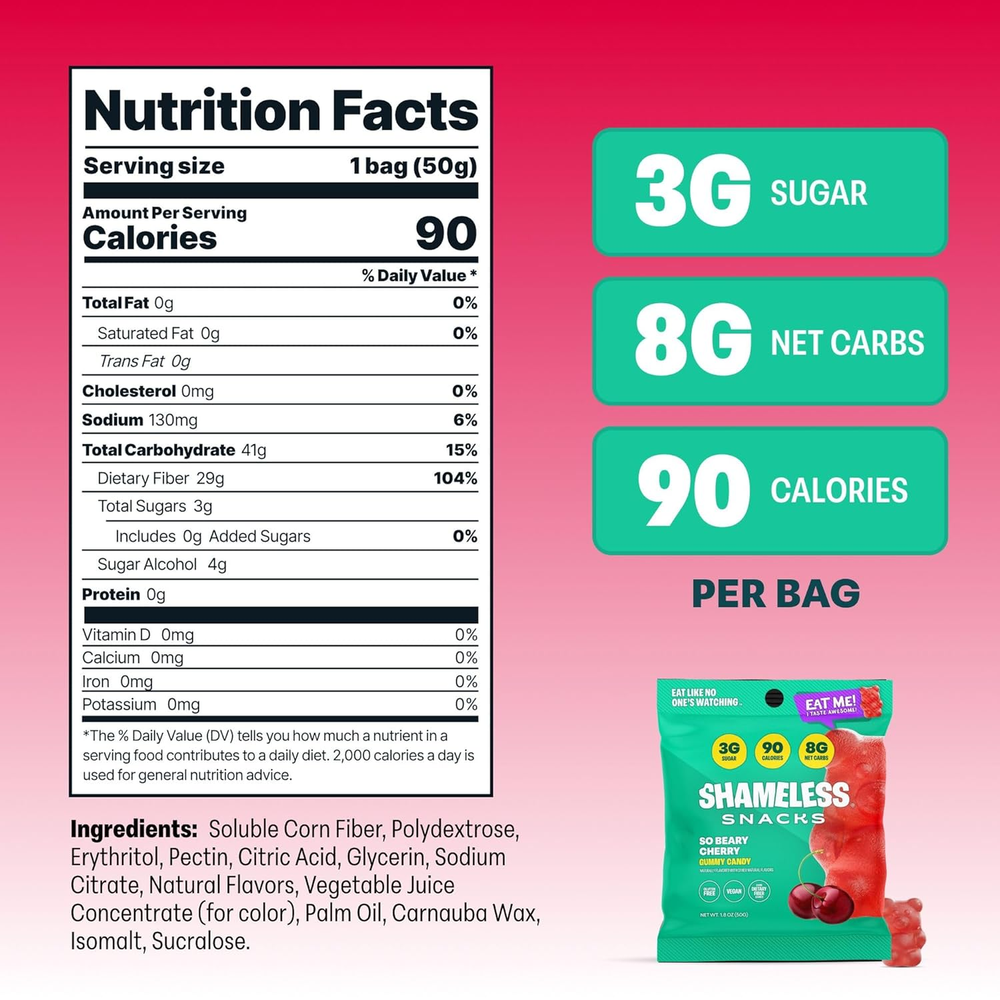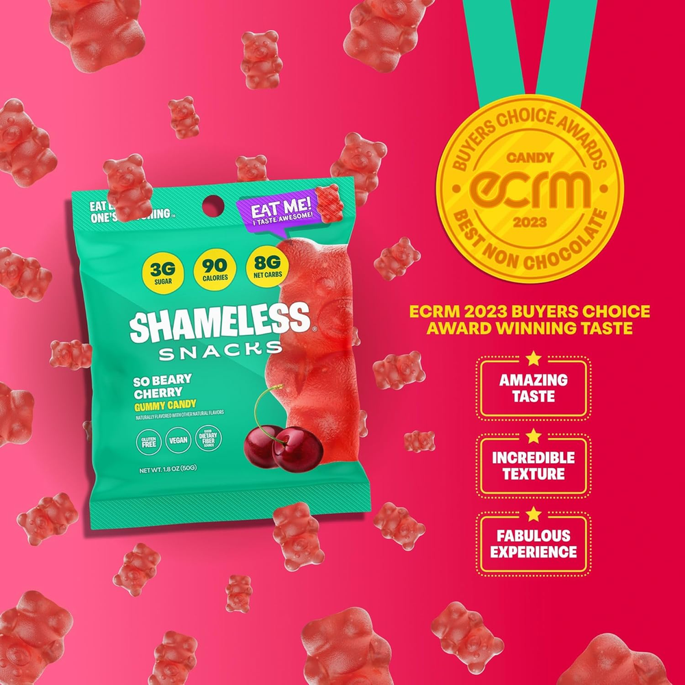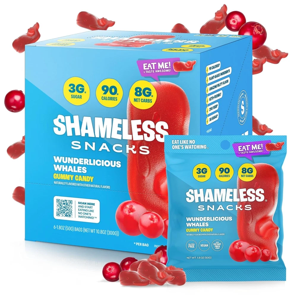 LIP SMACKIN' FLAVOR: Carefully crafted and tested fruit candy to taste just as good as classic candy — but without all the carbs, sugar, or calories. Super Variety Pack candies comes in different childhood favorite flavors — Watermelon, peach, cherry, green apple, red raspberry, and blue raspberry! 70 CALORIES PER BAG: Compare that to an equal serving of candy-aisle gummies, which have a whopping 166 calories on average! Keto gummies, keto candy, healthy candy by Shameless. 3G SUGAR: At 3g of sugar per bag, Shameless Snacks sour candies have up to 92% less sugar than regular candy, with the same great taste! True exotic candy gummies. KETO-FRIENDLY: With 3g of Net Carbs per bag, these gummy snacks are a great way to satisfy your cravings without the high-carb count. 6 pack candy bulk package. VEGAN: Shameless Snacks healthy candies are proudly made without any animal products! Shameless sour gummies are great vegan gummies and smart sweets for smart people. Product Description Satisfy your sweet tooth without worrying about calories & sugar If you love sweets but you’re watching your weight, Shameless Snacks gives you the perfect alternative to sugar-loaded store-aisle candy. Each bag has 70 calories, 3g net carbs, 3g sugar, and loads of appetite-suppressing dietary fiber, giving you the most effective — and delicious — way to cut down on calories and curb cravings while still enjoying the tasty treats you love and deserve. 1 3G SUGAR 2 3G CARBS 3 KETO-FRIENDLY 4 26G FIBER 5 VEGAN + GLUTEN-FREE Shameless Snacks Add to Cart Add to Cart Add to Cart Add to Cart Add to Cart Customer Reviews 4.2 out of 5 stars 4,969 4.2 out of 5 stars 4,969 4.2 out of 5 stars 4,969 4.2 out of 5 stars 4,969 4.2 out of 5 stars 4,969 Price $19.00 $ 19 . 00 $23.79 $ 23 . 79 $19.00 $ 19 . 00 $19.00 $ 19 . 00 $18.35 $ 18 . 35 Calories per bag 70 70 70 70 70 Sugar per bag 3G 3g 3g 3g 3g Net carbs per bag 3g 3g 3g 3g 3g Fiber per bag 26g 26g 26g 26g 26g Bag Size 1.8 oz 1.8 oz 1.8 oz 1.8 oz 1.8 oz Real Fruit Flavors ✔ ✔ ✔ ✔ ✔ No Artificial Colors ✔ ✔ ✔ ✔ ✔ Keto-Friendly ✔ ✔ ✔ ✔ ✔ Vegan ✔ ✔ ✔ ✔ ✔ Gluten-Free ✔ ✔ ✔ ✔ ✔