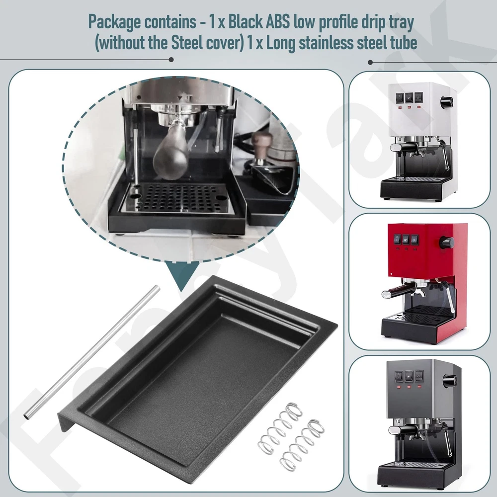 Compatible With Gaggia new Classic, Classic Pro RI9380/46, Classic 2019 /2020/21, RI9480, RI9403 (2015 / 2018) Compatible With Gaggia new Classic, Classic Pro RI9380/46, Classic 2019 /2020/21, RI9480, RI9403 (2015 / 2018) Low profile drip tray ~1" (~2.5 cm) high, made of rugged, heat-resistant ABS plastic for long service life Easy Installation: The kit is simple to install without requiring any special tools, making it easy for both experienced users and beginners to set up Package contains - 1 x Black ABS low profile drip tray (without the Steel cover) 1 x Long stainless steel tube If there is any problem, please feel free to contact us. will get back to you within 24 hours