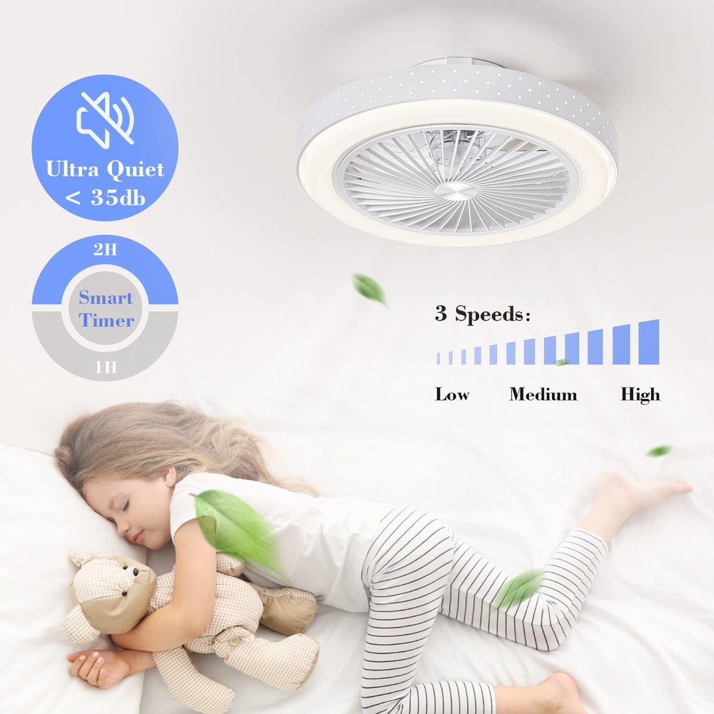 ① Iron Lampshade: Modern ceiling fans with lights are made in metal, with high-grade and durable appearance, which enhances your home decoration style. 19×7 inch ultra-thin design indoor ceiling fan with led light is suitable for low ceiling living room, bedroom, kitchen, attic, dining room, outdoor patio. ②Intelligent Ceiling Fan: Remote control ceiling fans can control the timing mode, and the timing time can be set to 1h or 2h. The light is able to be changed by remote control and the color temperature remains the same status as it was turned off, making it more convenient for you to use. ③ Strong Wind Speed: Bladeless ceiling fan can be adjusted to 3 speeds for good airflow. Hidden 8-blade design, quiet, creating a quiet and comfortable sleeping environment for you. The ceiling fan with light fixture makes it easy for you and your family to enjoy the coolness of the natural wind. The deflector can be removed for easy cleaning. ④High-Quality LED Lamp Beads: The low profile ceiling fan features high-qualiyt LED lamp beads, the light is soft and flicker-free, and the longevity is up to 50,000 hours. 3 color temperatures (3500K-4500K-6500K) can be controlled by the remote control, and the brightness can also be adjusted (10%-100%) to meet various needs of home lighting. ⑤ Safe & Easy to Clean: Enclosed ceiling fan with lights uses a hidden fan blade design, and the dense grille prevents foreign objects from touching the fan blades, ensuring the safety of the ceiling fan. At the same time, the wind deflector can also be easily disassembled. Very convenient, suitable for installation in the kitchen, etc. ⑥ Easy Installation: Ceiling fan with lights flush mount installation design, easy installation (installation instructions and installation accessories are included in the package). brand ceiling fans come with a one-year warranty. If you have any questions, you can contact us anytime, we will reply you within 24 hours. Here you can get the service you want.