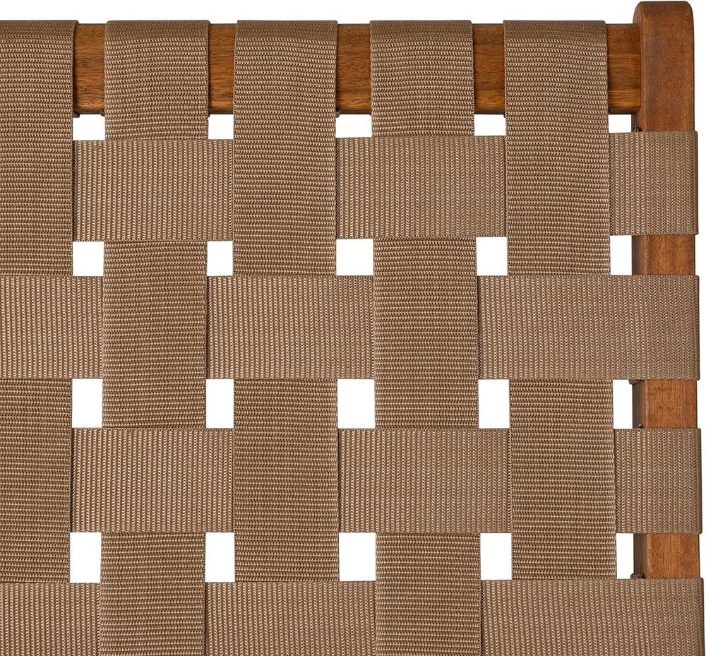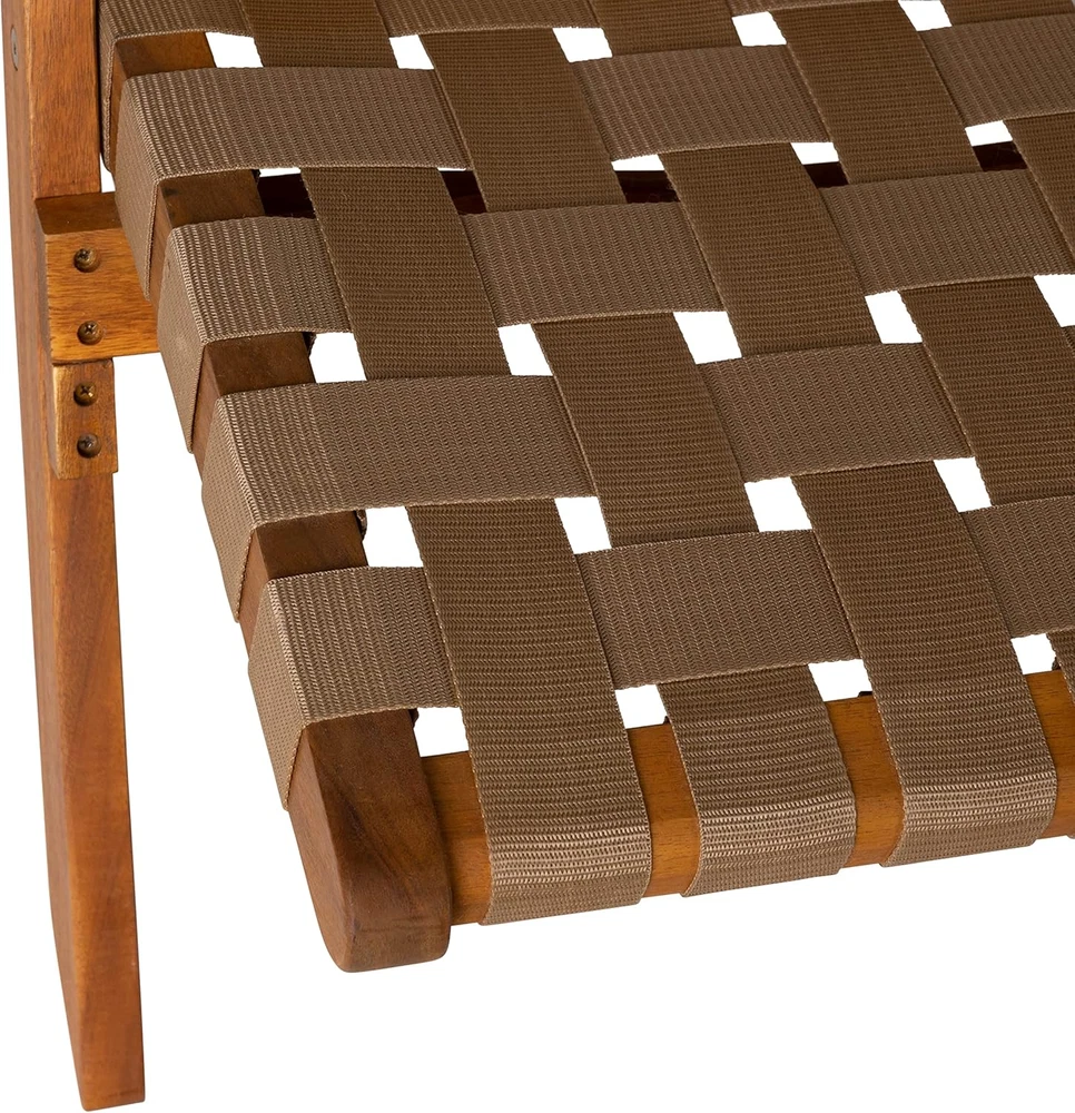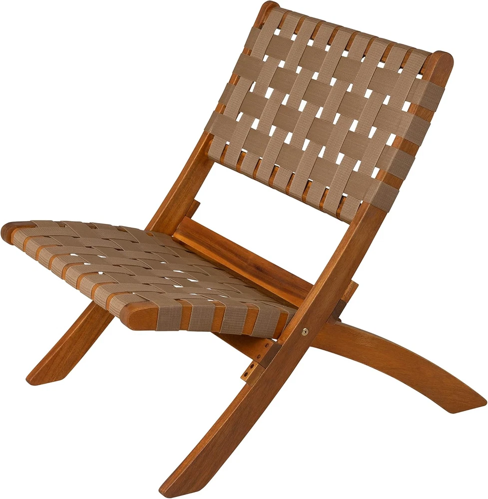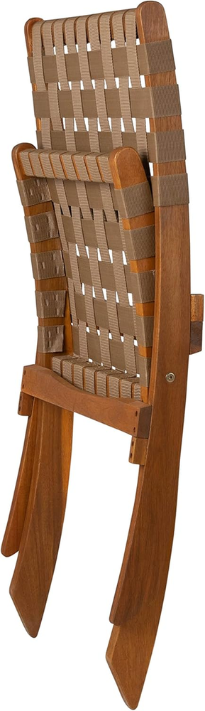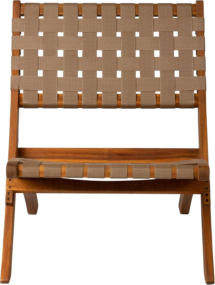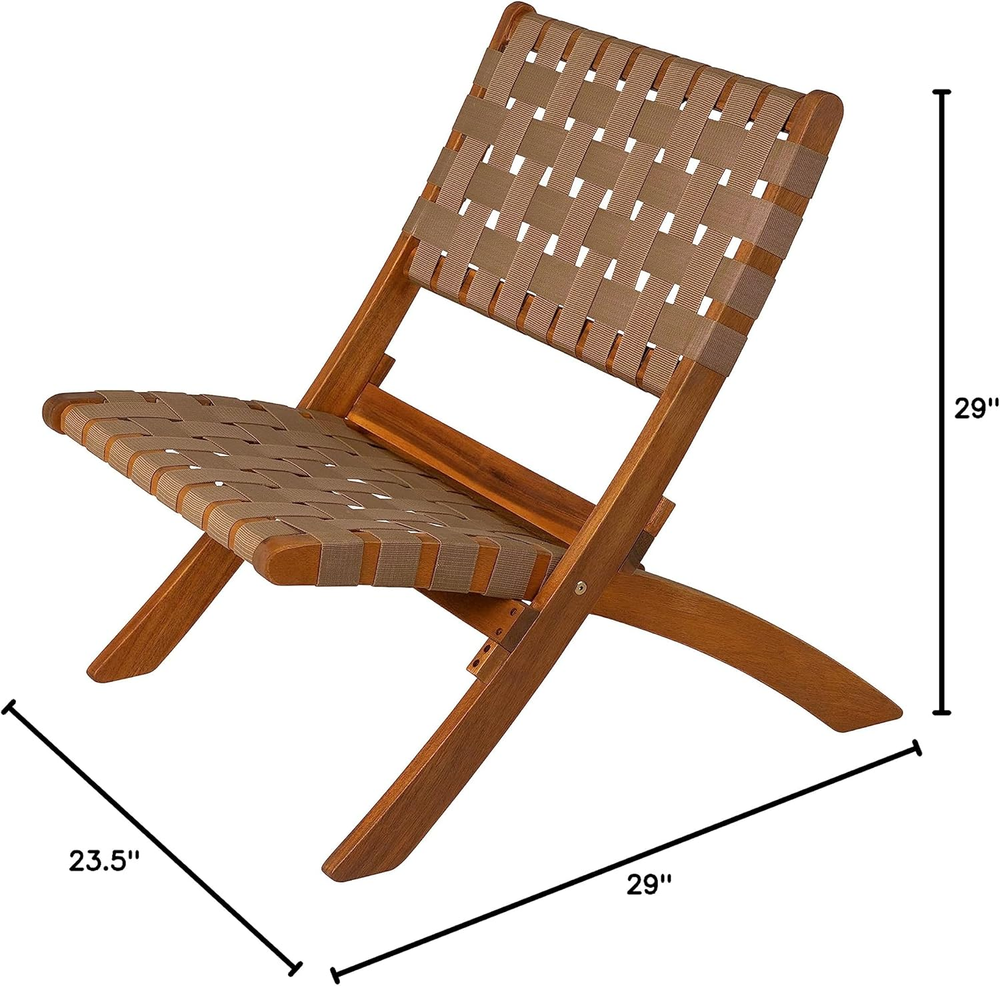 PATIO SENSE 64098: The Sava Folding Chair is low-slung, portable seating with a solid acacia wood frame and woven webbing seat and back. SAVA INDOOR OUTDOOR FOLDING CHAIR IN BROWN WEBBING: The attractive teak-toned finish is the perfect accent for any patio or indoor living area, and also conveniently folds for storage or transport. SOLID ACACIA WOOD CONSTRUCTION: The comfortable design is perfect for relaxing poolside or creating casual seating arrangements. The Sava Chair can be used all season long with basic care and maintenance & may be easily stored away in the off-season thanks to its folding design. FEATURES: Sturdy brown nylon webbing seat and backrest | Solid acacia wood construction | Beautiful teak toned oiled wood finish | Chair can be used indoors or out | Low maintenance: just wipe down with soft cloth | No assembly - just unfold | Light weight for transportability. ASSEMBLED DIMENSIONS: 31"D x 24"W x 28"H, Weight: 11 lbs Product Description