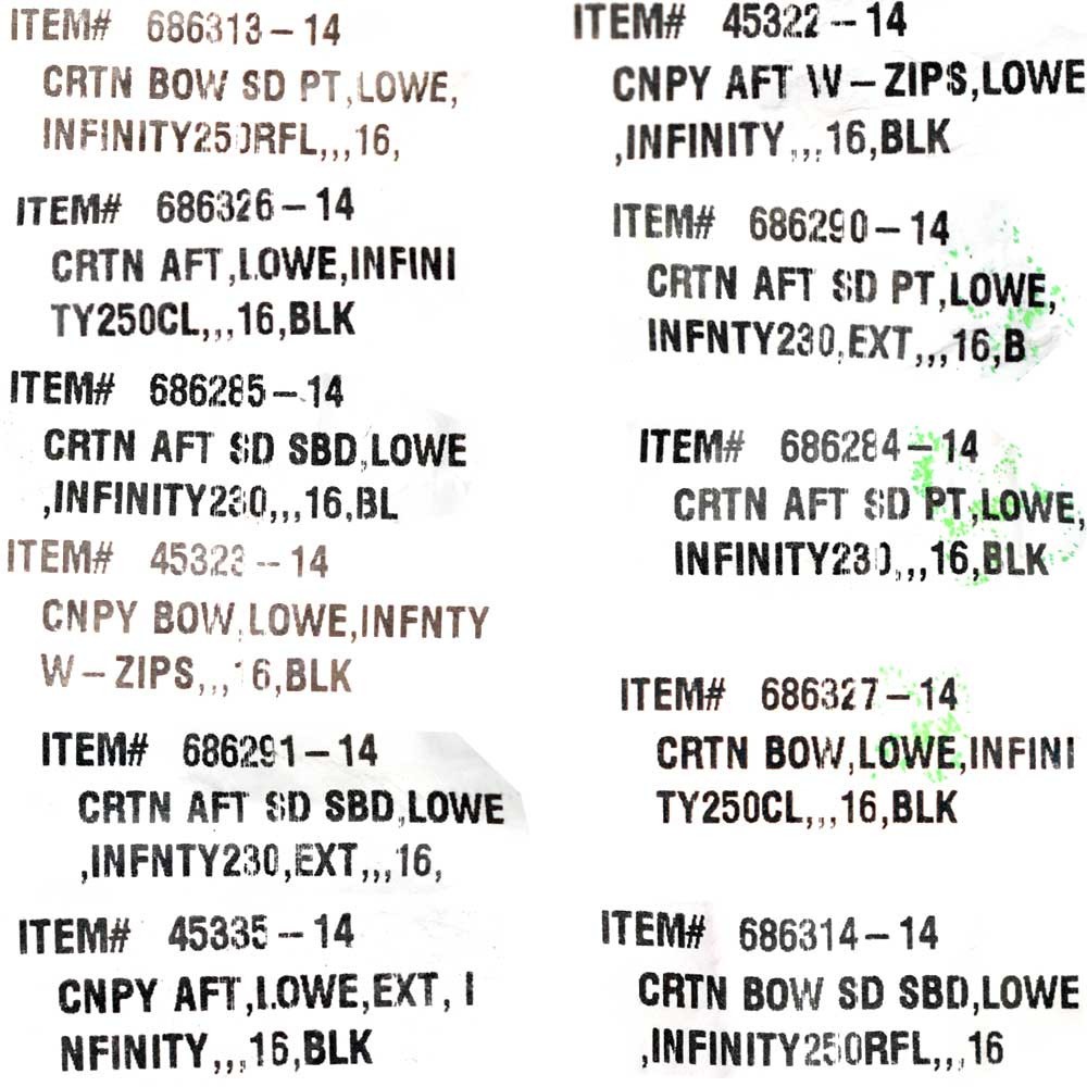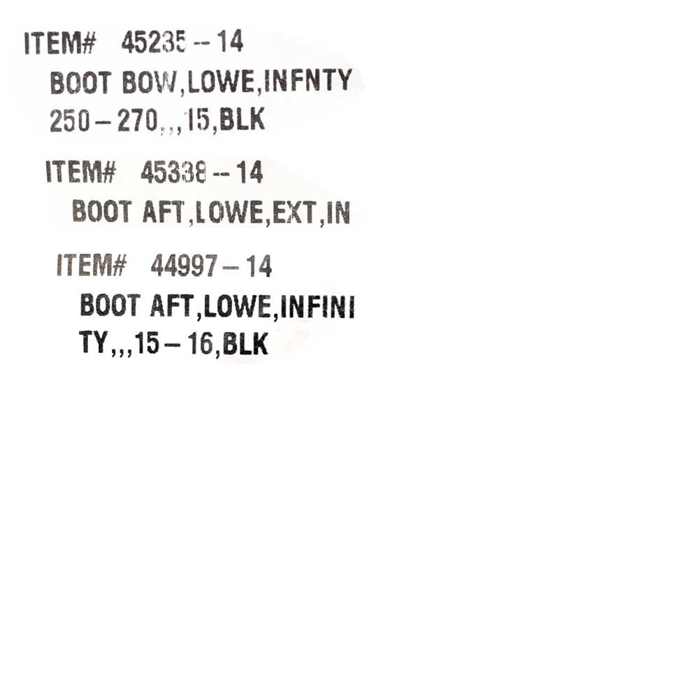 Hard to find original boat parts - Up to 70% off in our eBay store! Lowe Pontoon Boat Enclosure Curtain 2224728 | Infinity 230 / 250 (Kit) We're your port for thousands of hard to find boat parts, original manufacturer's parts and marine surplus. Check out this deal!! Description Boat part number 7801002 is a new pontoon enclosure curtain kit for Infinity 230 / 250 Lowe Boats, part number 2224728 . Manufactured by Dowco Marine, part number unavailable. Kit includes the following: Bow Side Curtain (Port) | P/N: 686313-14 Aft Curtain | P/N: 686326-14 Aft Side Curtain (Starboard) | P/N: 686285-14 Bow Canopy | P/N: 45323-14 Aft Side Curtain (Starboard) | P/N: 686291-14 Aft Canopy Extension | P/N: 45335-14 Aft Canopy | P/N: 45322-14 Aft Side Curtain (Port) | P/N: 686290-14 Aft Side Curtain (Port) | P/N: 686284-14 Bow Curtain | P/N: 686327-14 Bow Side Curtain (Starboard) | P/N: 686314-14 Bow Boot | P/N: 45235-14 Aft Boot Extension | P/N: 45338-14 Aft Boot | P/N: 44997-14 These curtains are constructed out of black ClimaShield Plus fabric. ClimaShield Plus fabric is constructed from 600-denier woven polyester with a triple coating of marine grade formula for moisture resistance, fabric breathability, fade resistance, and water repellency. ClimaShield Plus covers feature Color-Lok solution dyeing with UV resistance, leading to less fading and longer lasting color. Advanced anti-microbial coating gives ClimaShield covers extreme tensile strength, increasing the longevity of the fabric and resistance to tears, stretches, and shrinking. Dowco's Color-Lok process also reduces mold and mildew, keeping your cover fresher longer. Features pre-installed snaps and zippers. Note: May fit other boats; please check with your local boat brand dealer for boat / brand / model / year cross-referencing compatibilities. Specifications: Boat Manufacturer: Lowe Model: Infinity 230 / Infinity 250 Year: 2016 Part Number: 2224728 Part Manufacturer: Dowco Marine Part Number: Unavailable Material: ClimaShield Plus Fabric Color: Black Mounts: Snaps / Zippers Sold as seen in pictures. Customers please note every computer shows colors differently. All measurements are approximate. Hardware and instruction / installation manual not included. GLS Stock Number 7801002--GF957 A Message from Great Lakes Skipper We stand behind our products and maintain great relationships with our customers. If you are having an issue, please contact us with an eBay message first before opening an eBay case and we will make every effort to resolve any concerns. Shipping & Delivery Does this item have a Free Shipping option? Check the shipping tab. If you see a Free Shipping option, we will cover the shipping cost to any physical address located in the lower 48 United States at no extra charge. The physical address you provide must be deliverable by ANY service of our choice. We reserve the right to choose the shipping company, so if you would prefer more control over the shipping feel free to choose a different service. Unfortunately, our free service does not permit shipping to PO Boxes, APO/FPO/DPO addresses, US Territories, Alaska, Hawaii or Puerto Rico. If the description above states that this will be a truckline or freight shipment, this means your item will arrive by a large commercial vehicle and the address you provide MUST be a commercial business with either a loading dock or forklift to remove the item from the truck. If the carrier determines your address is a residence (or a business in a residential neighbourhood), by ordering this item you agree to pay any additional residential delivery, redelivery and/or accesorial surcharges. Please send us a message with any questions regarding freight shipments. International freight shipments will incur additional customs and governmental charges which are the responsibility of the buyer. Buying more than one item? Great Lakes Skipper is happy to combine multiple eBay items into one order. Please send us a message and we will be happy to send you a custom shipping quote for your items. Special note for buyers choosing US Postal Priority Mail International Shipping We currently offer USPS Priority International Mail shipping options to provide our international buyers more shipping choices. However, due to the USPS Mail Services high rates of loss, damage and poor insurance coverage, we are forced to reserve the right to ship higher value items by FedEx so your package(s) may be fully insured. Unfortunately, this may increase your shipping costs. When choosing USPS Priority International Mail as your shipping method, you understand we may reroute the package via FedEx and you agree to pay any additional costs incurred. If you would like to make special shipping arrangements or have any questions, please send us an eBay message before ordering. Visit our eBay store for more great deals! NEED MORE INFORMATION? For technical questions regarding installation, operation, boat compatibility, for this item please contact the part manufacturer or your boat dealer. For questions regarding this purchase, for example, item condition, color, dimensions, shipping costs, payment methods, combined shipping, etc., feel free to send us a message any time!