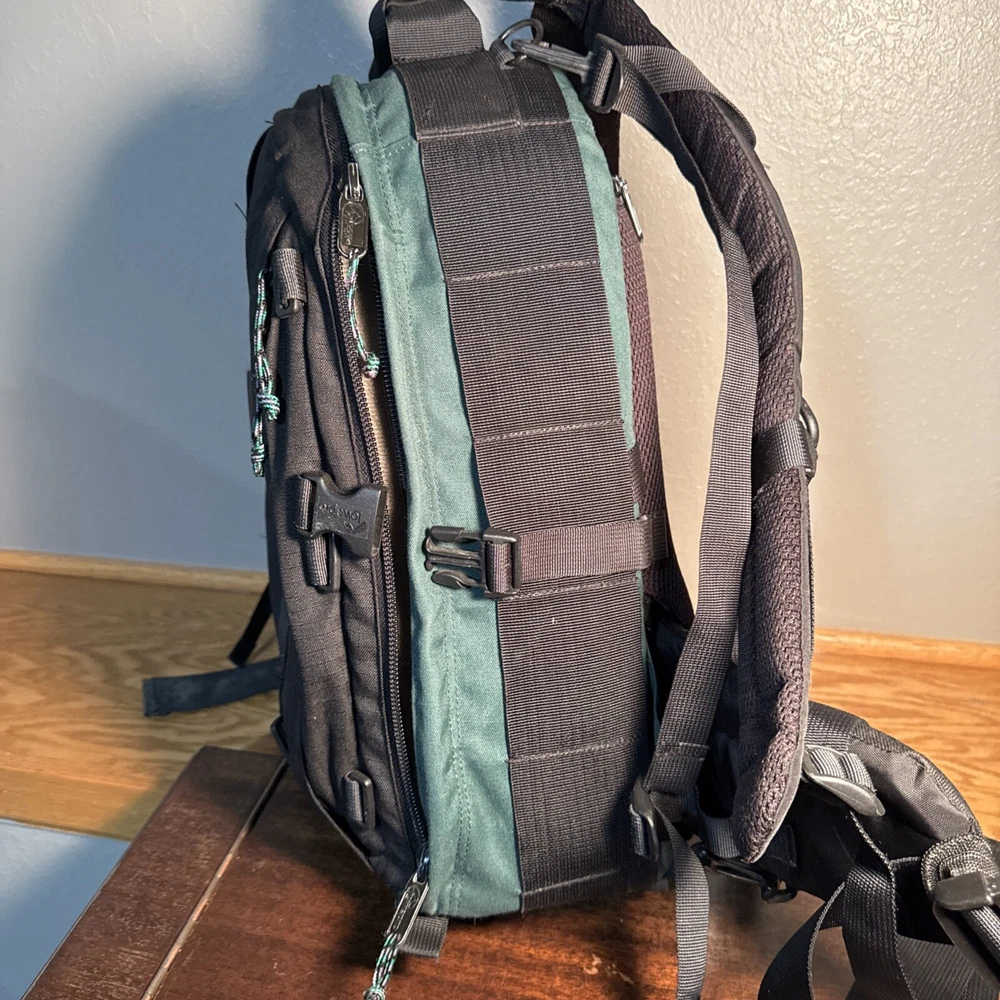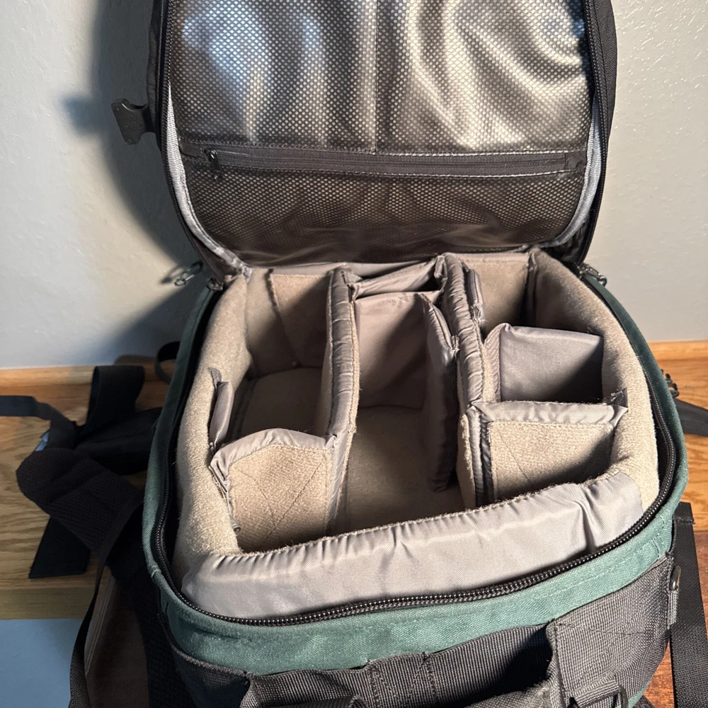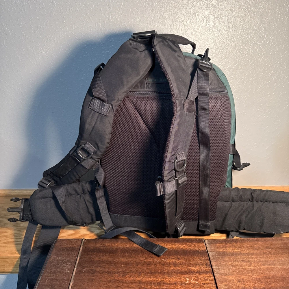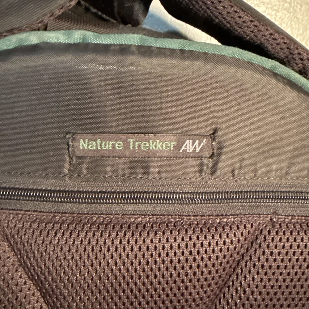 The LowePro Nature Trekker AW is a large camera backpack in black and green nylon. It features accessory compartments for storing a camera, tripod, filters, and lenses. This backpack is designed for photography enthusiasts who need a spacious and protective bag for their camera equipment while on the go.