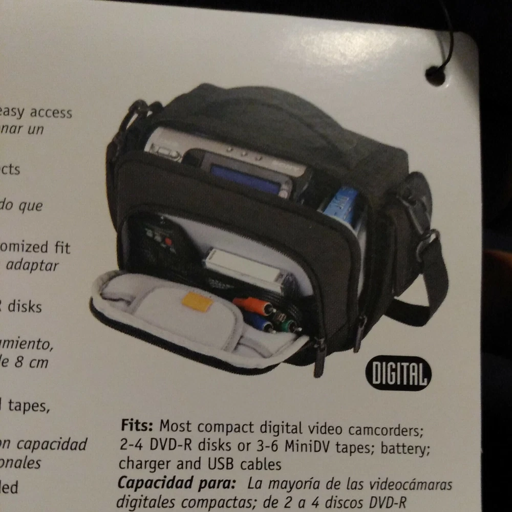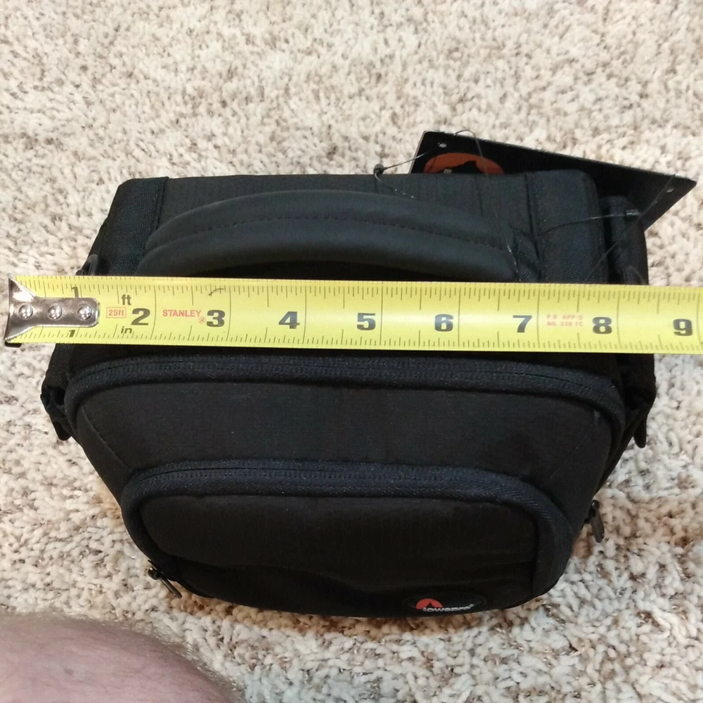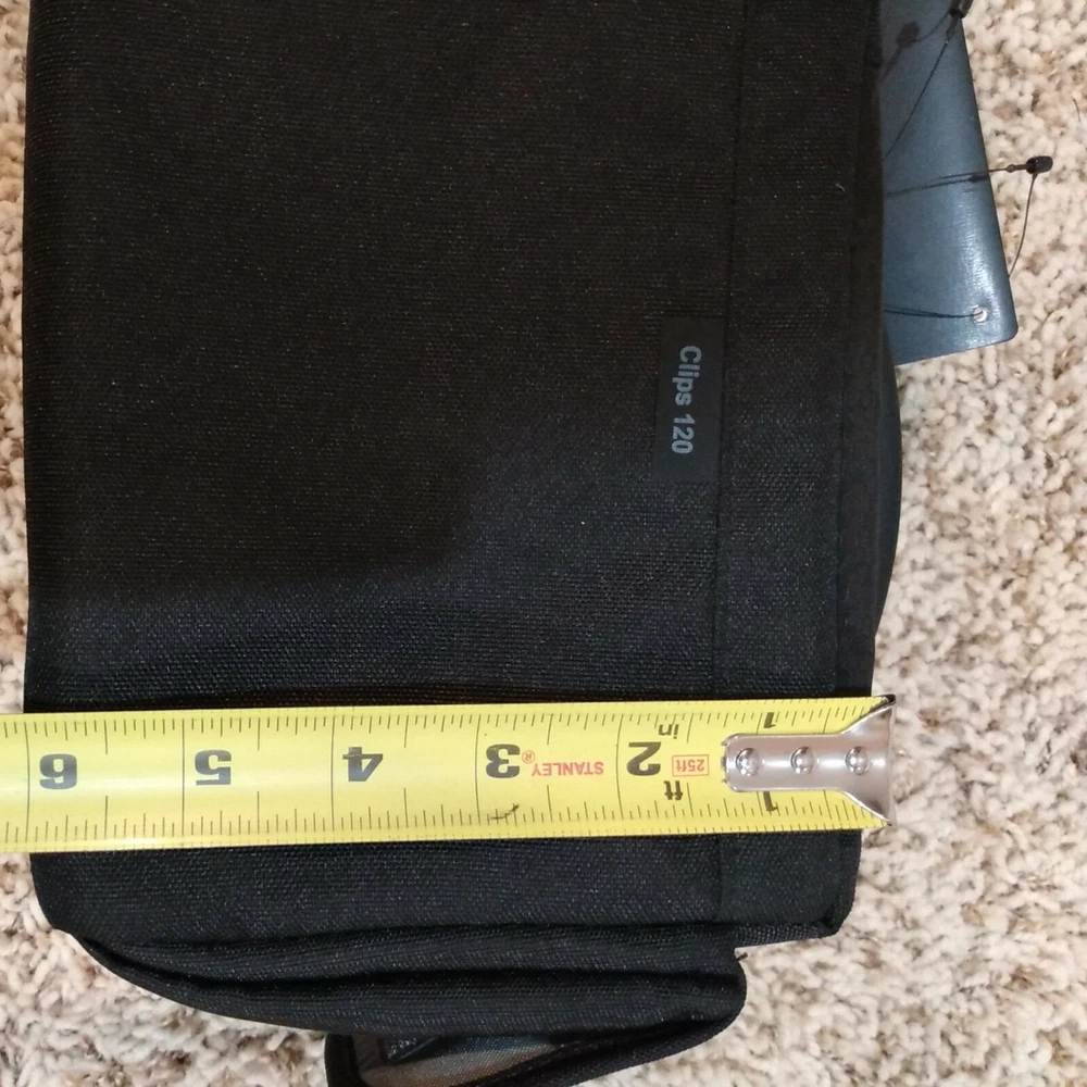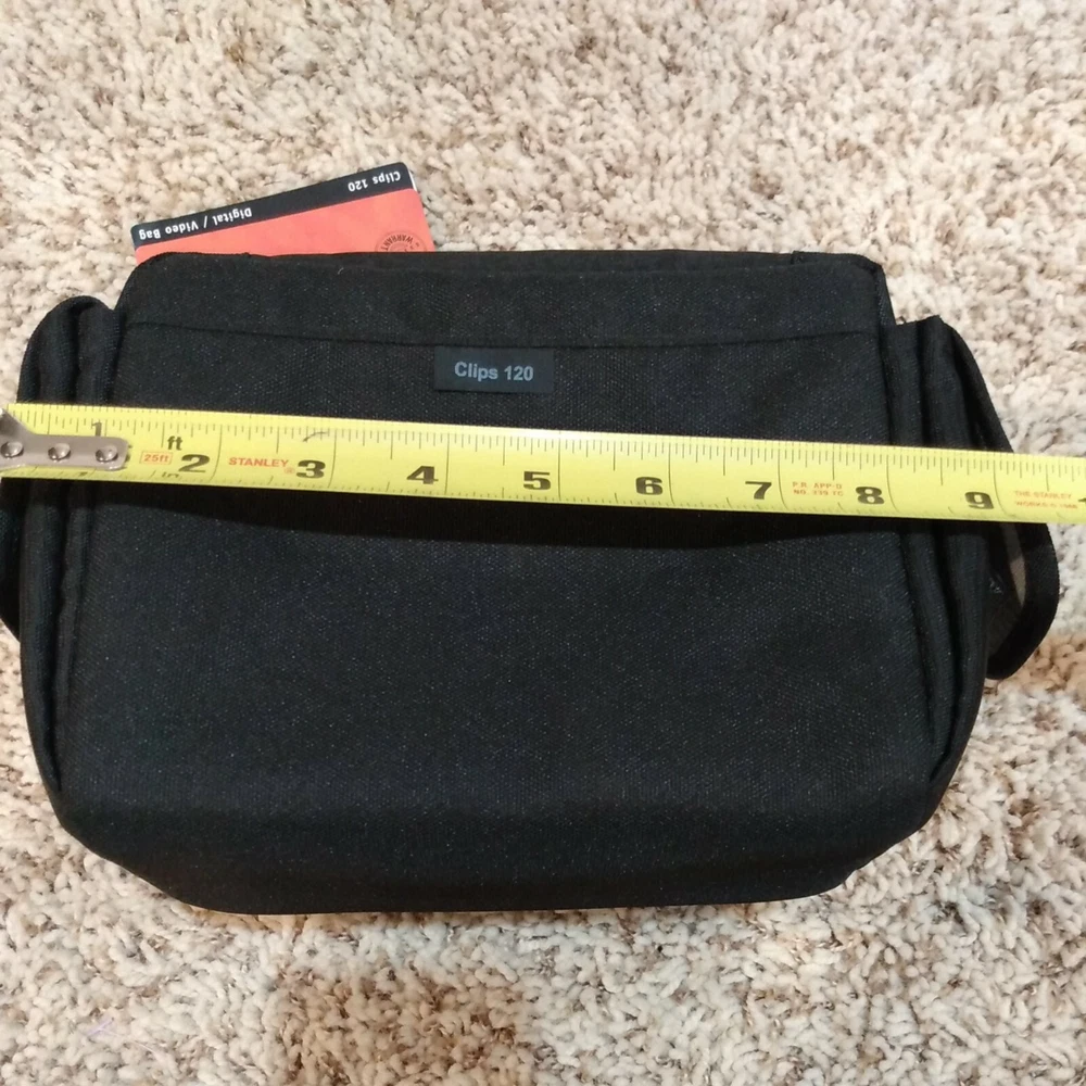 Lowepro Clips 120 Shoulder Bag for Digital Camcorder Black 9"x6"x6". New with tags. Fast, free shipping! * Hinged design provides quick, easy access * Soft, brushed tricot lining protects against dust & scratches * Adjustable divider creates a customized fit. * Media pocket holds 3.5 in DVD-RDL Disks or a mini DV tape. * Easily accessible side pockets hold tapes batteries or personal items * Adjustable shoulder strap and padded handle provide carrying options * Tough water resistant outer fabric protects against moisture