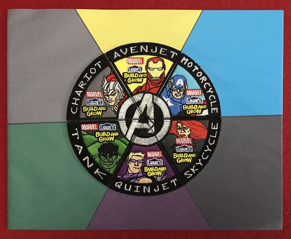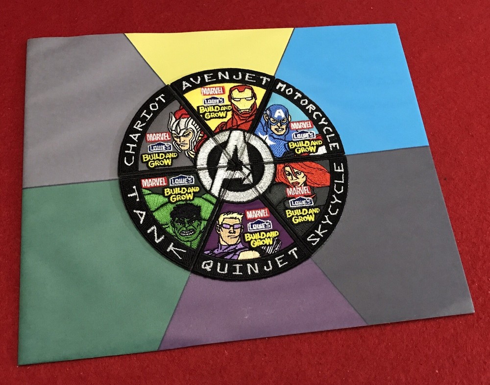 Lowes Build & Grow Marvel Avengers Complete Set Of 6 Iron On Patches Matted Art Full set of 2015 Marvel Build and Grow Badges: Iron Man - Avenjet Captain America - Motorcycle Black Widow - Skycycle Hawkeye - Quinjet Hulk - Tank Thor - Chariot Badges have been attached to boarding with double sided tape, so they can be removed and ironed on to fabric if desired. Otherwise, this has been customized to be a matted 8 x 10 art print, and is ready for framing. 10 x 8 Landscape Orientation Please see pics for details and overall condition. Thanks for looking and supporting our small business. We are blessed to be working from home, with the best coworkers we could ever ask for, each other! ❤️With love and blessings, (-: Dee & Chi :-)