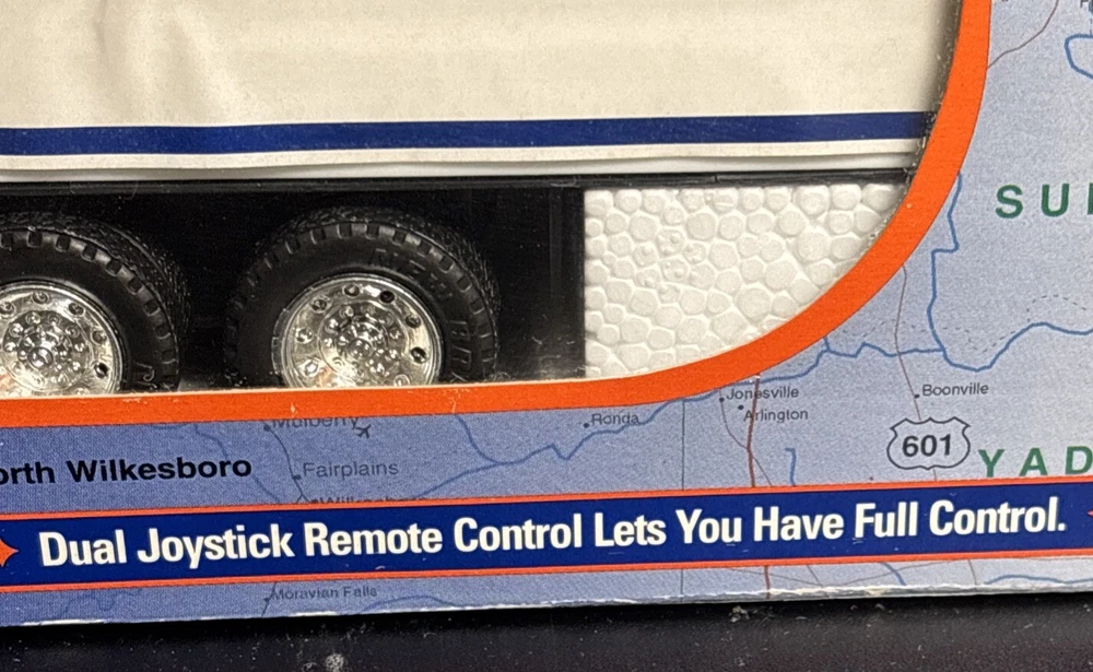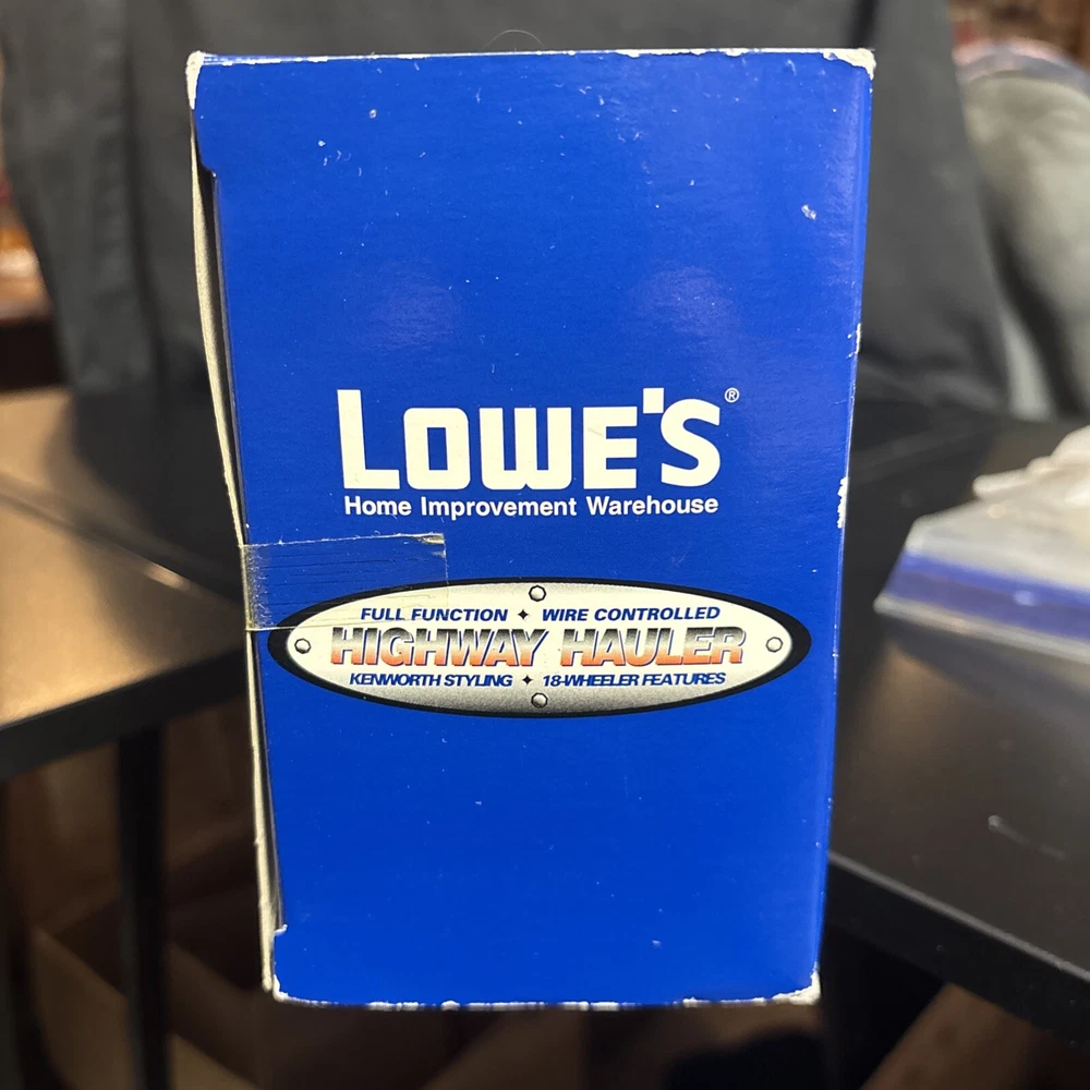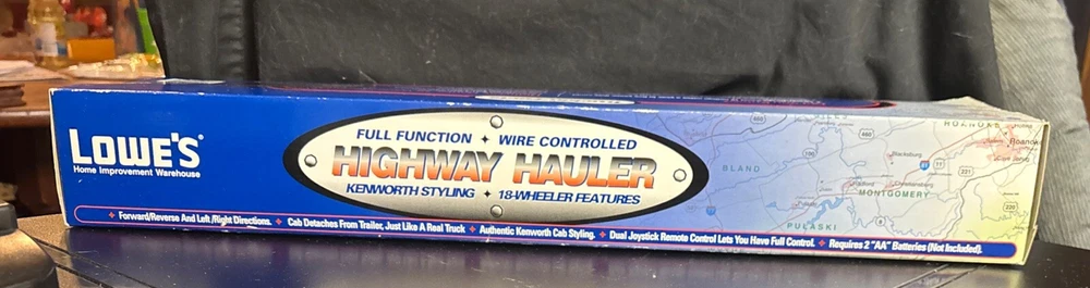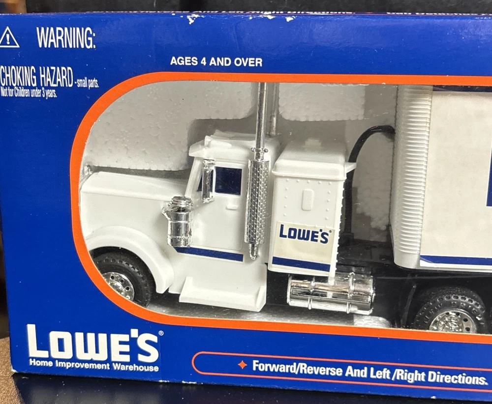 Lowe's KNOWS Stores Remote Control Toy Truck 18 WHEELER SEALED 23”x6”x4, box is still sealed ,BATTERIES NOT INCLUDED NEEDS 2 AA BATTERIES, box has some bending on corners plastic and semi truck and trailer in good shape, tape is still on sides sealing the item in. (SEE PICS) USPS GROUND ADVANTAGE, PAYPAL AND MONEY ORDER ACCEPTED, item will be shipped in a box, and bubble wrapped, also will send pics as I packed, tried to show instructions best I can as well in pics.