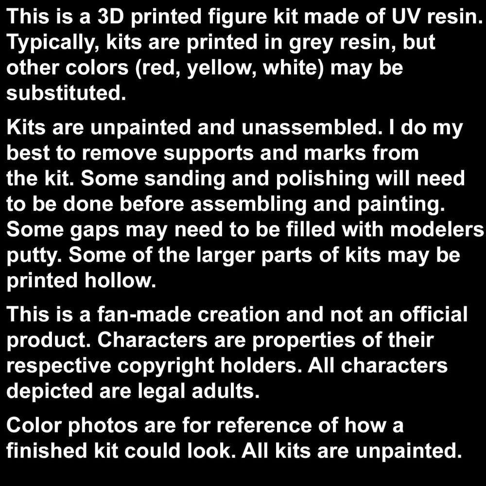This is an unpainted, unassembled kit draws from the studio of Torrida. The kit has a choice of sizes 225mm 1/8 scale. Polar Lights Monster Kits scale. 180mm 1/10 scale. Common scale for RC cars 150mm 1/12 scale. Dollhouse scale. 100mm 1/18 scale. Action figures like GI Joe or Star Wars. 75mm 1/24 scale. Typical scale of model cars or other 1/24 scale kits. Everything is made and shipped from the United States. Thank you for supporting a veteran-owned studio. This is a 3D printed figure kit made of UV resin. Typically, kits are printed in grey resin, but other colors (red, yellow, white) may be substituted. Kits are unpainted and unassembled. I do my best to remove supports and marks from the kit. Some sanding and polishing will need to be done before assembling and painting. Some gaps may need to be filled with modelers putty. Some of the larger parts of kits may be printed hollow. Note: This is a fan-made creation and not an official product. Characters are properties of their respective copyright holders. All characters depicted are adults. Color photos are for reference of how a finished kits could look. All kits are unpainted.