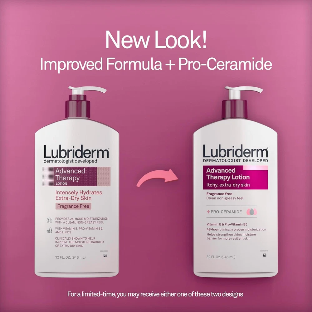 32-fluid ounce bottle of Lubriderm Advanced Therapy Fragrance-Free Daily Moisturizing Lotion+ Pro-Ceramidewith Vitamin E and Pro-Vitamin B5 itchy, extra-dry skinto help strengthen skin’s moisture barrier Specially designedunscented lotion intensely hydratesitchy, extra-dry skin. The soothing formula of the body lotion with Pro-Ceramide penetrates within skin's surface to deliver 48-hour clinically proven moisturization Body lotion is formulated with vitamins E and Pro-Vitamin B5which moisturizes to help strengthen skin's moisture barrier. The non-greasy lotion transforms itchy, extra-dry skin into healthier looking, more resilient skin Clinically- and dermatologist-tested lotion is hypoallergenic and fragrance free. The daily hand and body moisturizer suitable for sensitive skin is formulated free of parabens, phthalates and dyes Lubriderm, a dermatologist developed, advanced therapy lotion absorbs quickly and leaves a clean, non-greasy feel. To use, smooth on hands and body daily or as directed by a physician Lubriderm Advanced Therapy Fragrance-Free Daily Moisturizing Lotion + Pro-Ceramide intensely hydrates and helps relieve itchy, extra-dry skin. From a dermatologist-developed brand, this fragrance-free moisturizing lotion provides 48-hour clinically proven hydration and helps strengthen skin's moisture barrier for more resilient skin. The soothing formula of this non-greasy lotion is suitable for sensitive skin and contains Pro-Vitamin B5 and Vitamin E to moisturize and transform itchy, dry skin into healthier-looking skin. The fast-absorbing formula of this hypoallergenic body lotion has been clinically, and dermatologist tested and is free of parabens, phthalates and dyes. To use, smooth on hands and body daily or as directed. Advanced Therapy Lotion + Pro-Ceramide for extra-dry skin from Lubriderm, a dermatologist developed brand.