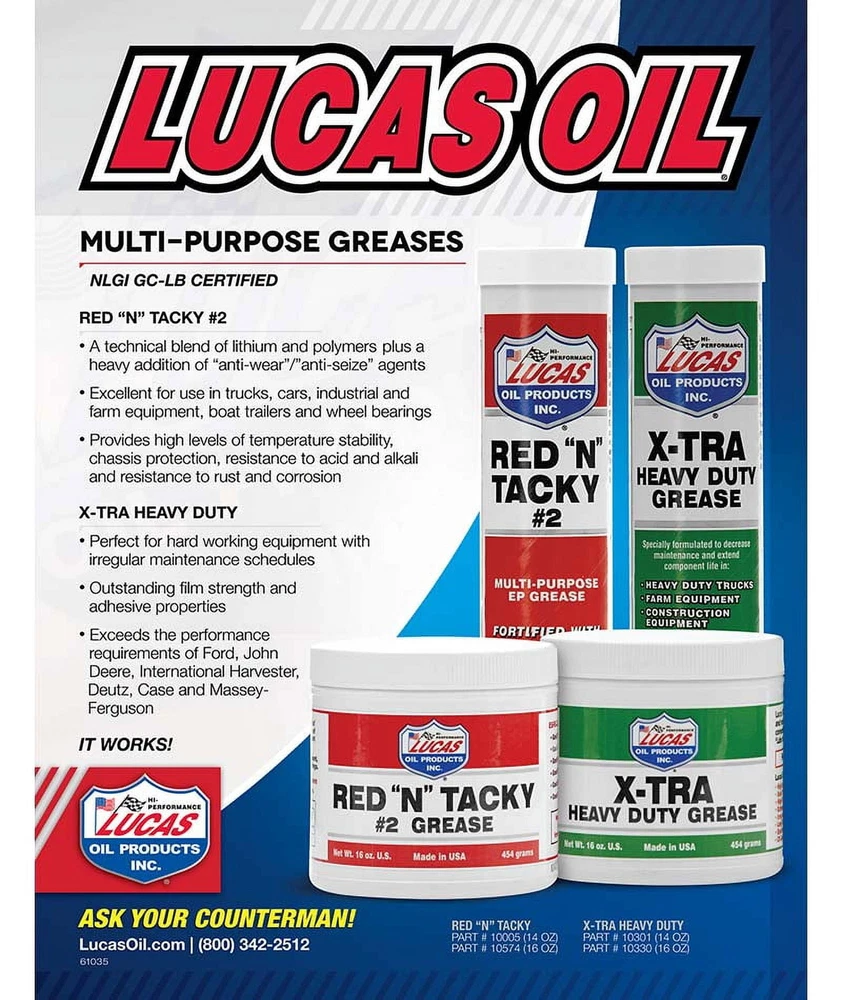 Lucas X-Tra Heavy Duty Grease is a shear stable NLGI-2 product with exceptional extreme pressure characteristics and excellent water washout resistance. It's a Polyurea based grease and lasts up to three times longer than ordinary grease and is excellent for high speed bearings. Virtually wash-out proof. Stands up to high temperatures and stays soft in very low temperatures. EP fortified and exceeds OEM specifications. Lucas X-TRA Heavy Duty Grease was formulated for automotive, agricultural, heavy-duty and industrial applications. It is virtually waterproof and is more stable than all conventional lithium grease. It is fortified with an extreme pressure additive package and it exceeds OEM Lube for Life specifications. Lucas Oil 10301 Xtra Heavy-Duty Grease Lasts four times longer than regular grease All temperature stable Exceeds Lube for Life specifications The ultimate grease for high speed bearings Virtually waterproof