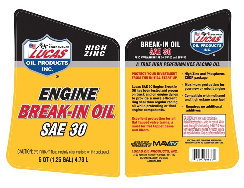 Lucas Oil 10631 SAE 30 High Zinc Engine Break-In Oils - 5 Qt (Qty 1) Part # 10631 Lucas Oil Key Benefits Quicker more efficient ring seal Higher levels of zinc and phosphorus maximum protection A must use for flat tappet camshaft break-in Less blow-by equates more power and better ring seal Requires no moly supplement and no additional additives Compatible with methanol and high octane race fuel Recommend use on initial break-in of both flat tappet and roller camshaft applications for maximum protection and performance Excellent on track performance prior to switching engine over to the racing only line conventional or synthetic Lucas Oil Specs Oil Type: Mineral Engine Oil Weight: 30 Break-In Oil: Yes ZDDP Enhanced: Yes Oil Volume: 5 quarts The initial start up of a new engine is critical to its performance and life expectancy. How well and how fast the rings will seal could make the difference between winning and losing. Compatible with Ethanol, Methanol and high octane race gas.