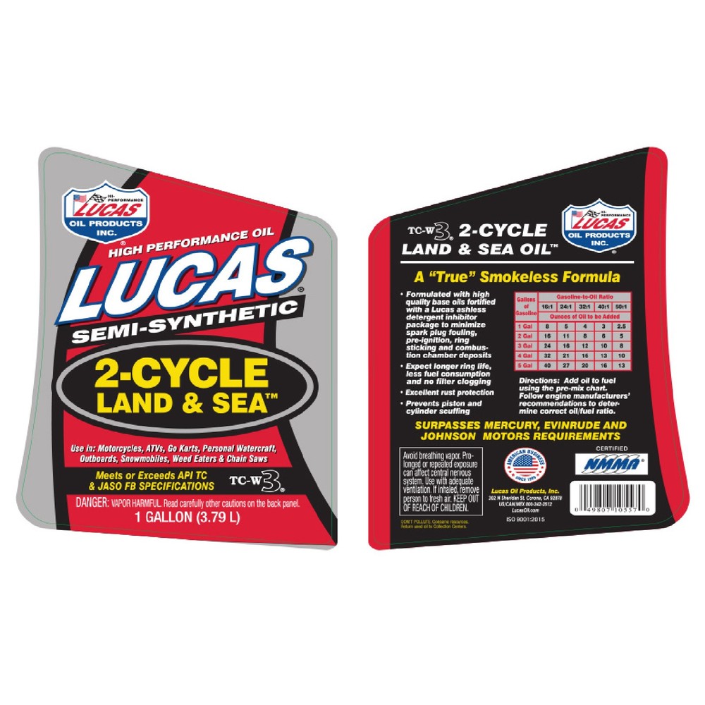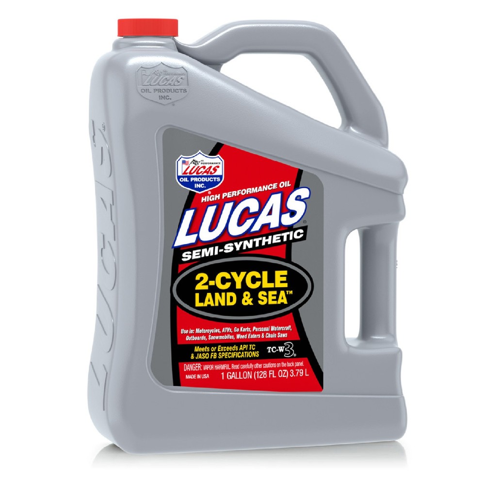 $ImageURL1$ Lucas Oil TC-W3 2-Cycle Land & Sea Oil Semi-Synthetic 1 Gallon Bottle Pair 10557 PART NUMBER: 10557 BRAND: Lucas Oil DESCRIPTION Semi-Synthetic 2-Cycle Land & Sea Oil Lucas High Performance Semi-Synthetic 2-Cycle Land & Sea Oil TC-W3 has been specifically developed for Motorcycles, ATVs, Go Karts, Personal Watercraft, Outboards, Snowmobiles, Weed Eaters and Chain Saws. Mix ratio is 50:1. A "TRUE" Smokeless Formula, Lucas 2-Cycle Land & Sea Oil TC-W3 is specially formulated with high quality base oils fortified with a Lucas ashless detergent inhibitor package to minimize spark plug fouling, pre-ignition, ring sticking and combustion chamber deposits. For more specific information on each racing oil please review our product specification sheets. Key Benefits: Surpasses Mercury, Evinrude and Johnson Motors requirements Expect longer ring life, less fuel consumption and no filter clogging Excellent rust protection Prevents piston and cylinder scuffing Meets or exceeds industry performance requirements Applications: 2-Stroke Outboards 2-Stroke Personal Water Craft Specifications: Quantity: Set of 2 Size: 1 Gallon