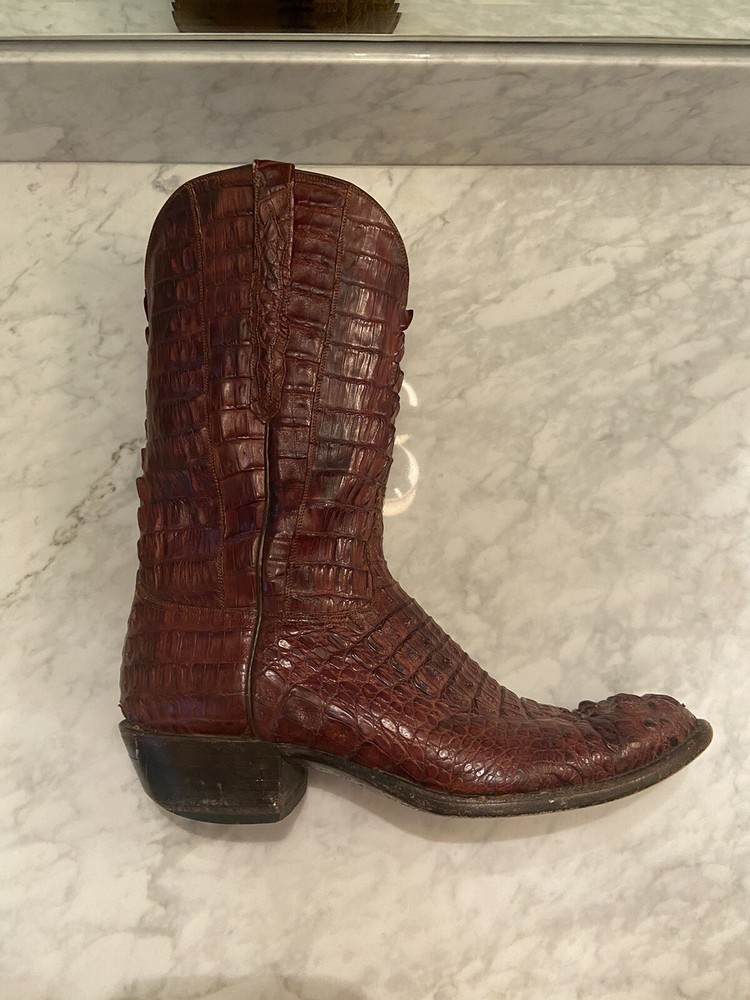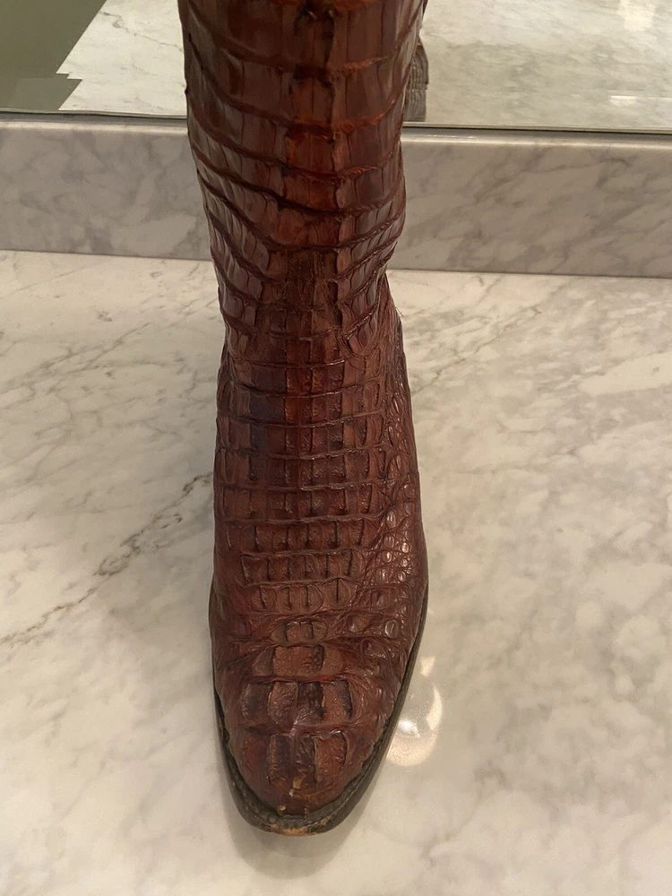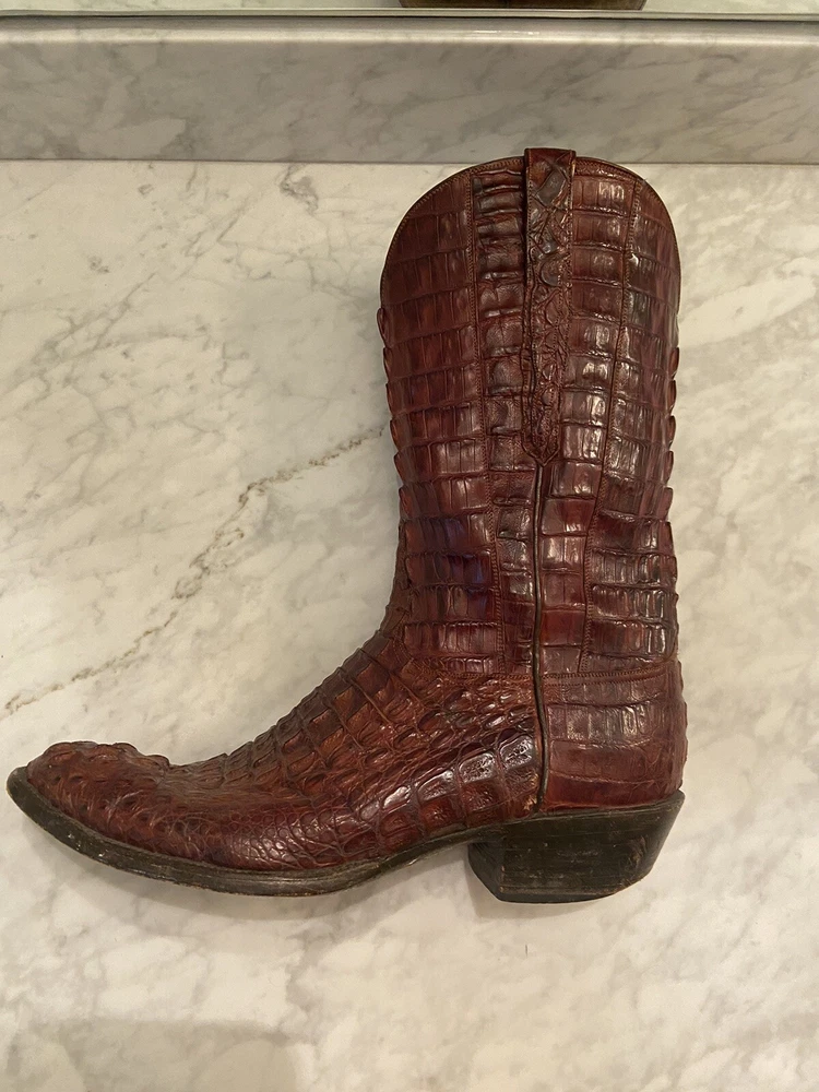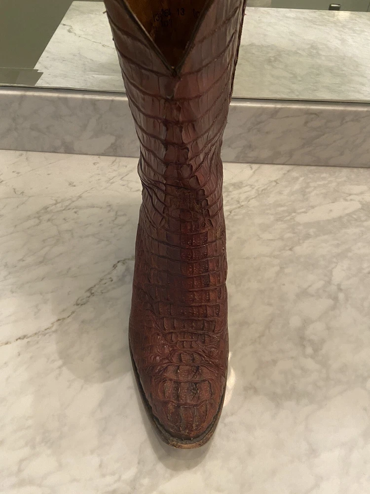 These full Aligator Lucchese boots in size 13 for men are a stylish addition to any wadrobe. The brown color of the boots complements any outfit, and the durable construction ensures long-lasting wear. These boots are perfect for any man who wants to make a statement with his footwear. Get your hands on these Lucchese boots today and step out in style! Lucchese boots are top quality and do complimentary repairs on boots when sent to their main office. Be able to take advantage of my mistake and buy these boots for a steal! Originally bought for 15k, comes with boot covers but no original box (my wife threw it out haha)