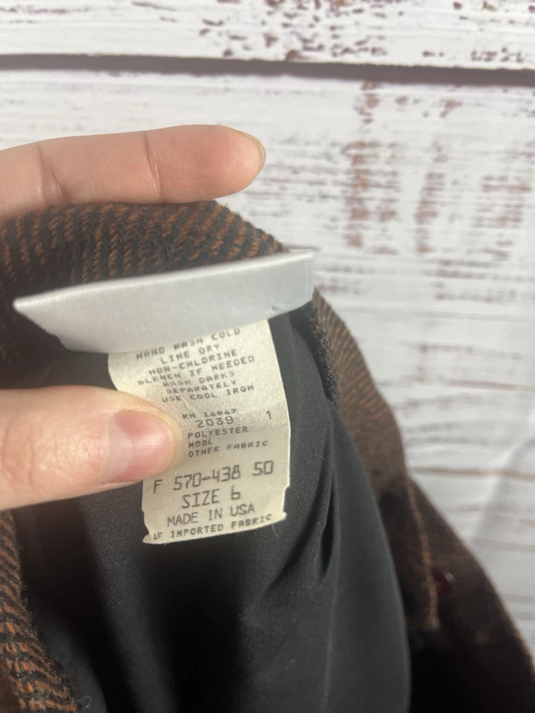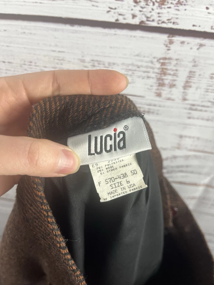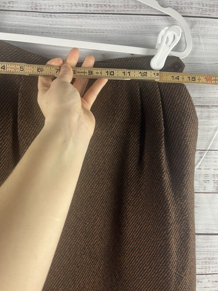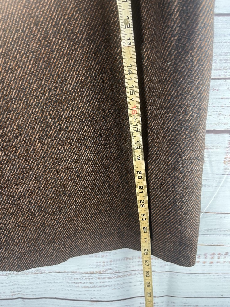 This Lucia Midi Skirt is designed for women in a size 6 with a classic preppy style. The skirt features a brown plaid pattern with a wool blend material, providing warmth and durability. With a knee-length and mid-rise design, it offers a comfortable fit for everyday wear. The exterior color combination of brown and black gives it a versatile look that can easily be paired with different tops and shoes. Perfect for adding a touch of sophistication to any outfit.