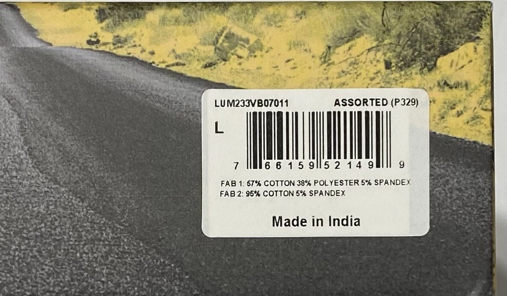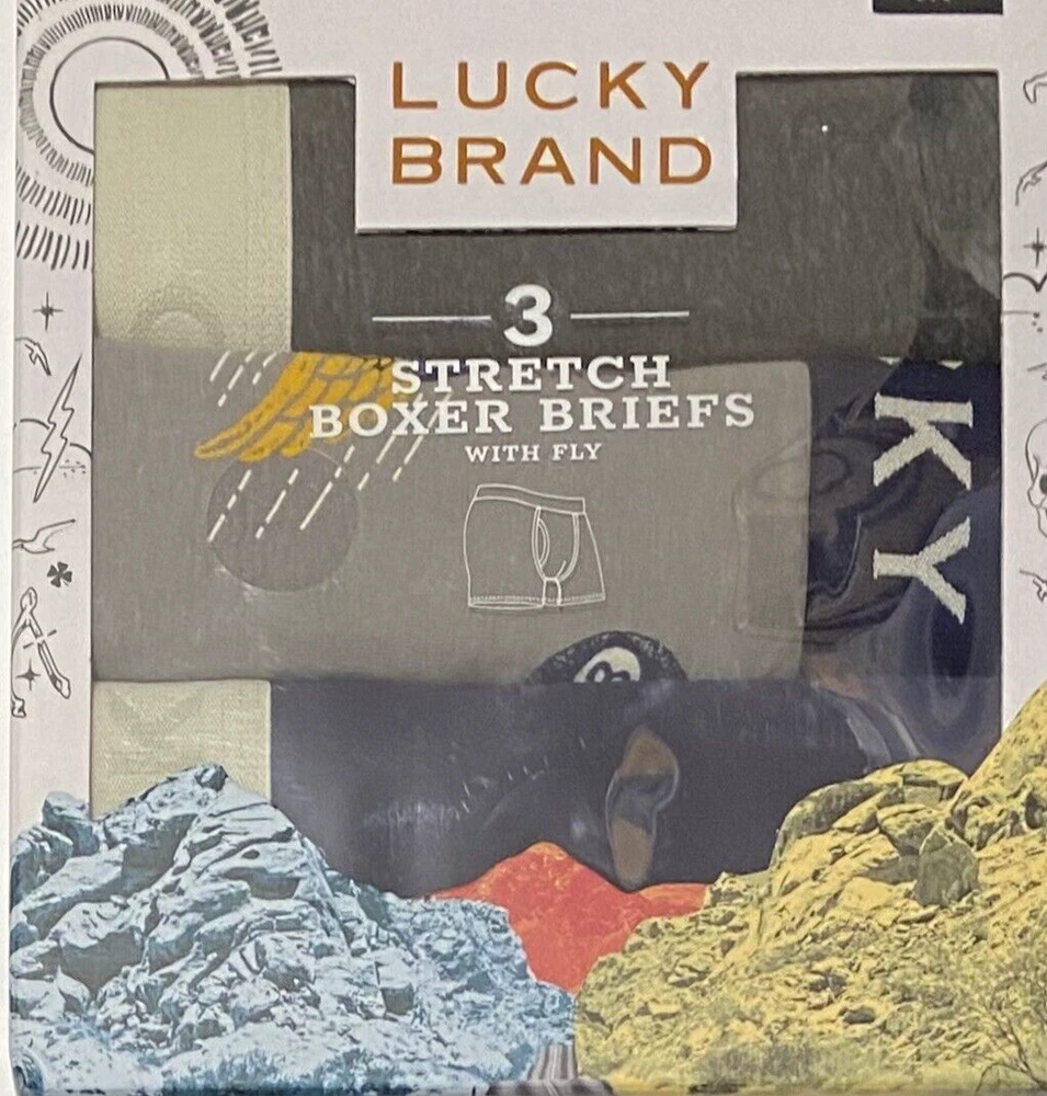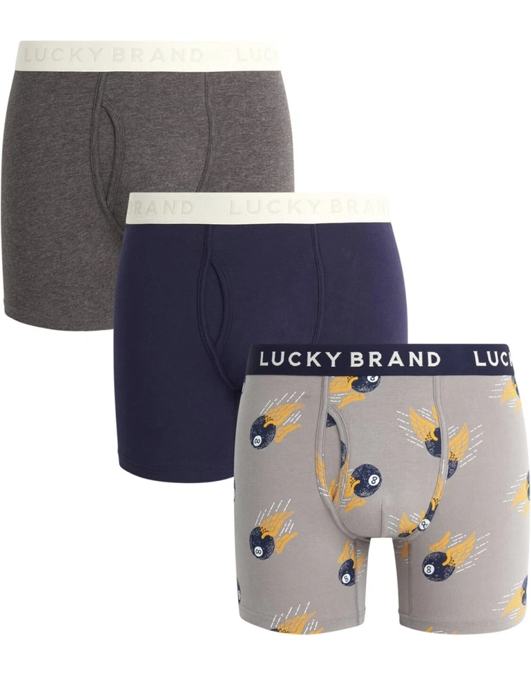 Lucky Brand Box Of 3 Always Wear The Clover 3- Stretch Boxer Briefs With Fly 1- Navy 1-Gray Print 1-Dark Heather Gray 95% Cotton/5% Spandex Heather Gray - 57% Cotton/38% Polyester/5% Spandex Large (36-38) Ne w In Box
