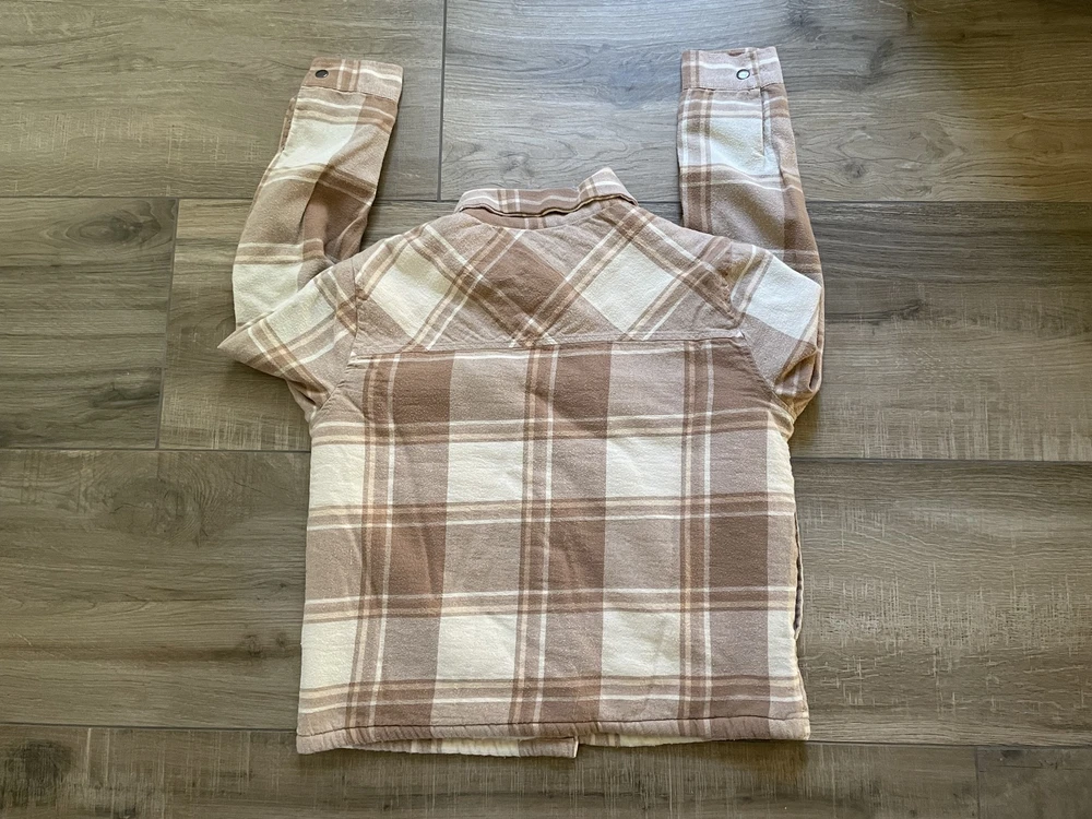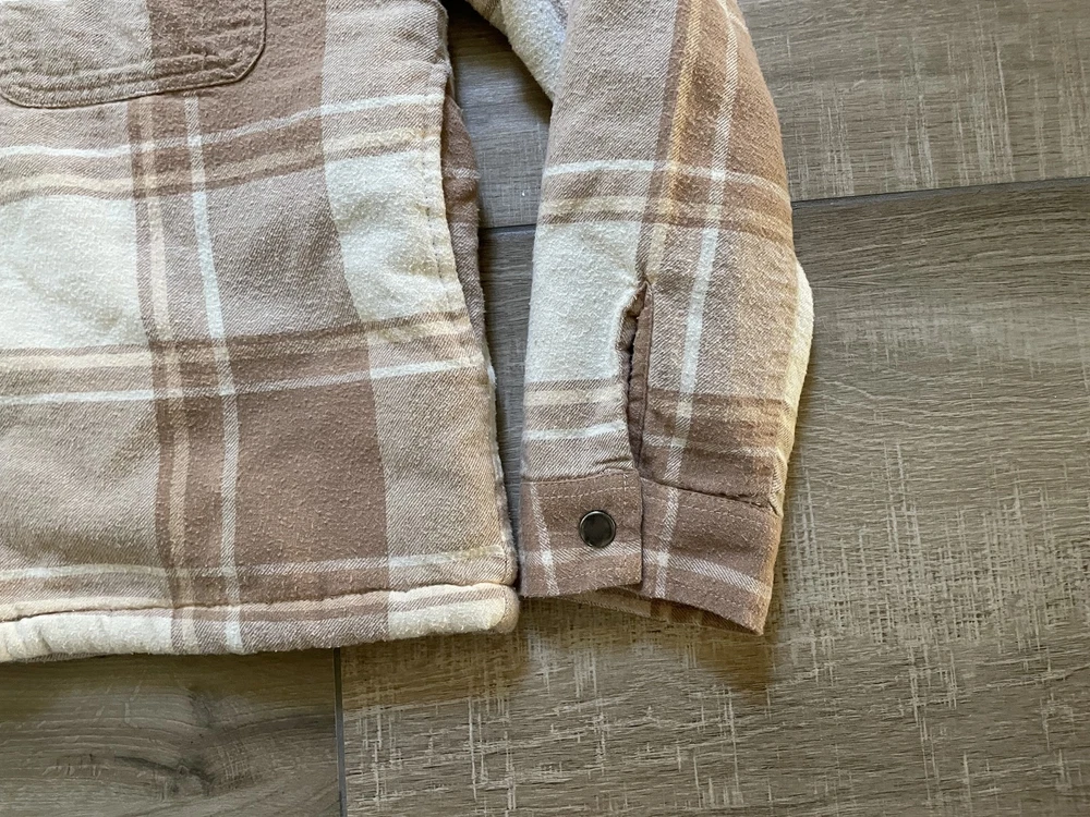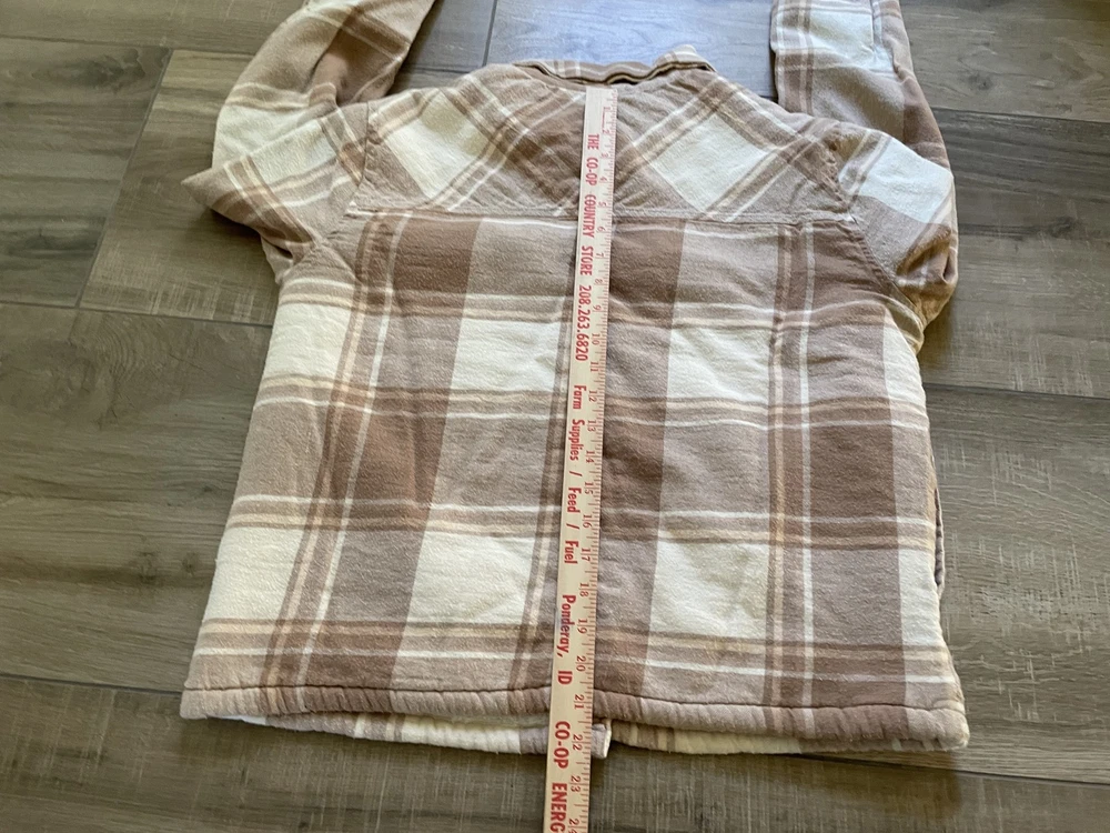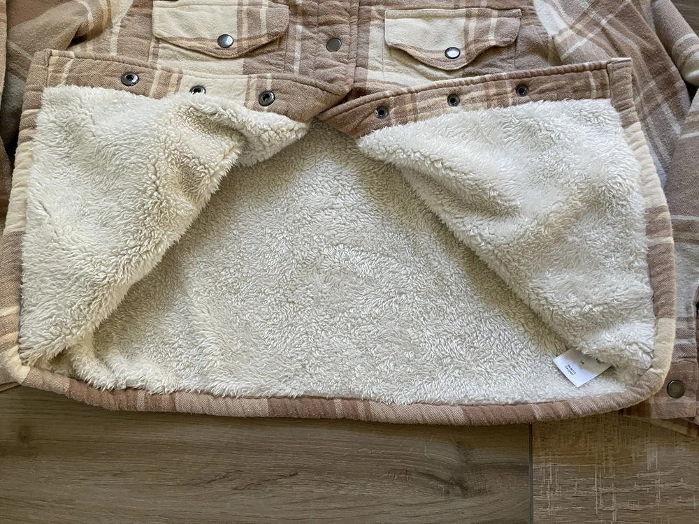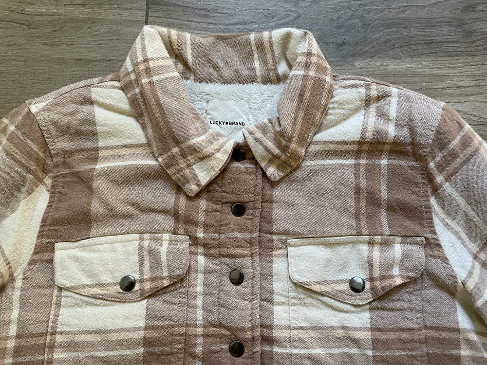 Lucky Brand Jacket Mens Large Brown Beige Plaid Sherpa Lined Flannel Western Snap Condition: Good pre-owned condition—light overall wear, no major flaws, one small tear at underarm seam (see photo) 100% cotton exterior with plush sherpa lining for added warmth Classic western-inspired plaid in shades of brown and beige Snap button front closure with two snap chest pockets and snap cuffs Brand: Lucky Brand (Lucky☆Brand tag inside collar) Style: Flannel trucker jacket, shirt jacket (shacket) Size: Large (L on tag) Material (shell): 100% Cotton, Lining: 100% Polyester (see tag image) Made in India Approximate pit to pit measurement: 21 inches Approximate length (collar seam to hem): 21 inches Sherpa fleece lining throughout body and collar for comfort Two flap chest pockets with snap closure Great casual outerwear layer for fall and winter Check photos for measurements, details, and flaw at underarm seam