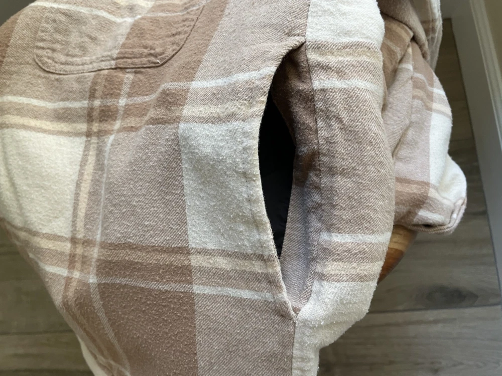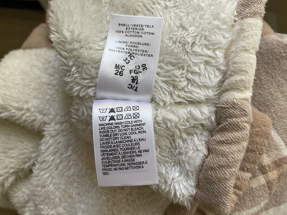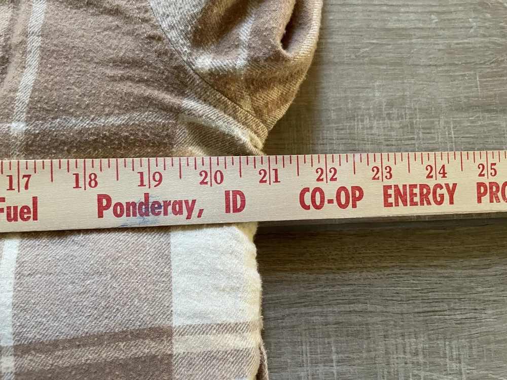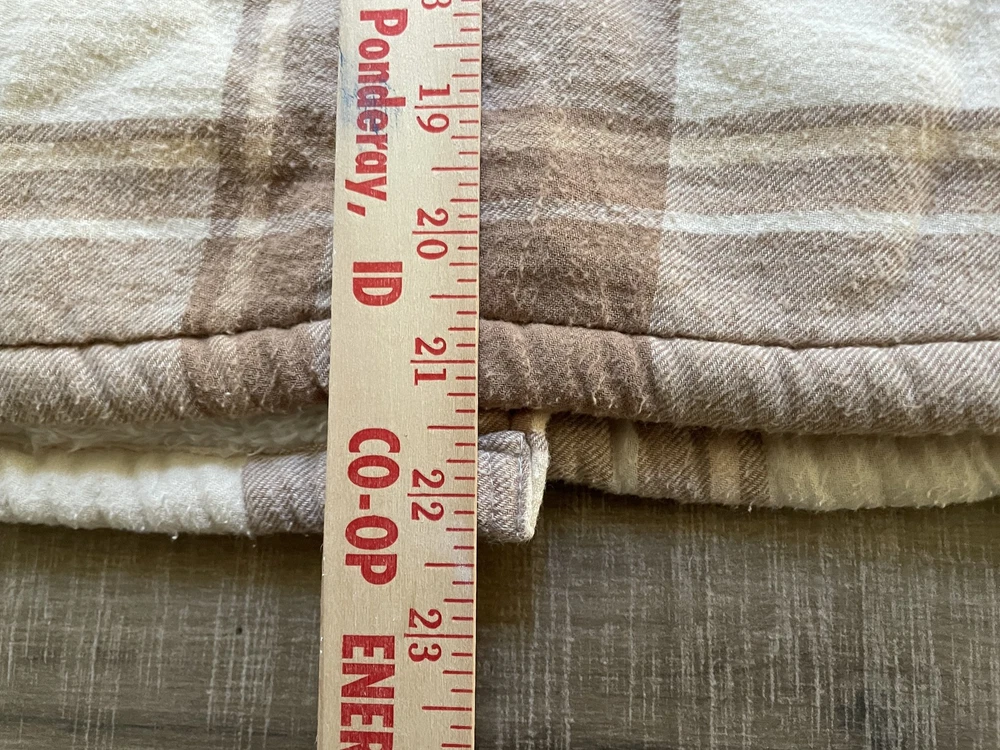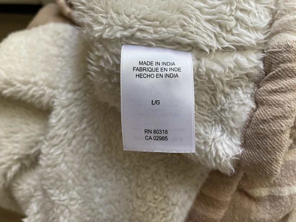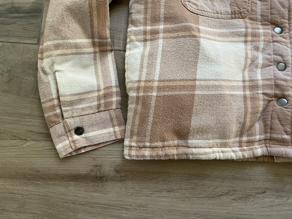 Lucky Brand Jacket Mens Large Brown Beige Plaid Sherpa Lined Flannel Western Snap Condition: Good pre-owned condition—light overall wear, no major flaws, one small tear at underarm seam (see photo) 100% cotton exterior with plush sherpa lining for added warmth Classic western-inspired plaid in shades of brown and beige Snap button front closure with two snap chest pockets and snap cuffs Brand: Lucky Brand (Lucky☆Brand tag inside collar) Style: Flannel trucker jacket, shirt jacket (shacket) Size: Large (L on tag) Material (shell): 100% Cotton, Lining: 100% Polyester (see tag image) Made in India Approximate pit to pit measurement: 21 inches Approximate length (collar seam to hem): 21 inches Sherpa fleece lining throughout body and collar for comfort Two flap chest pockets with snap closure Great casual outerwear layer for fall and winter Check photos for measurements, details, and flaw at underarm seam